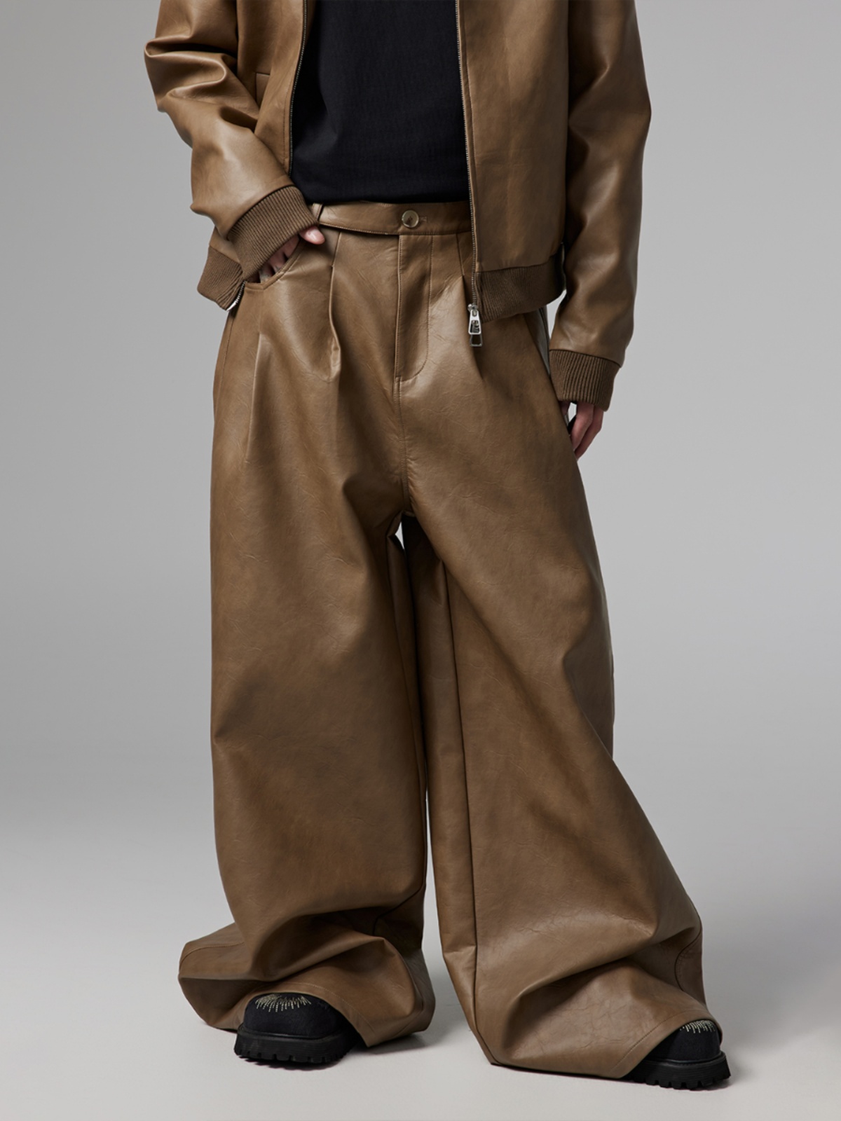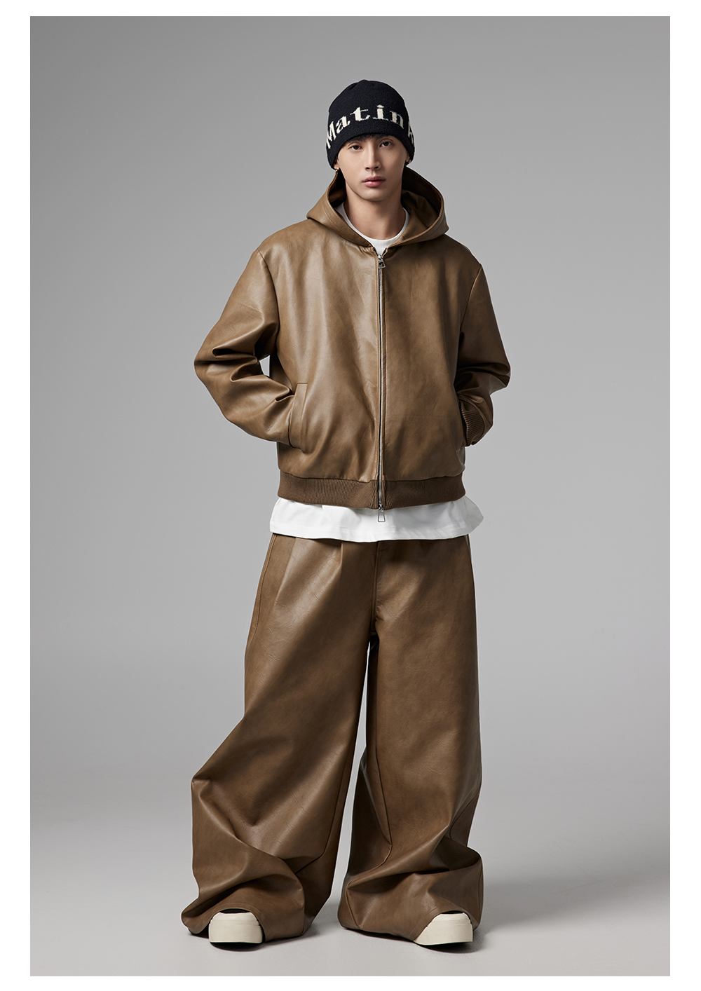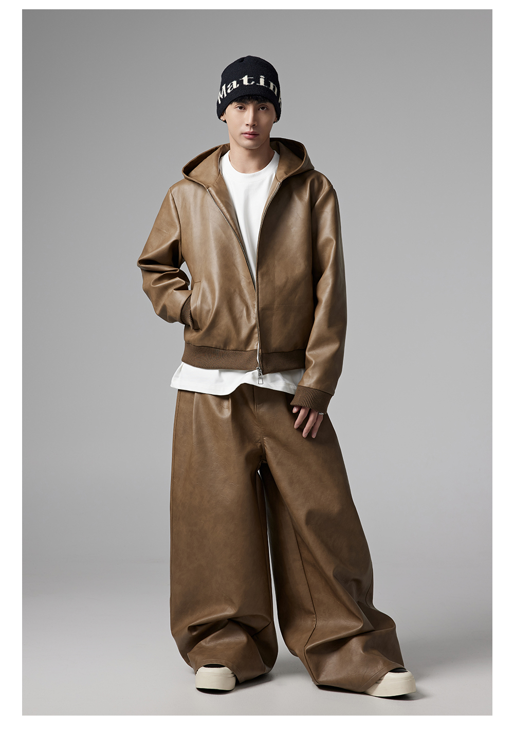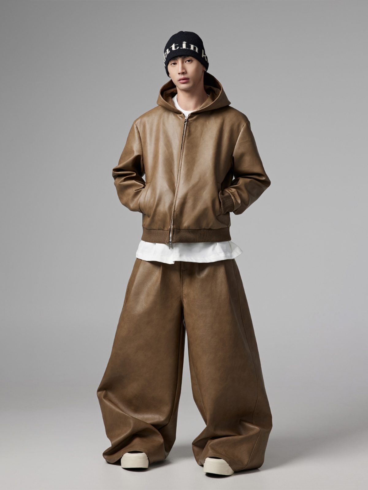 Short PU Leather Hooded Jacket & Wide-Leg PU Leather Pants Setup WN13341