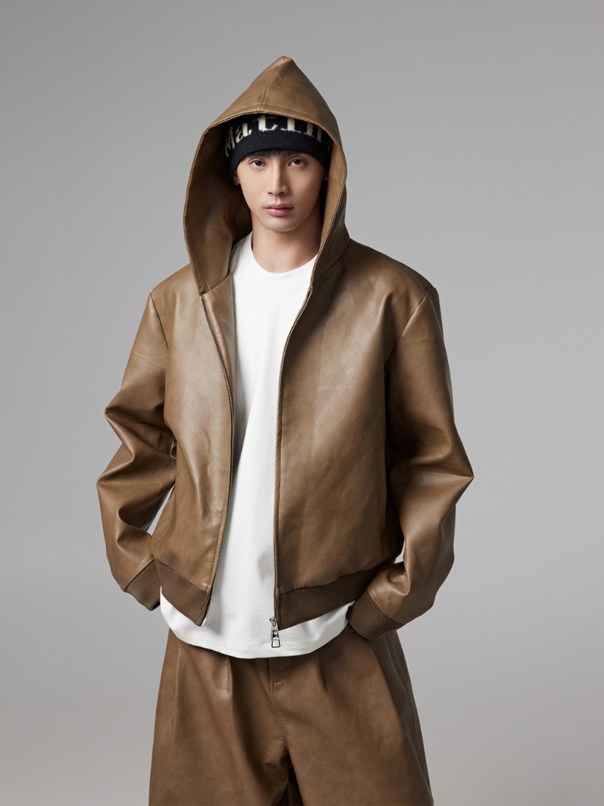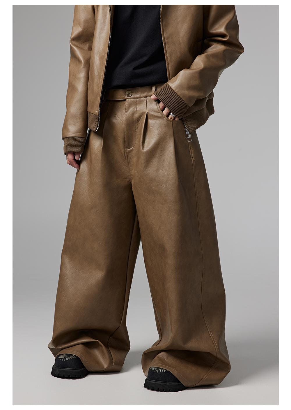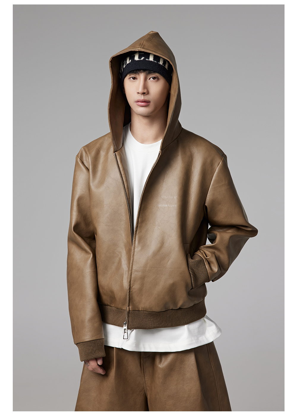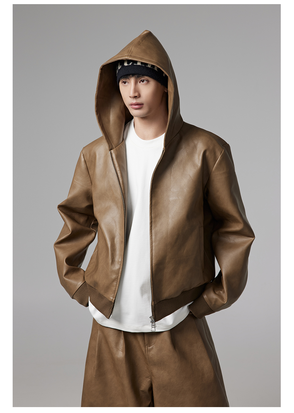 Short PU Leather Hooded Jacket & Wide-Leg PU Leather Pants Setup WN13341