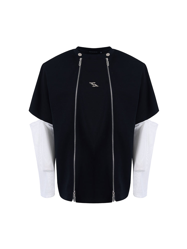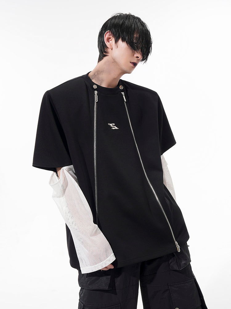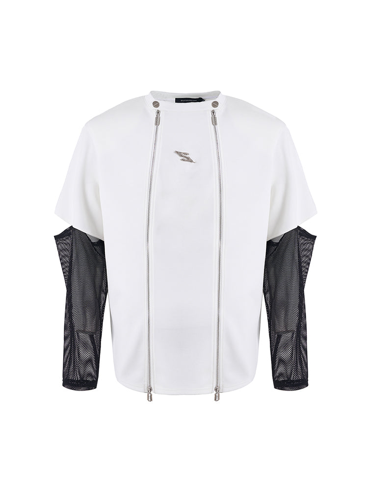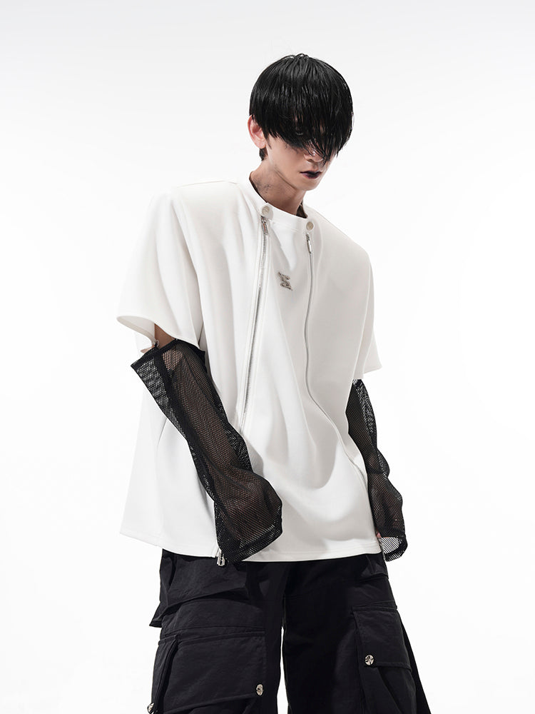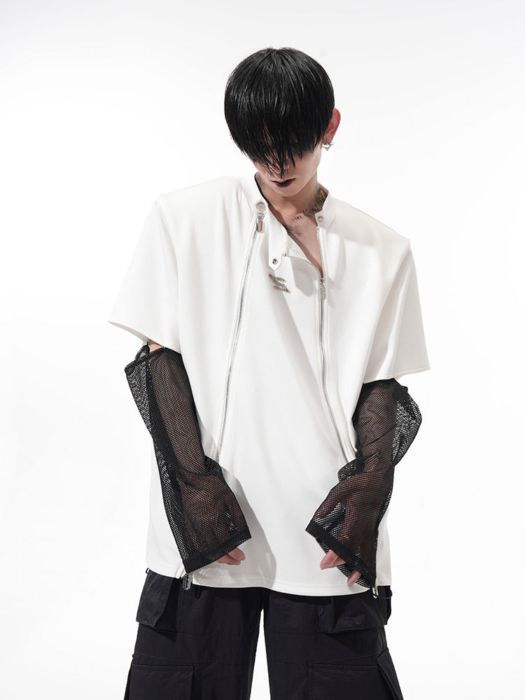 Mesh Sleeve Patchwork Zipper Short Sleeve T-Shirt WN14897