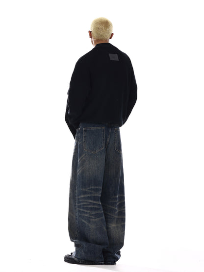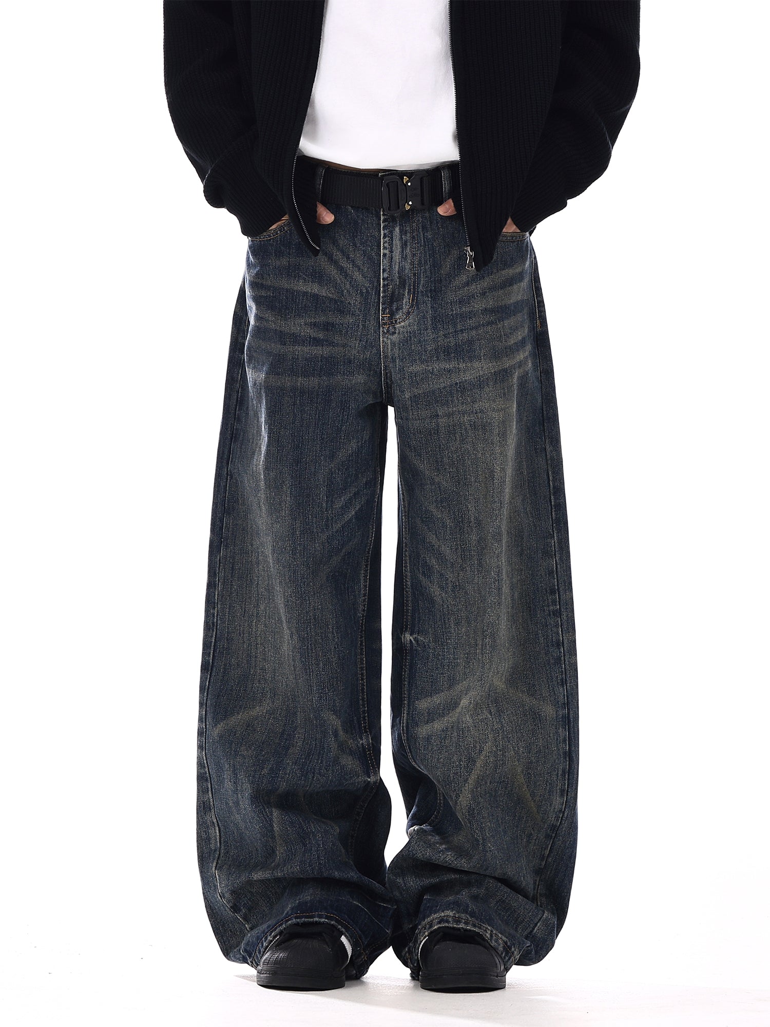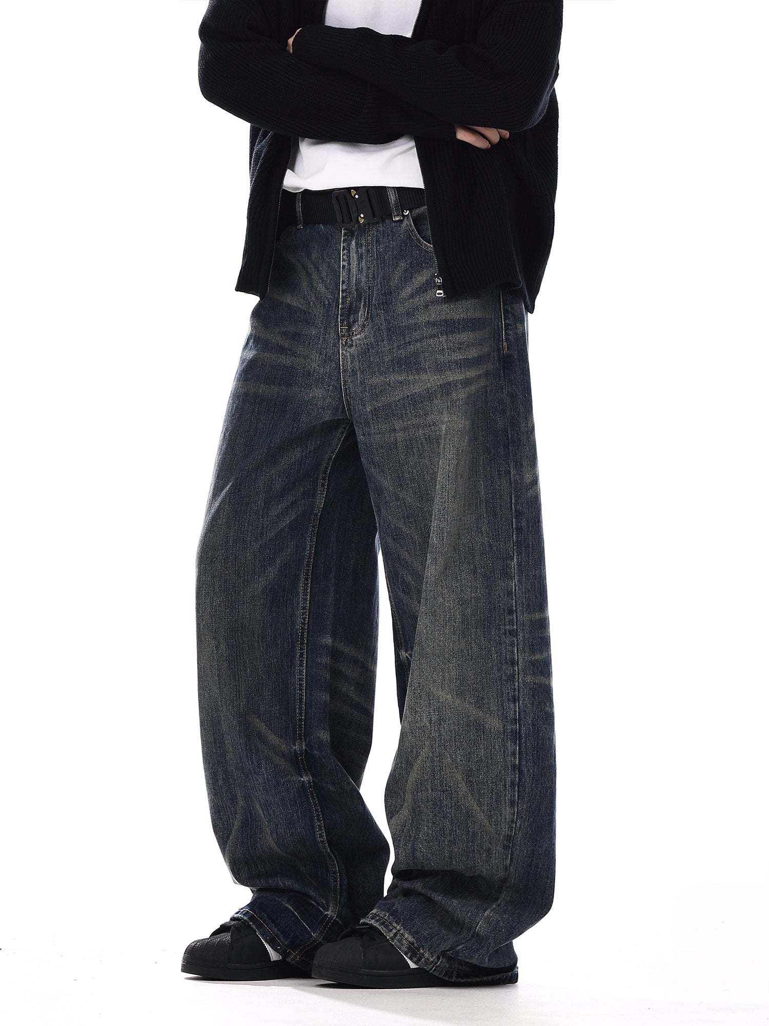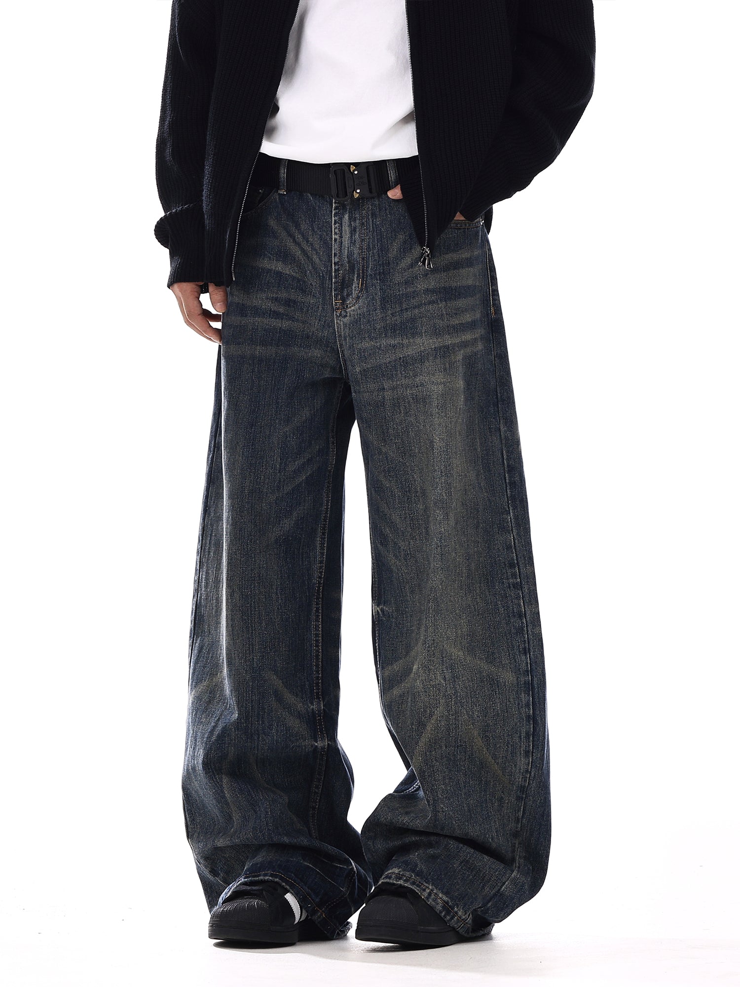 Washed Pleats Wide-Leg Straight Denim Jeans WN15129