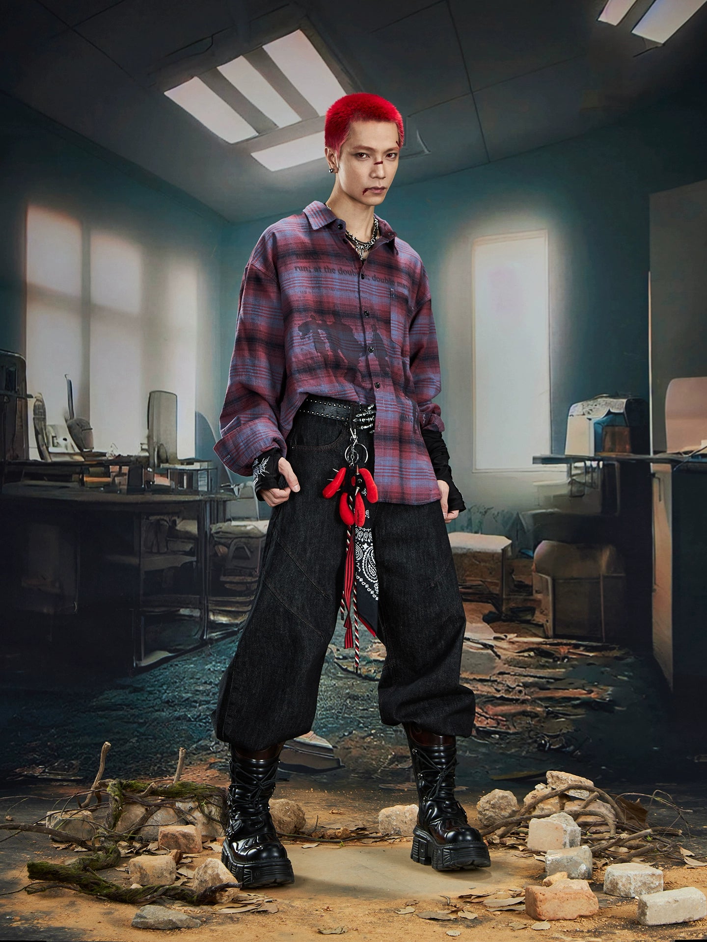 Plaid Color Block Print Oversize Long Sleeve Shirt WN20566