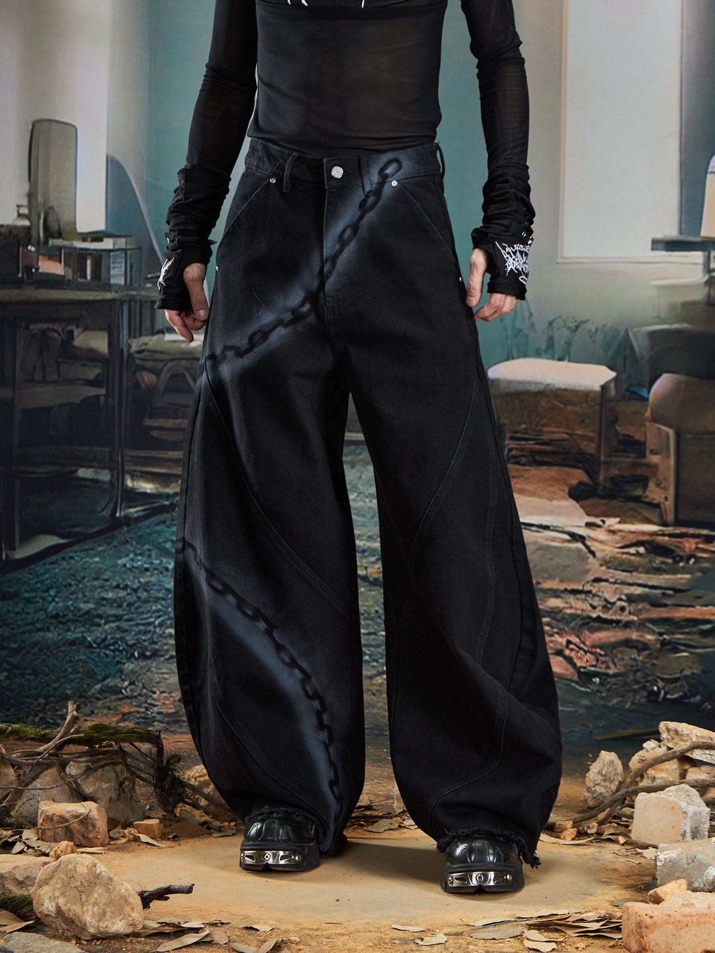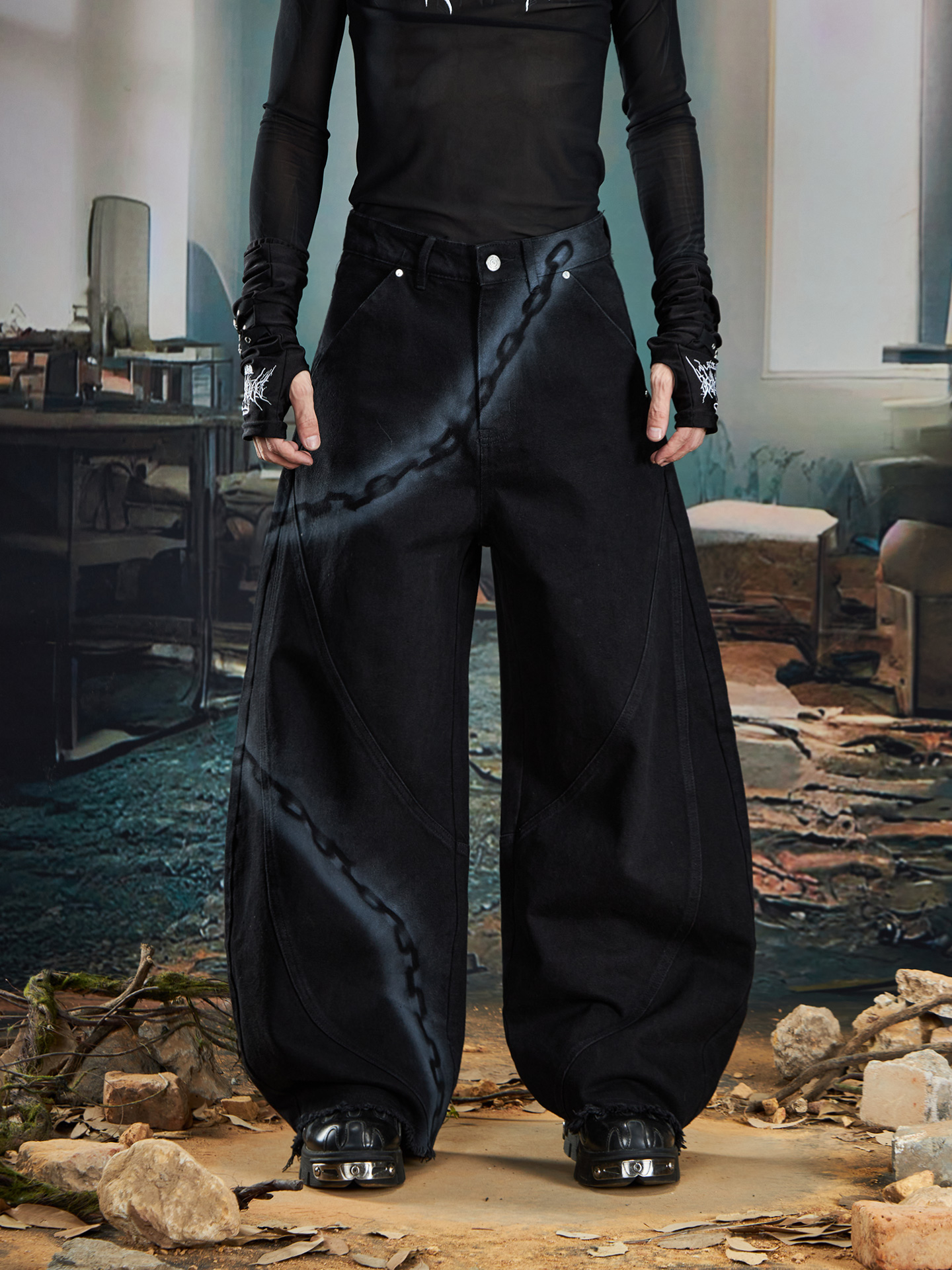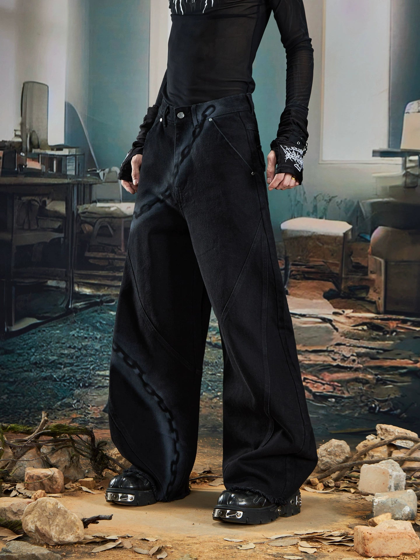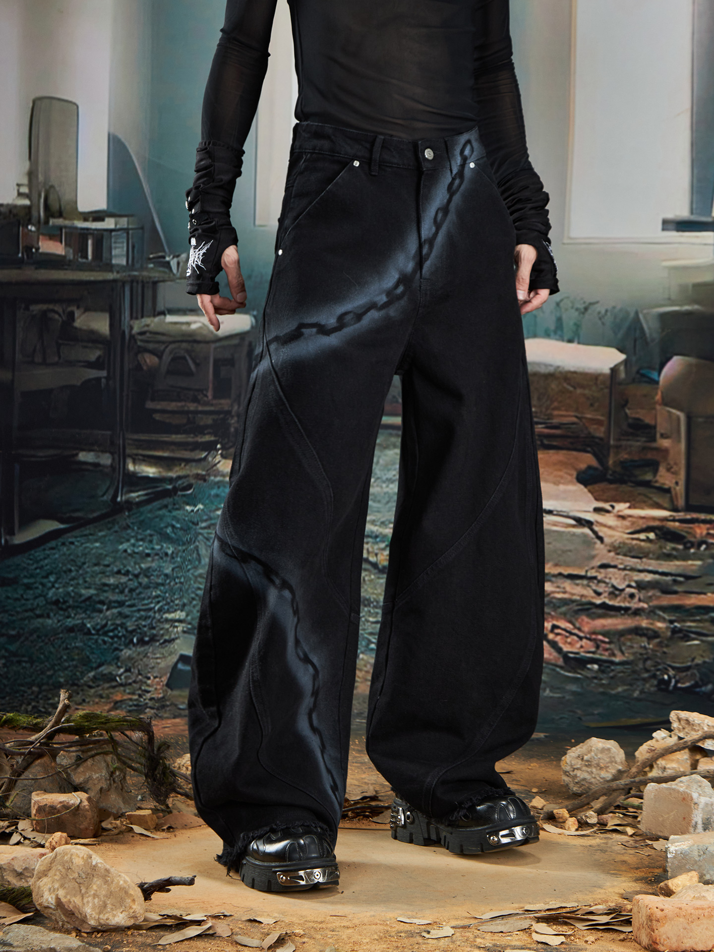 Spray Paint Graffiti Chain Washed Wide Leg Denim Jeans WN20574