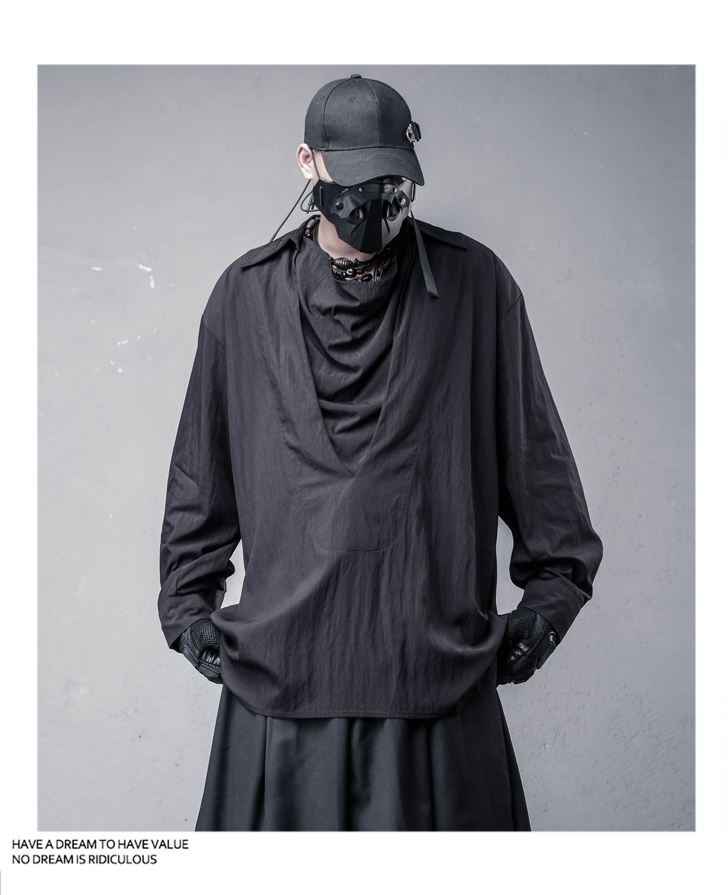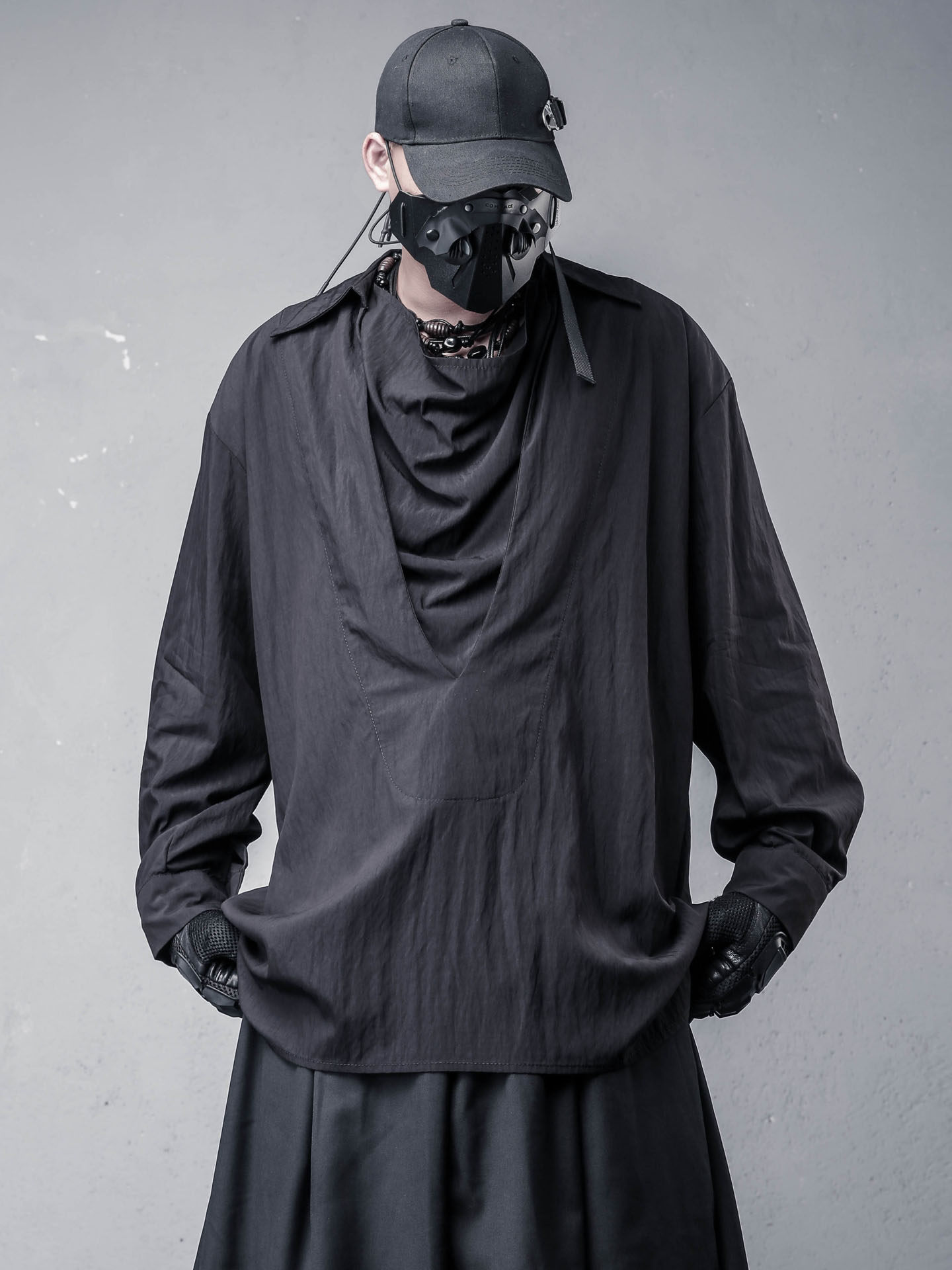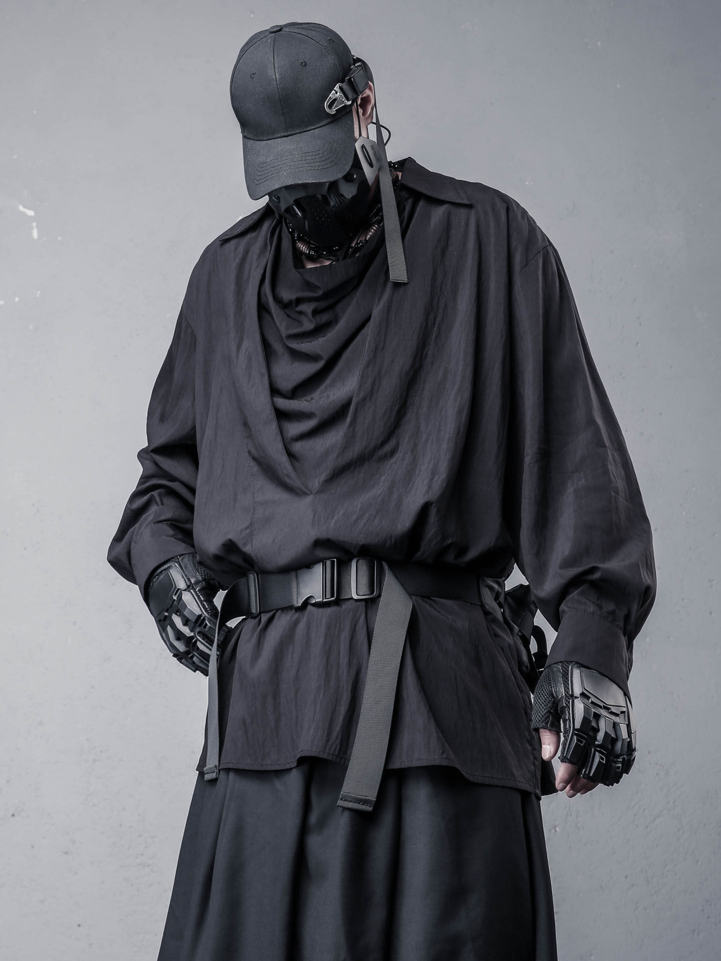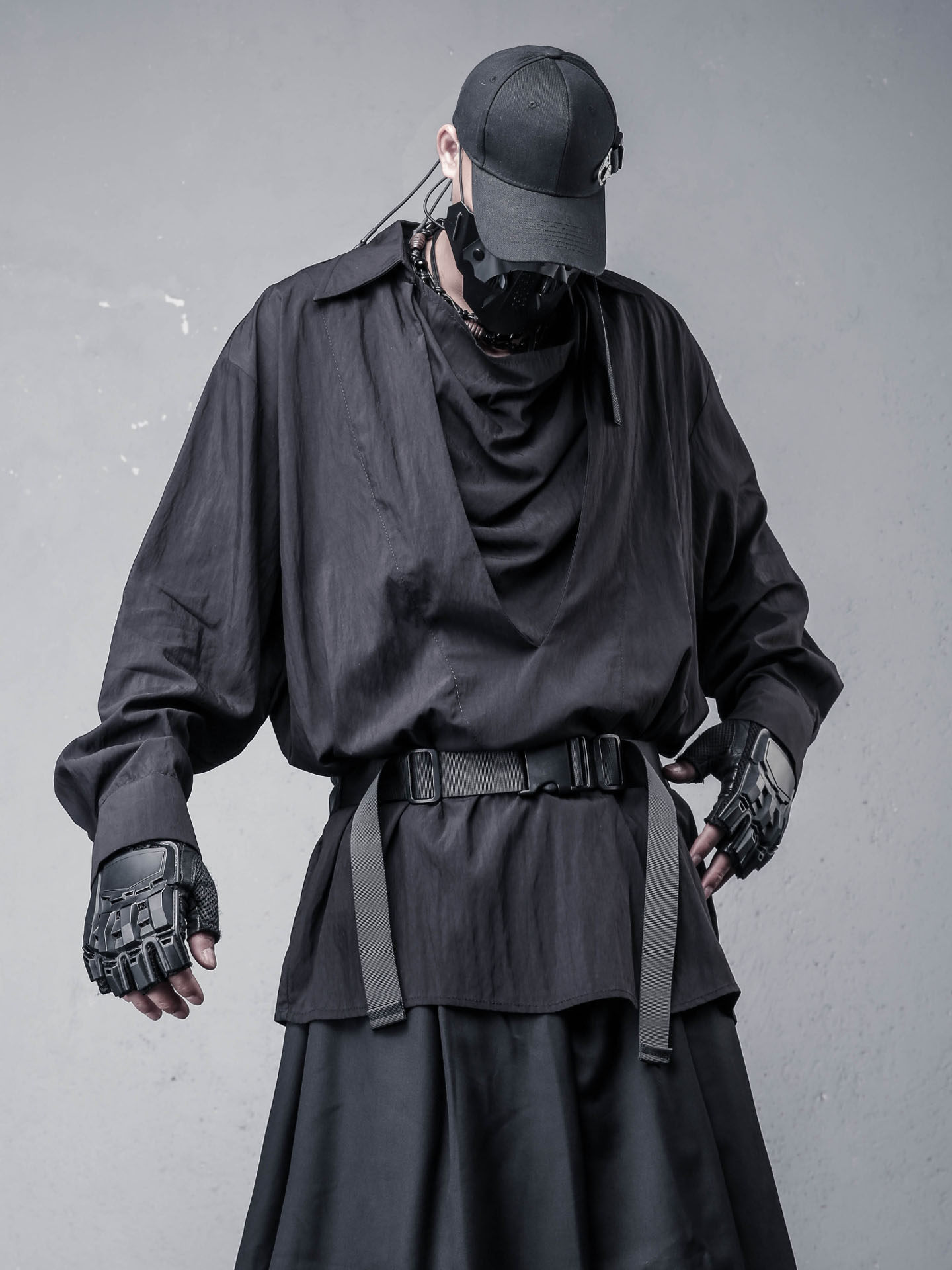 Draped High-Neck Fake Layered Long Sleeve Shirt & Functional Multi-Pocket Waist Bag WN22458
