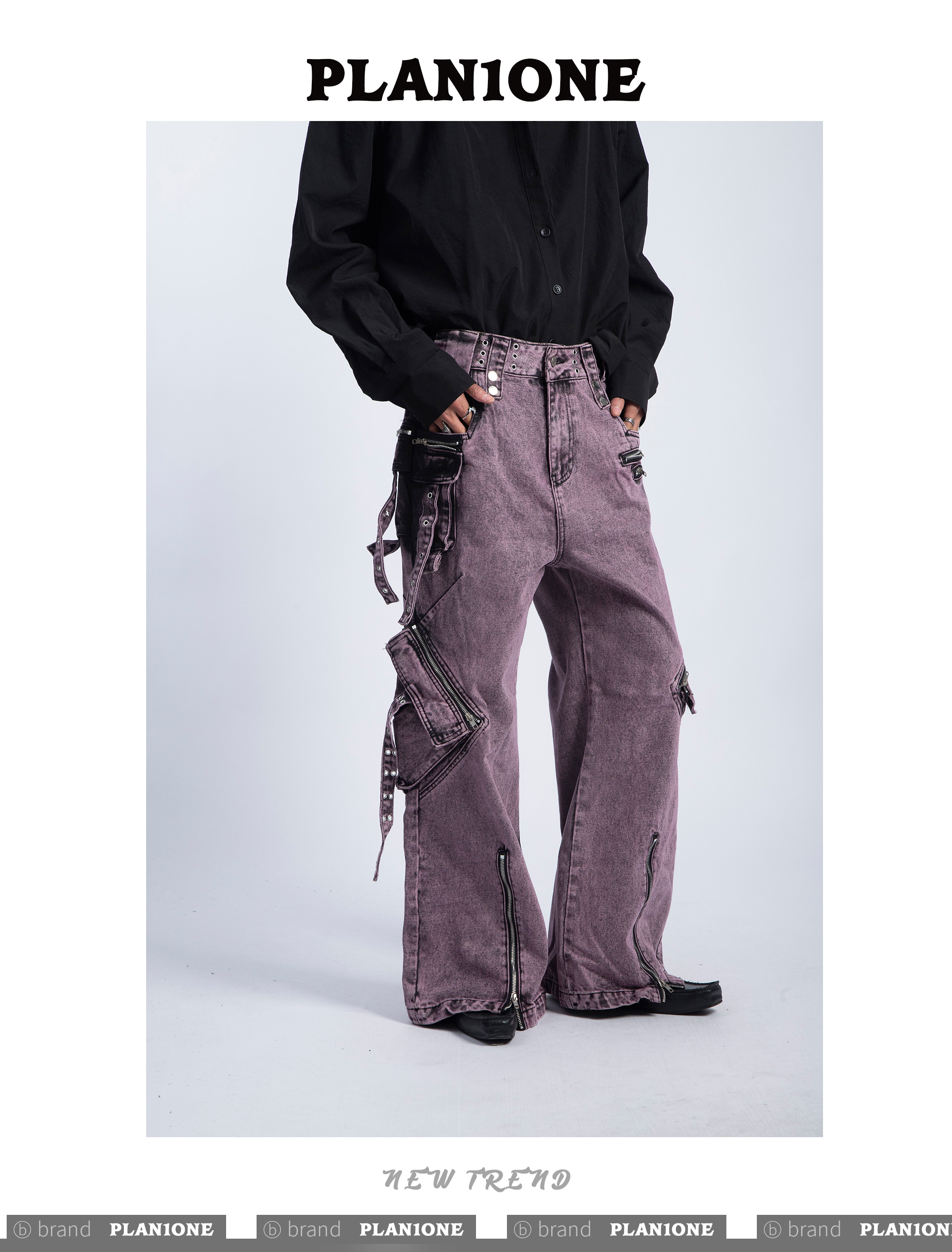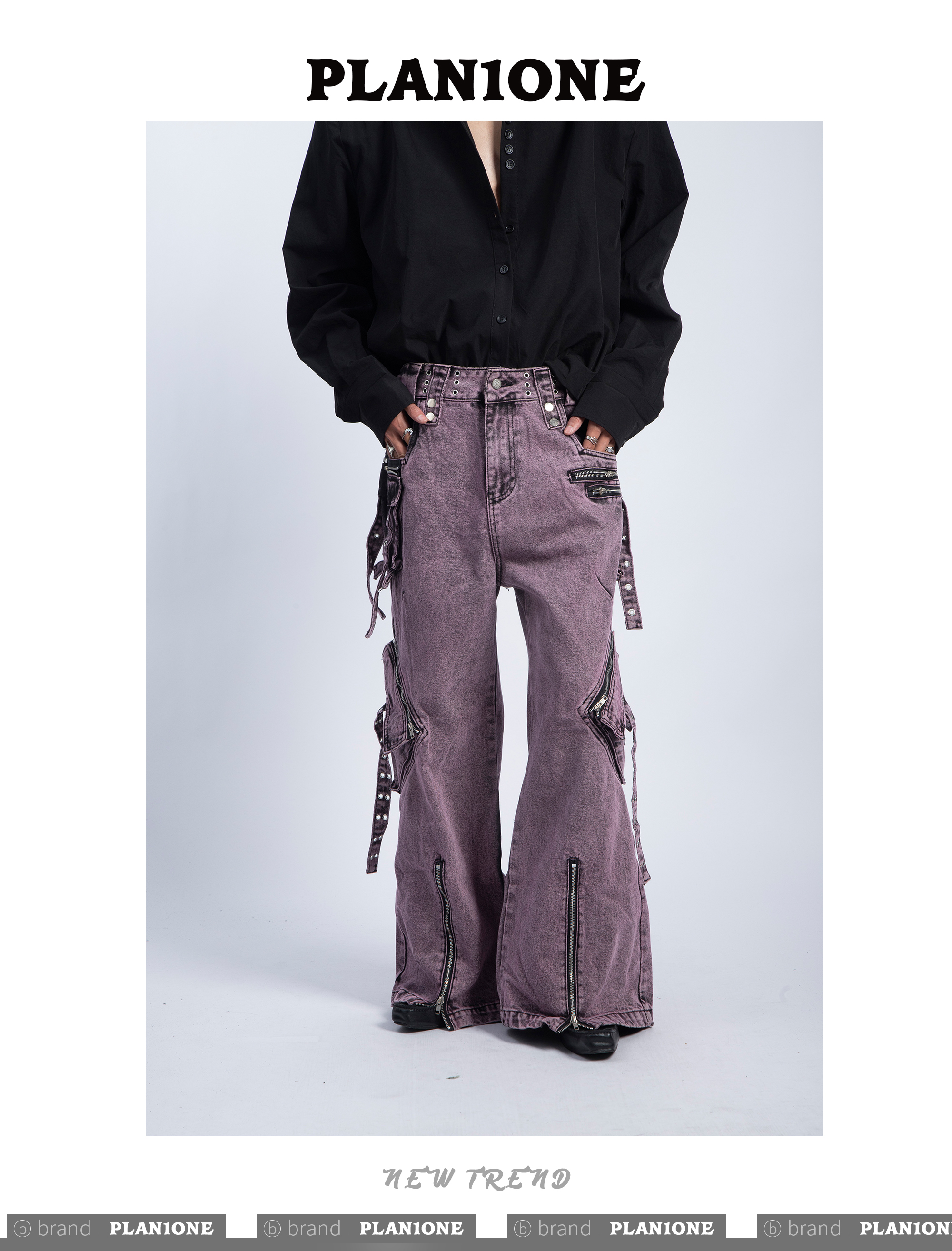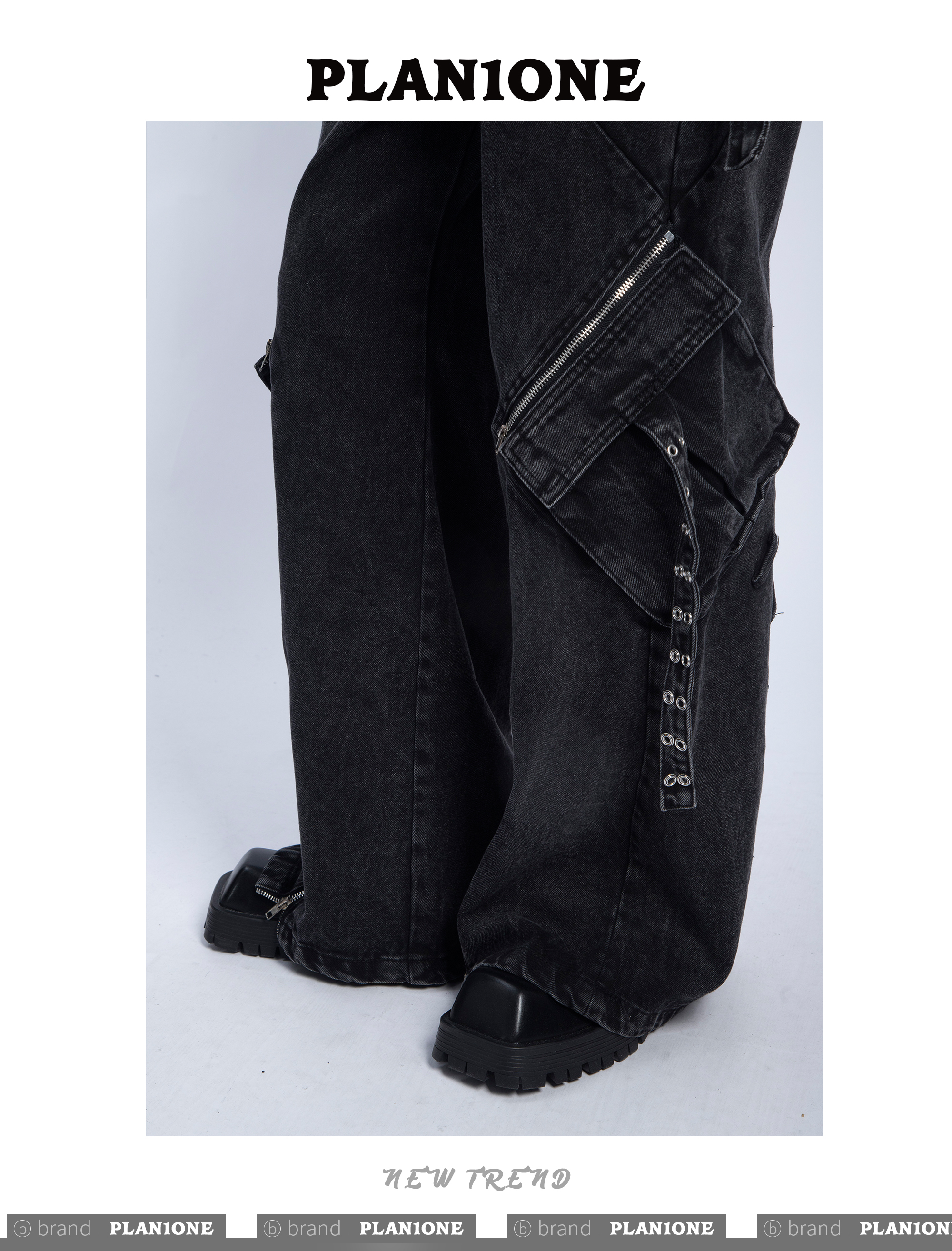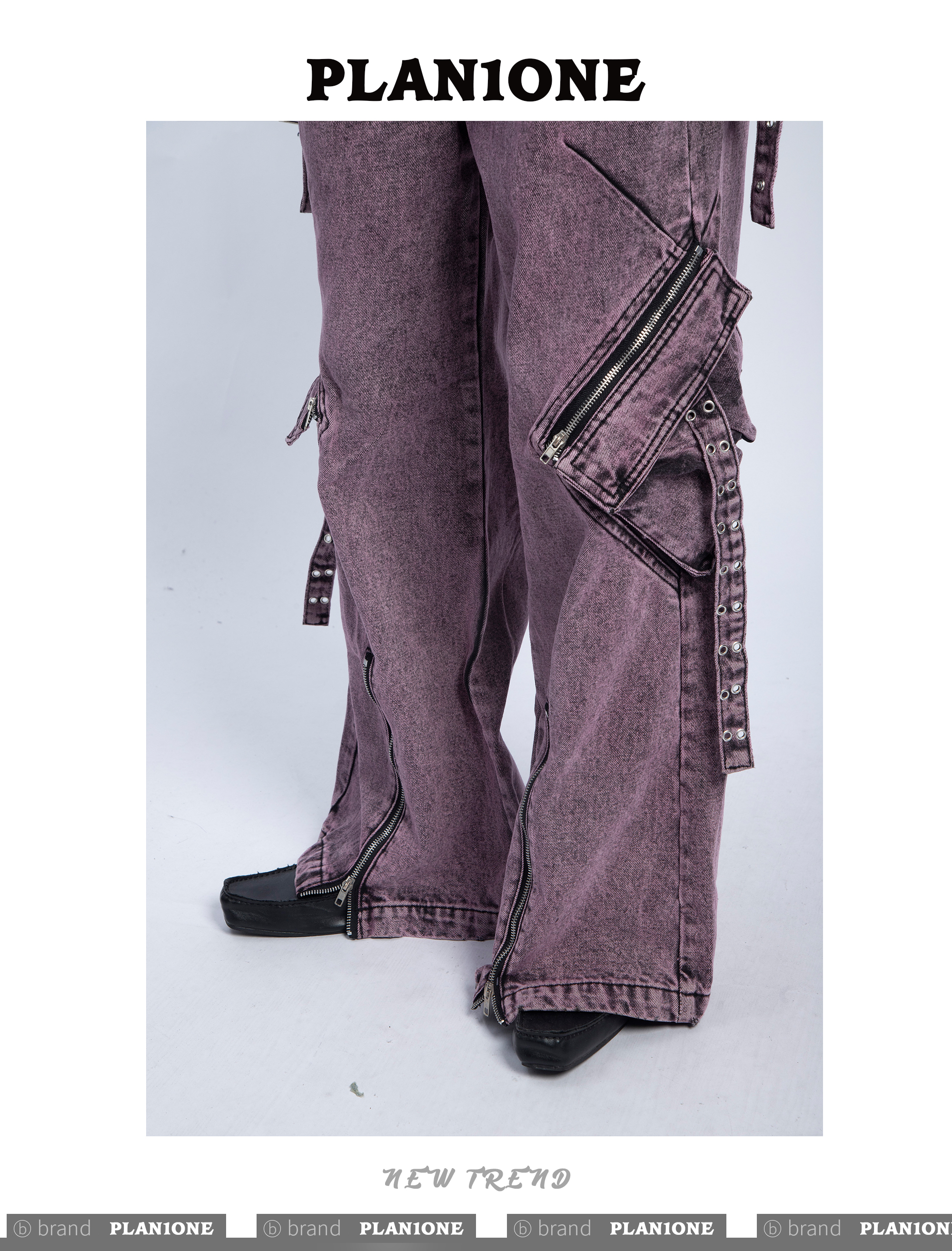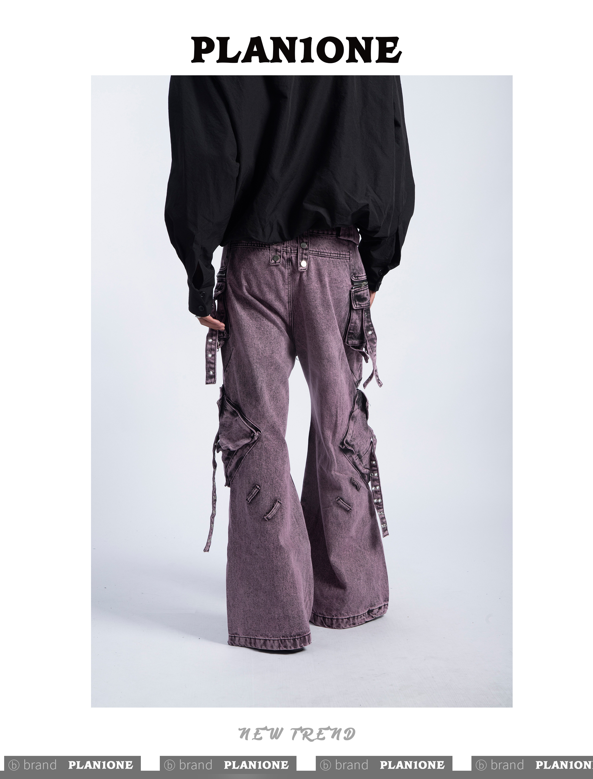 Washed Multi-Pocket Flare Cargo Denim Jeans WN9222