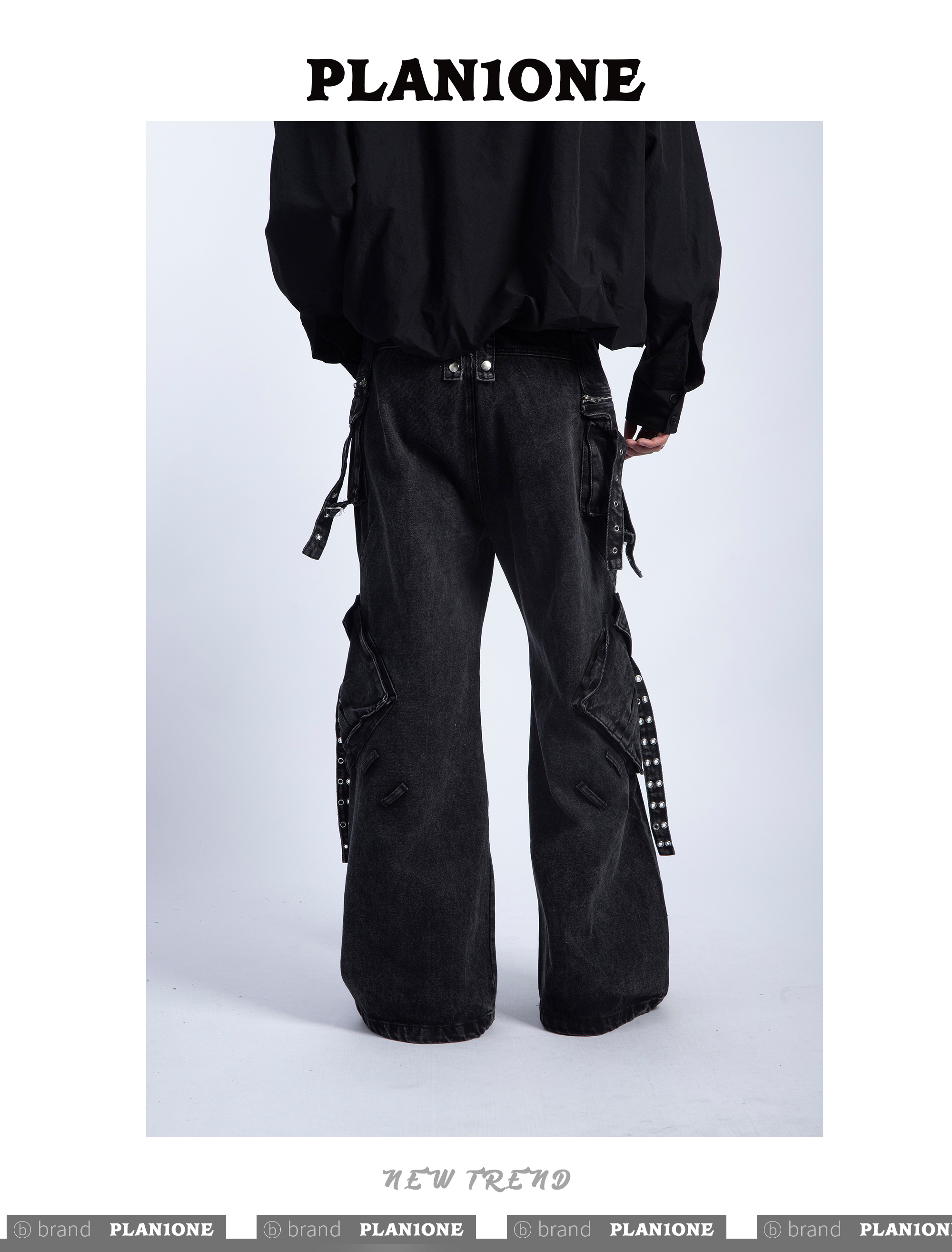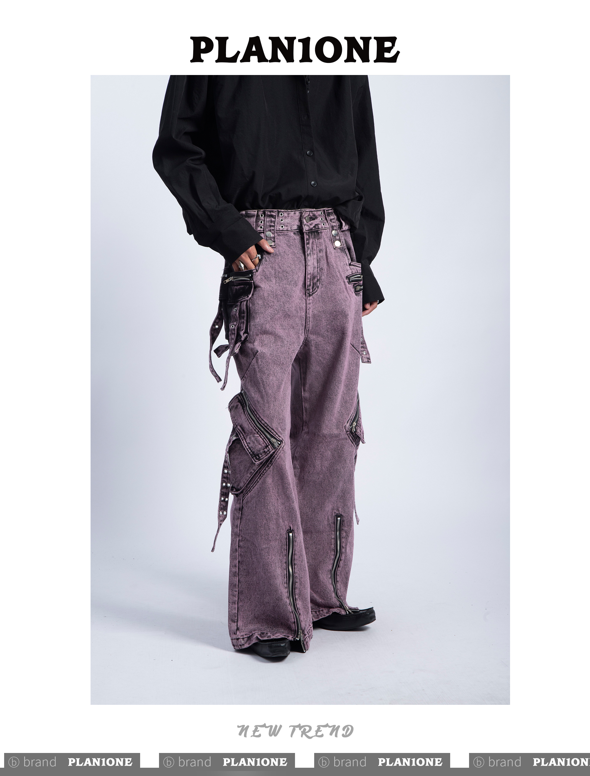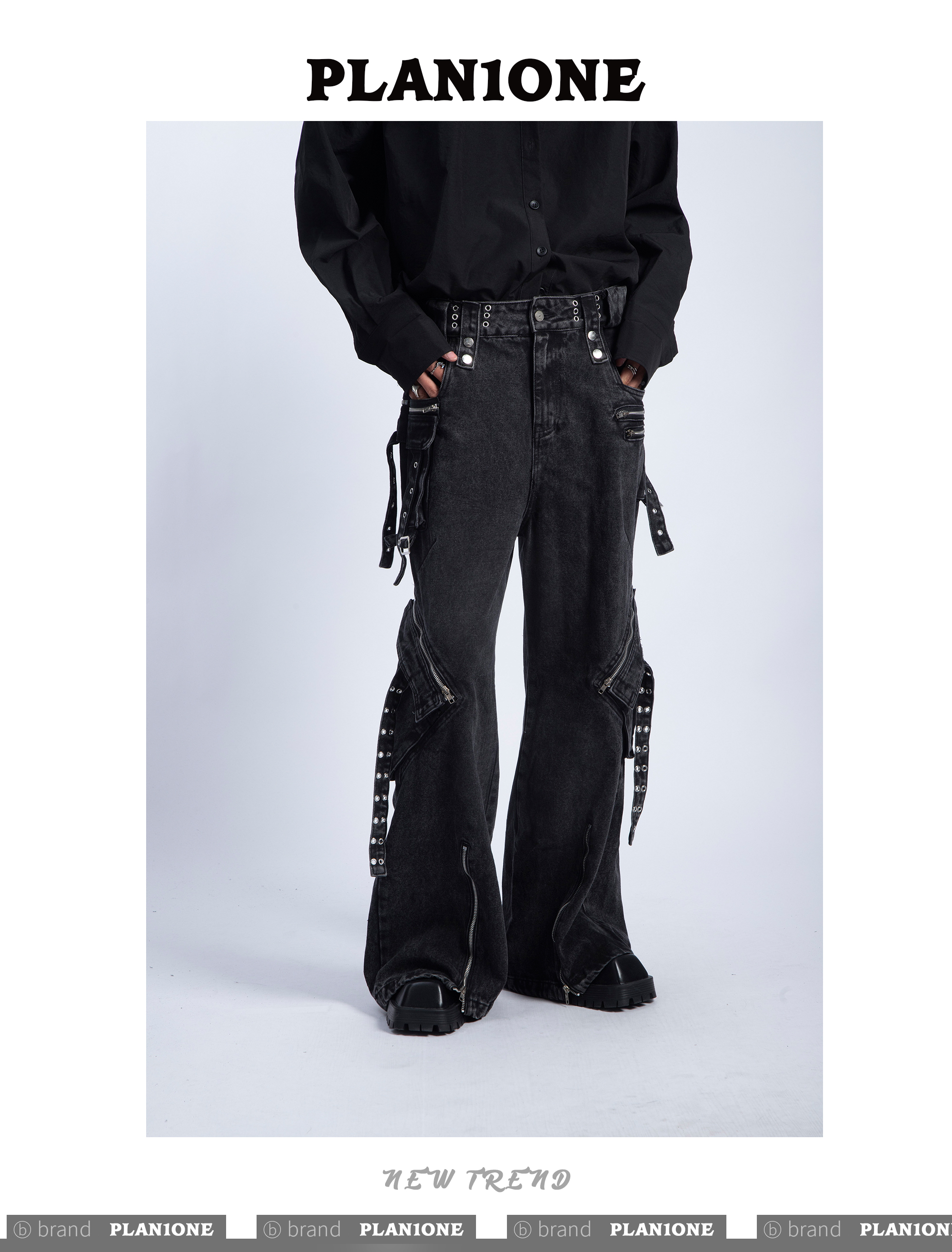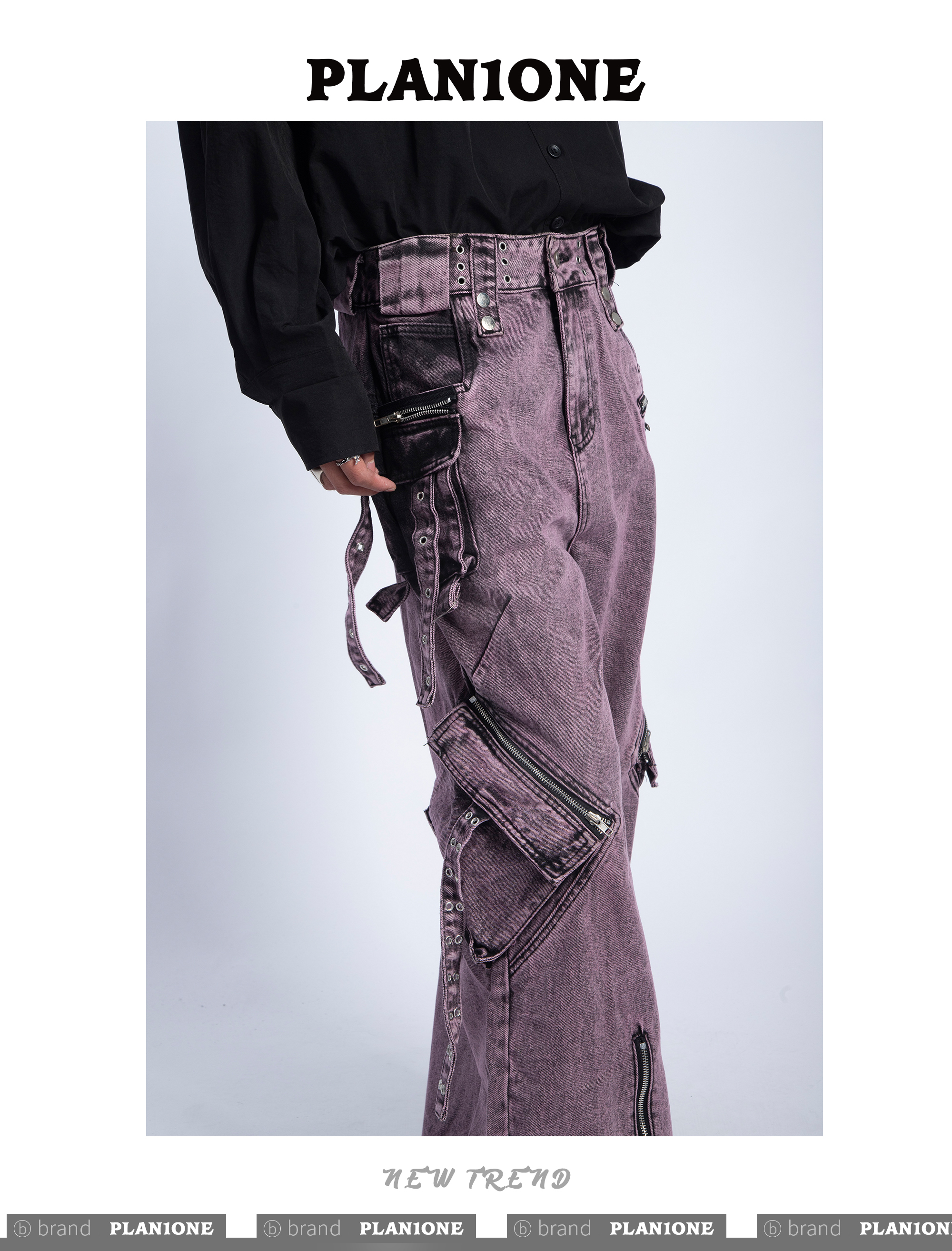 Washed Multi-Pocket Flare Cargo Denim Jeans WN9222
