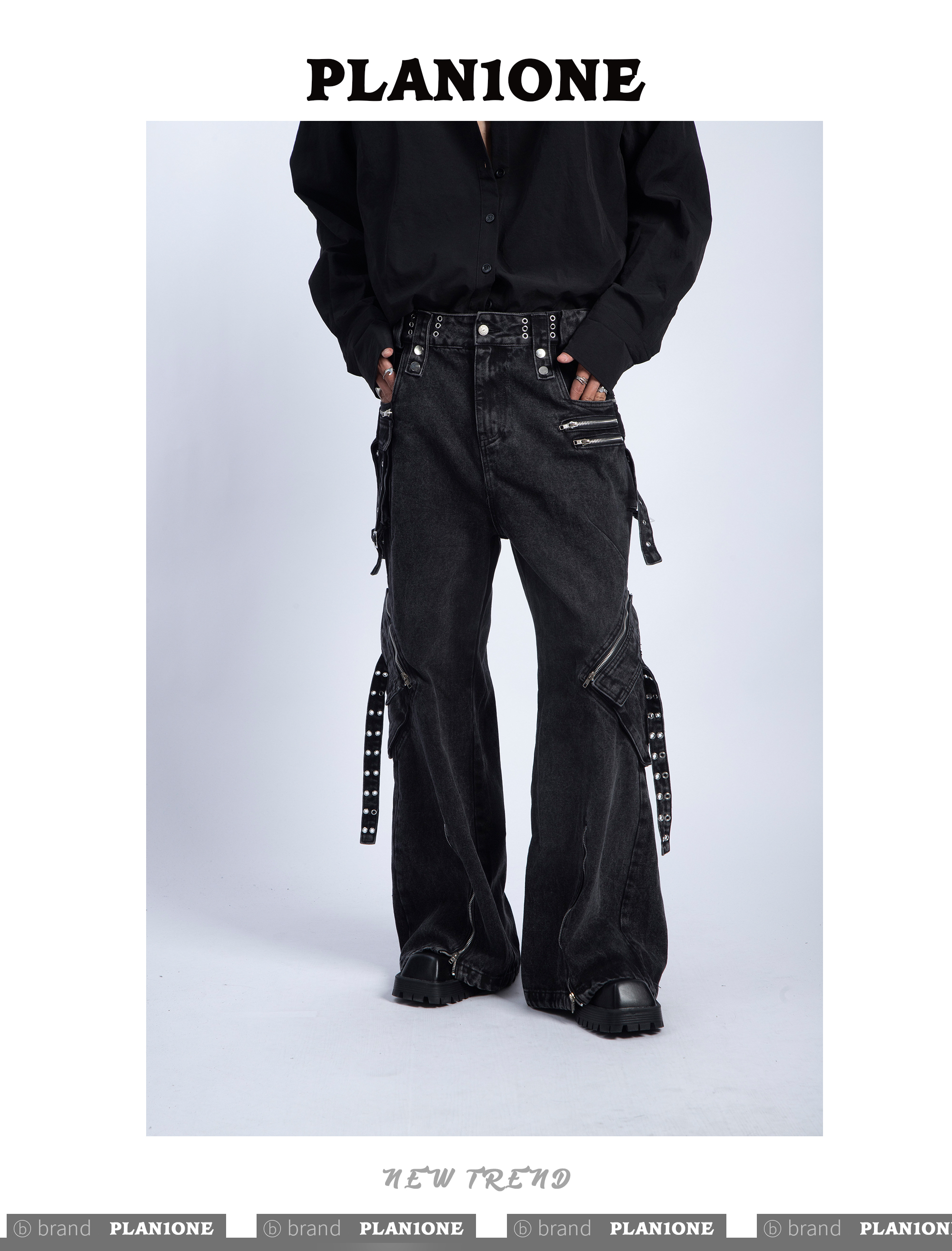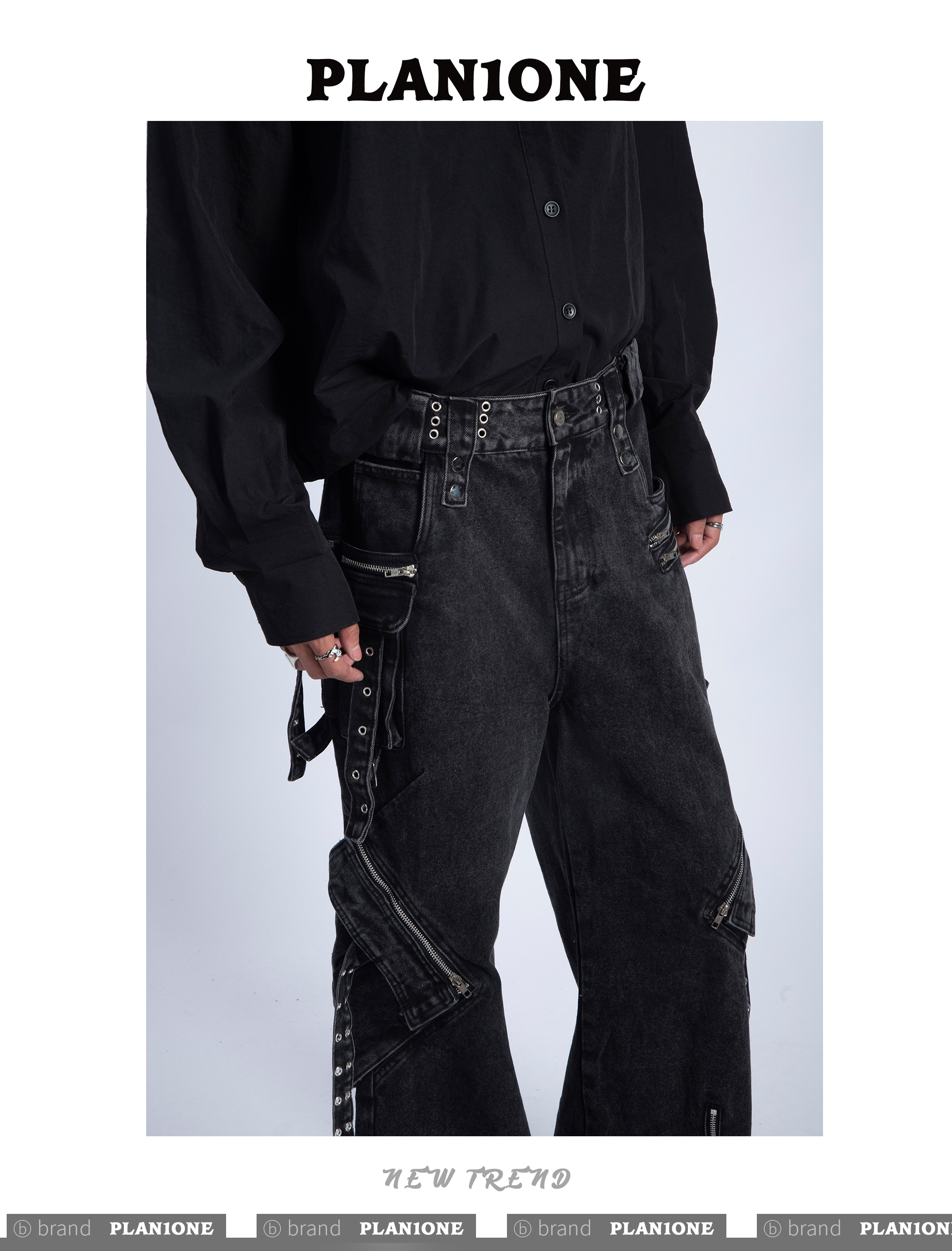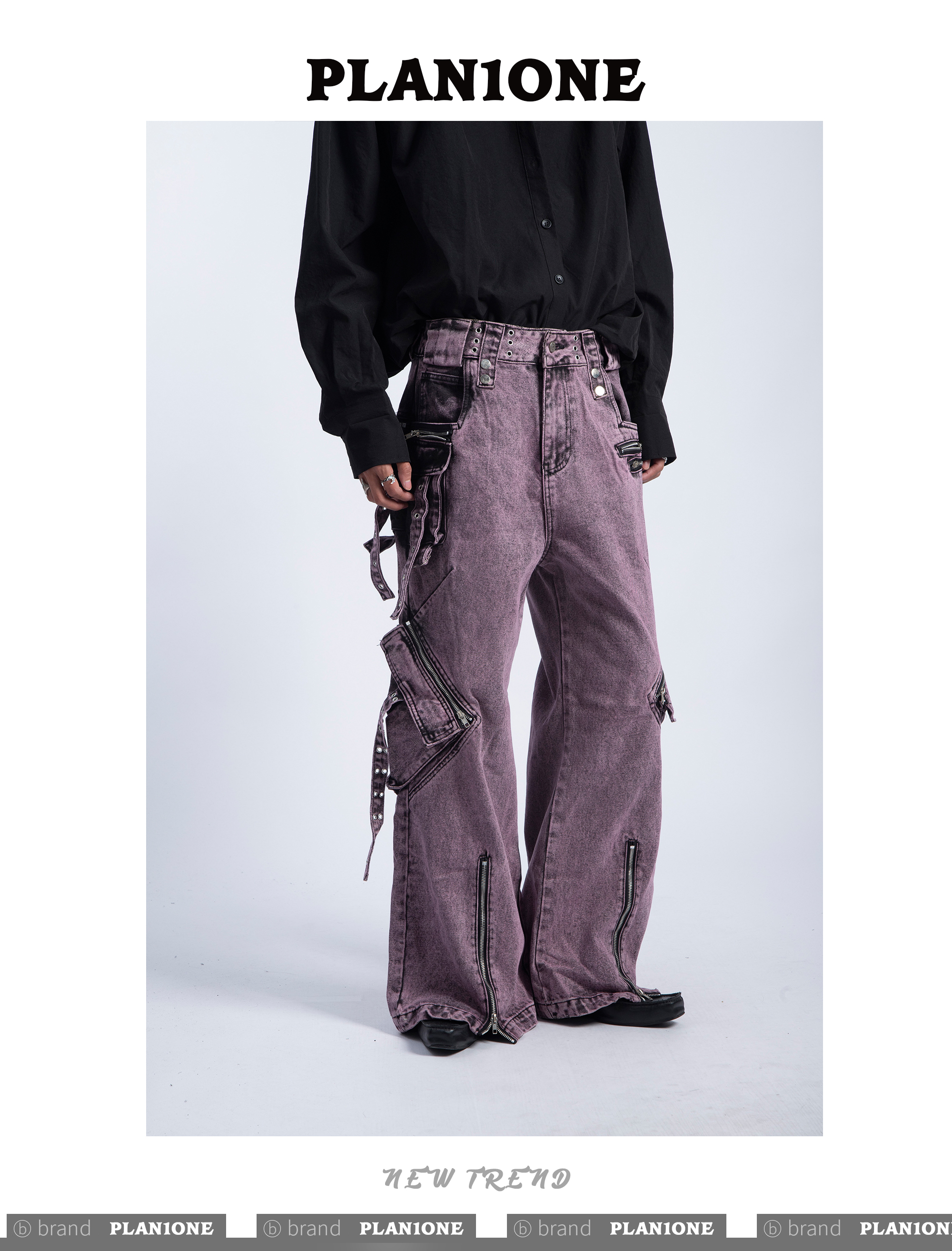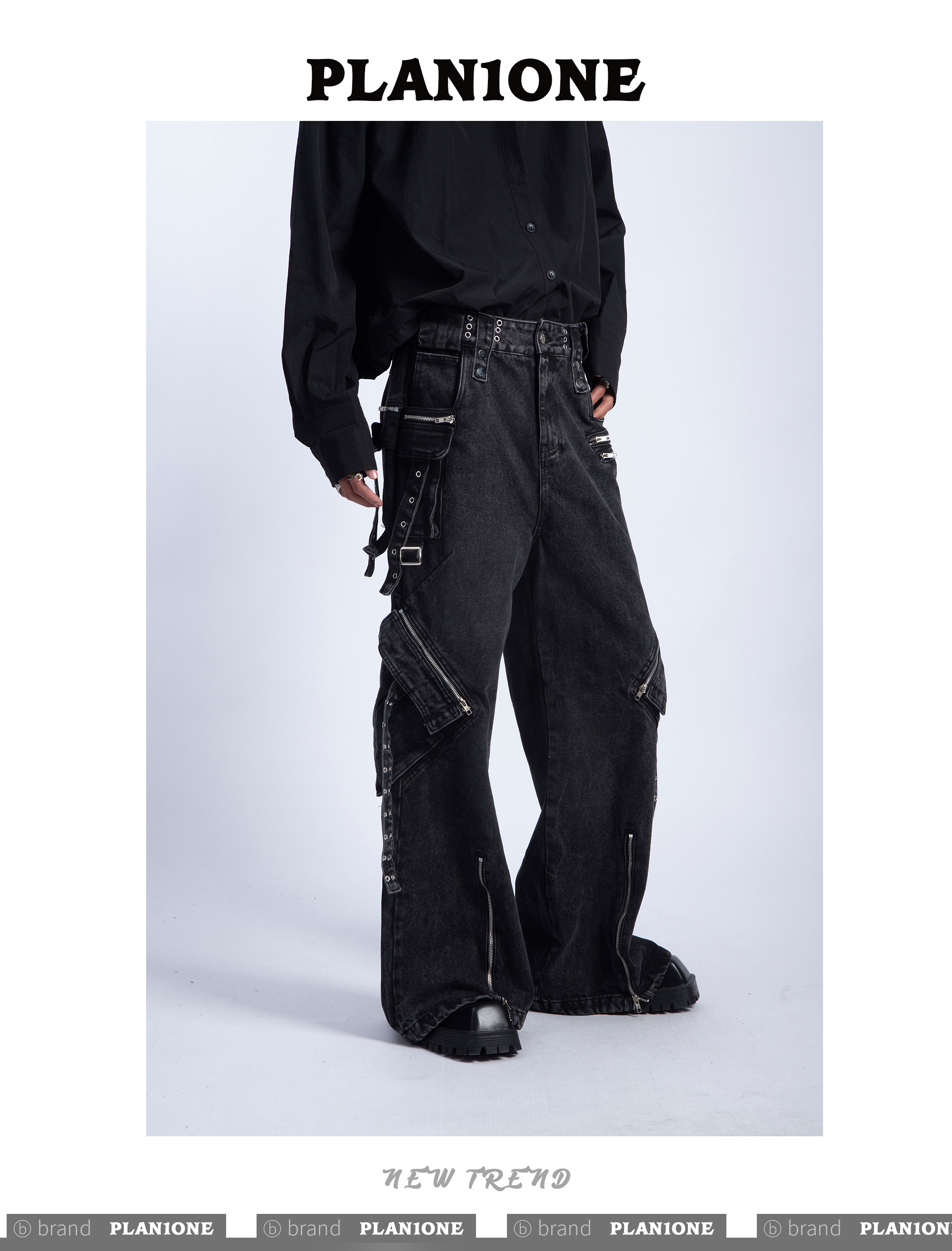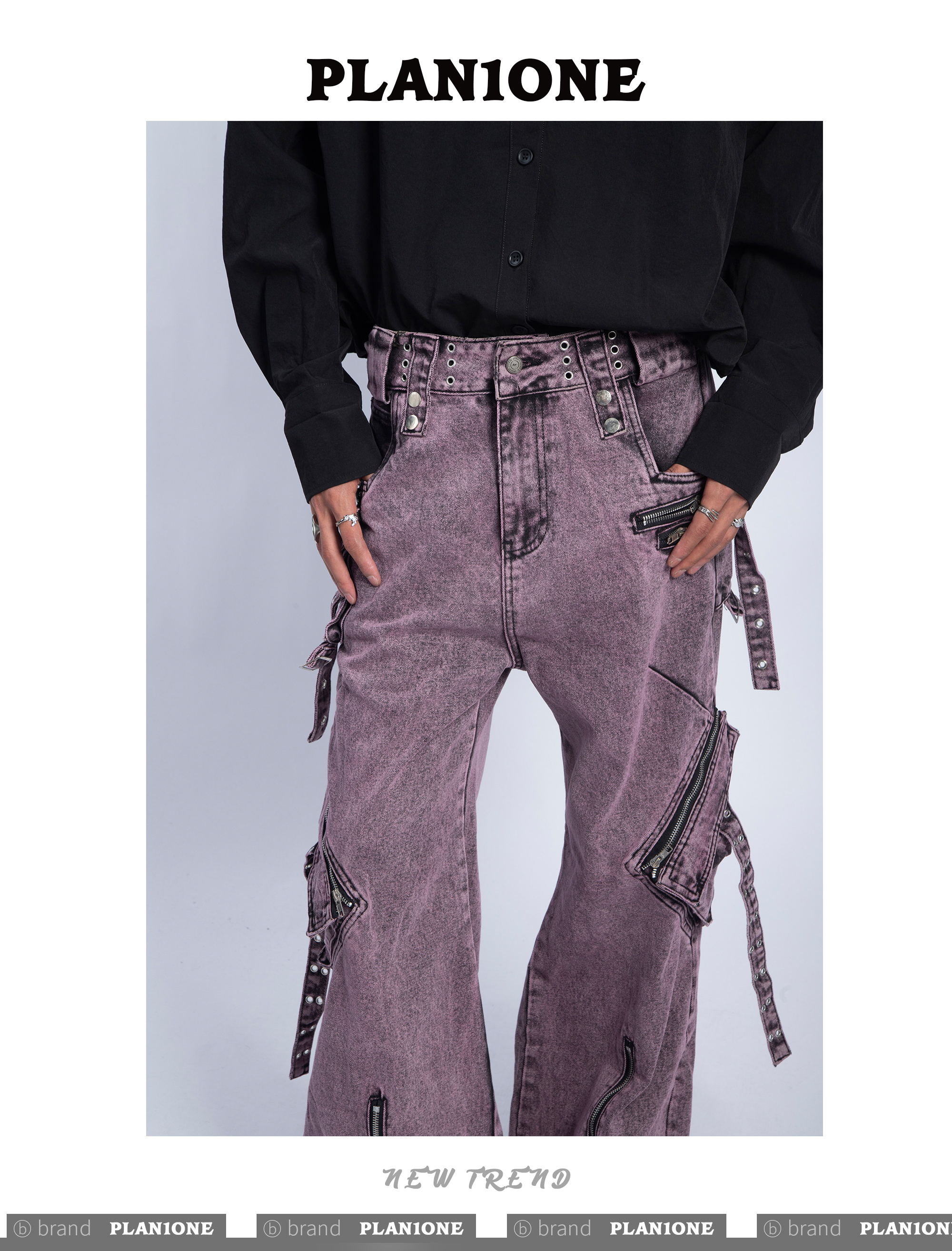 Washed Multi-Pocket Flare Cargo Denim Jeans WN9222