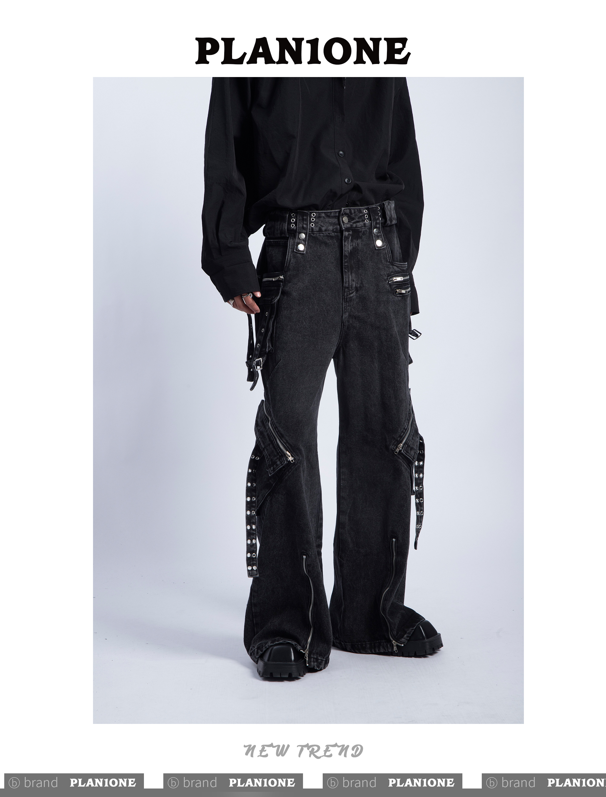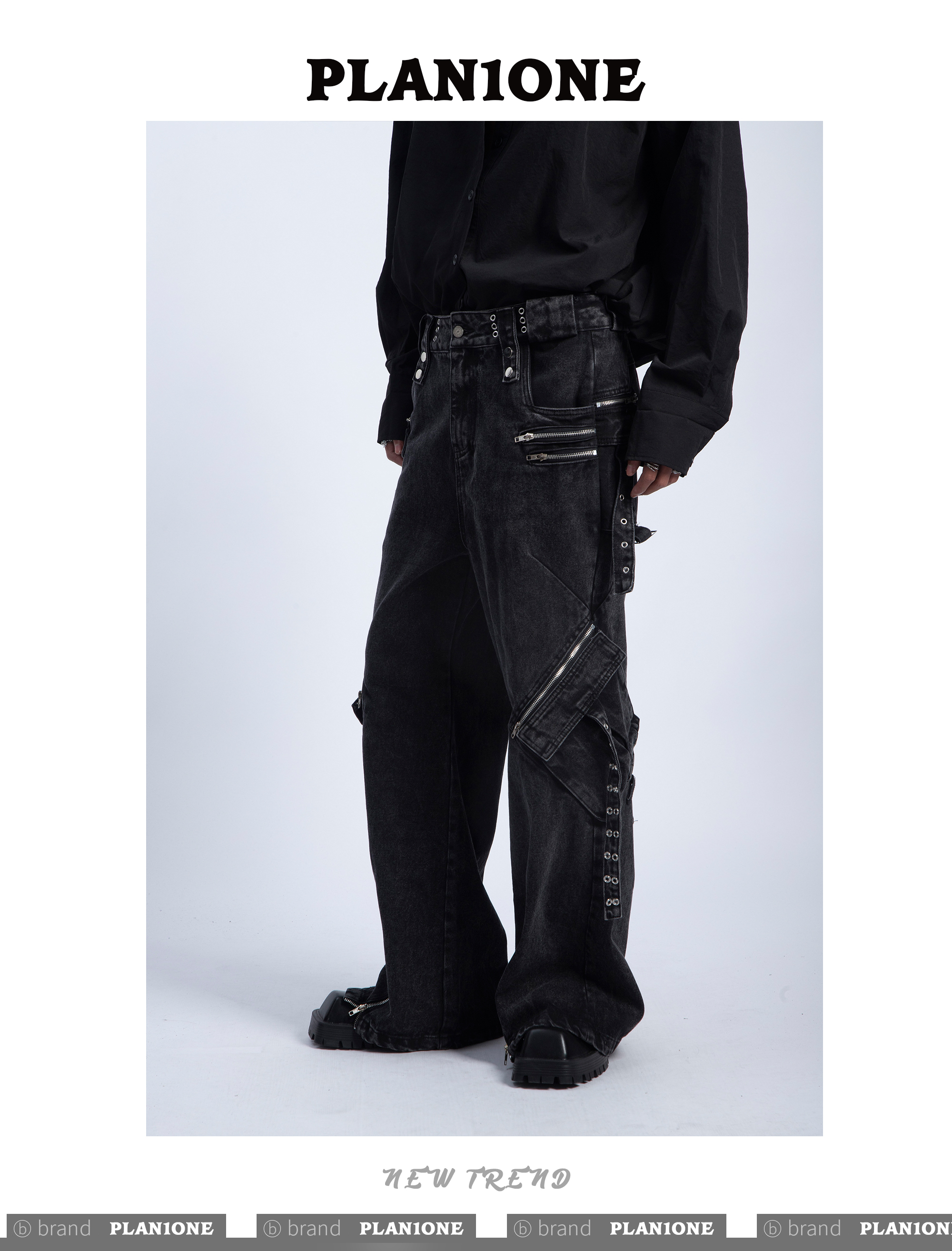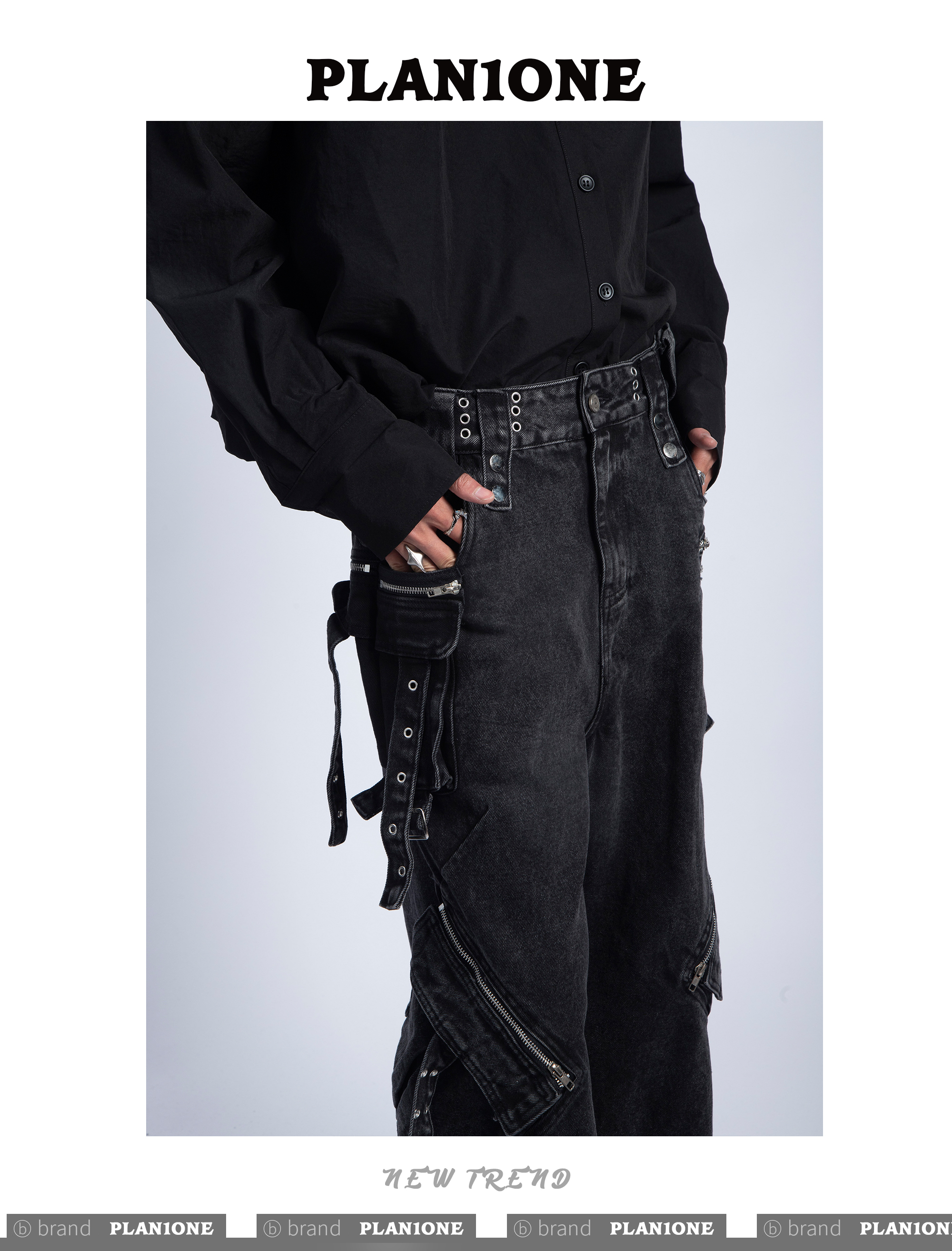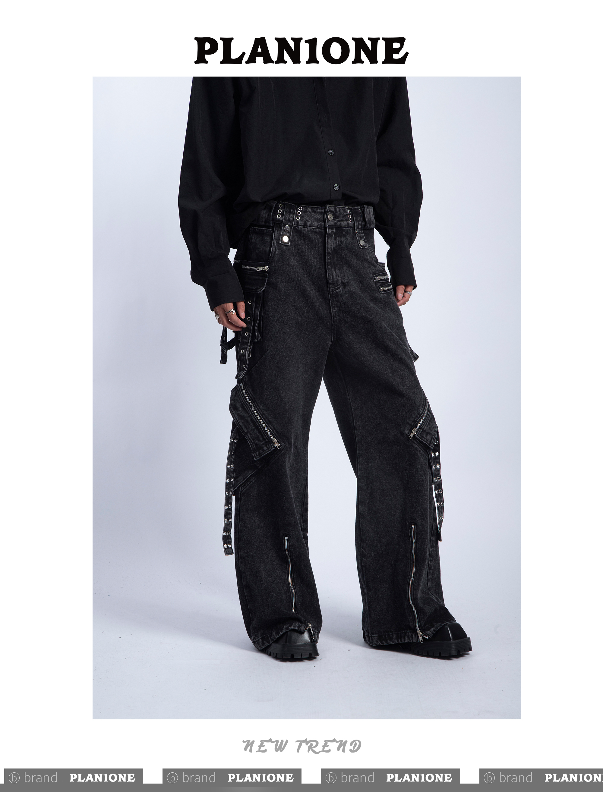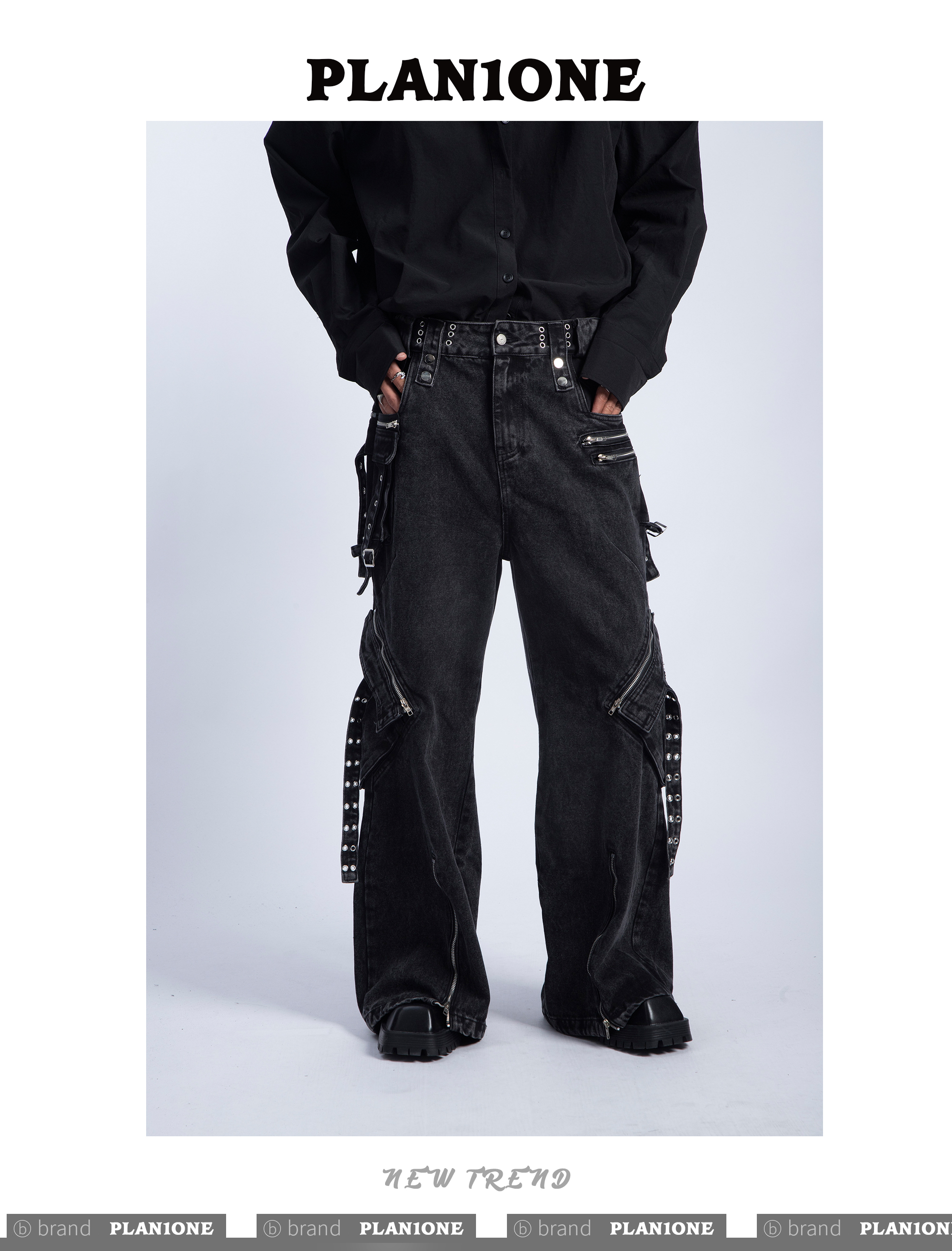 Washed Multi-Pocket Flare Cargo Denim Jeans WN9222