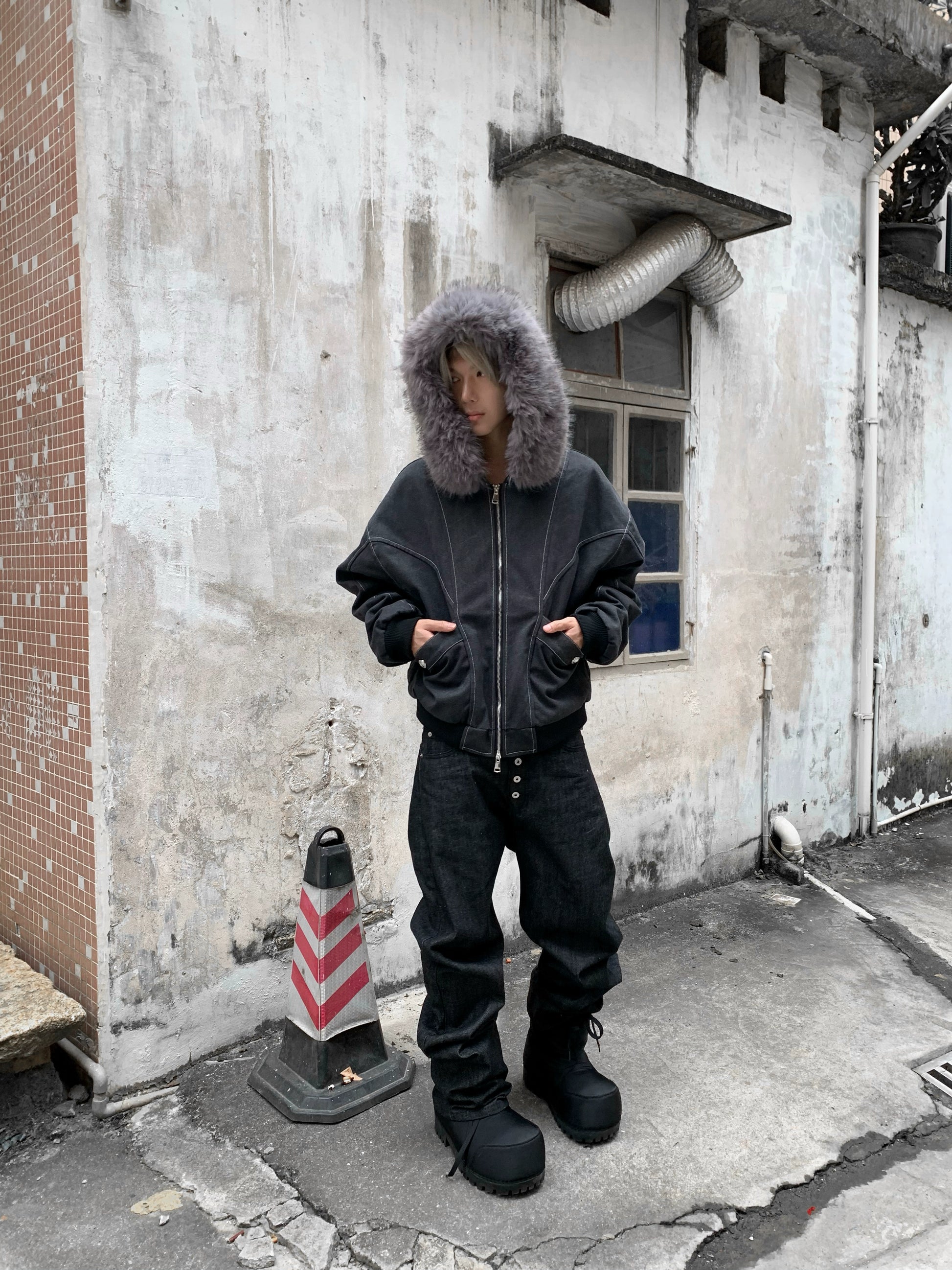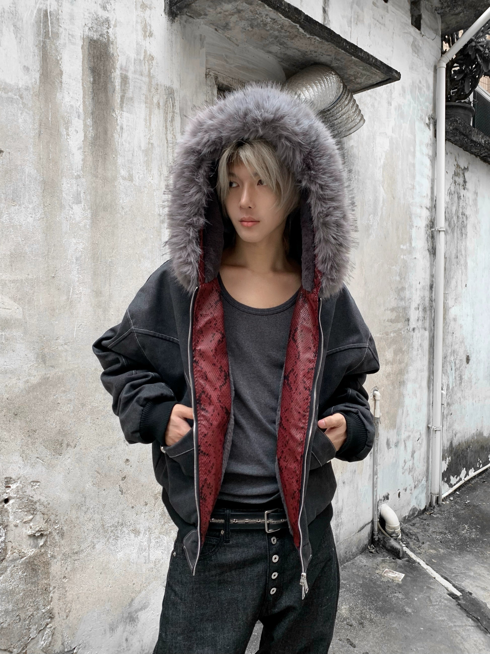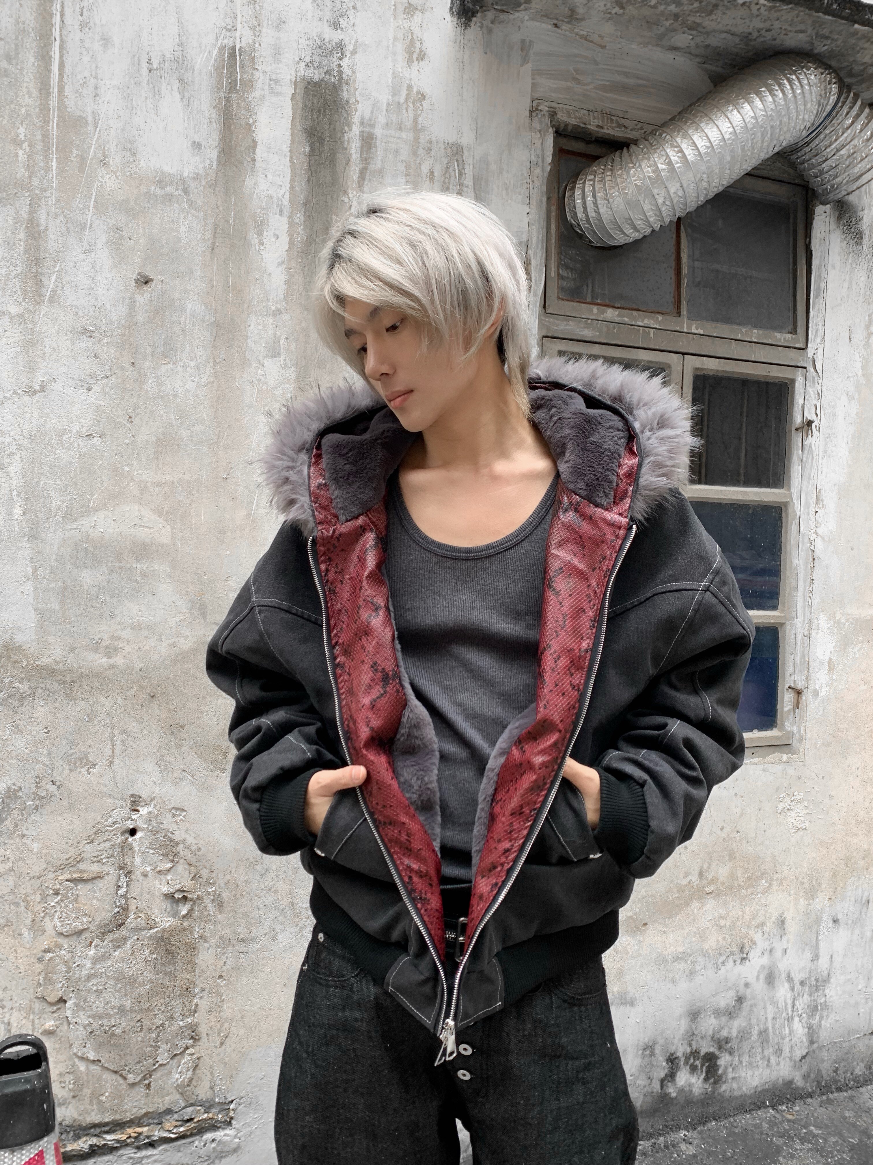 Hooded Fake Fur-Collar Zipper Short Jacket WN22217