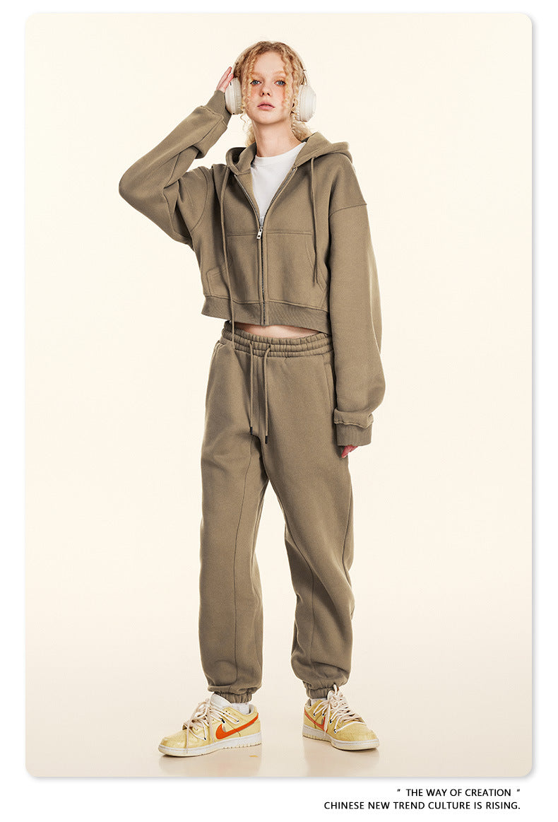 Cropped Sporty Zipper Hoodie & Sweat Jogger Pants & Straight-Leg Sweatpants Setup WN23116