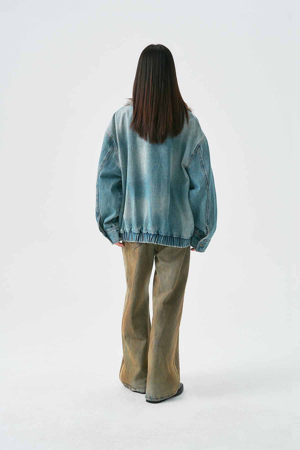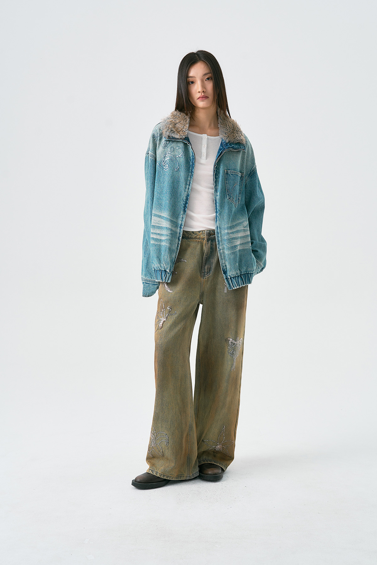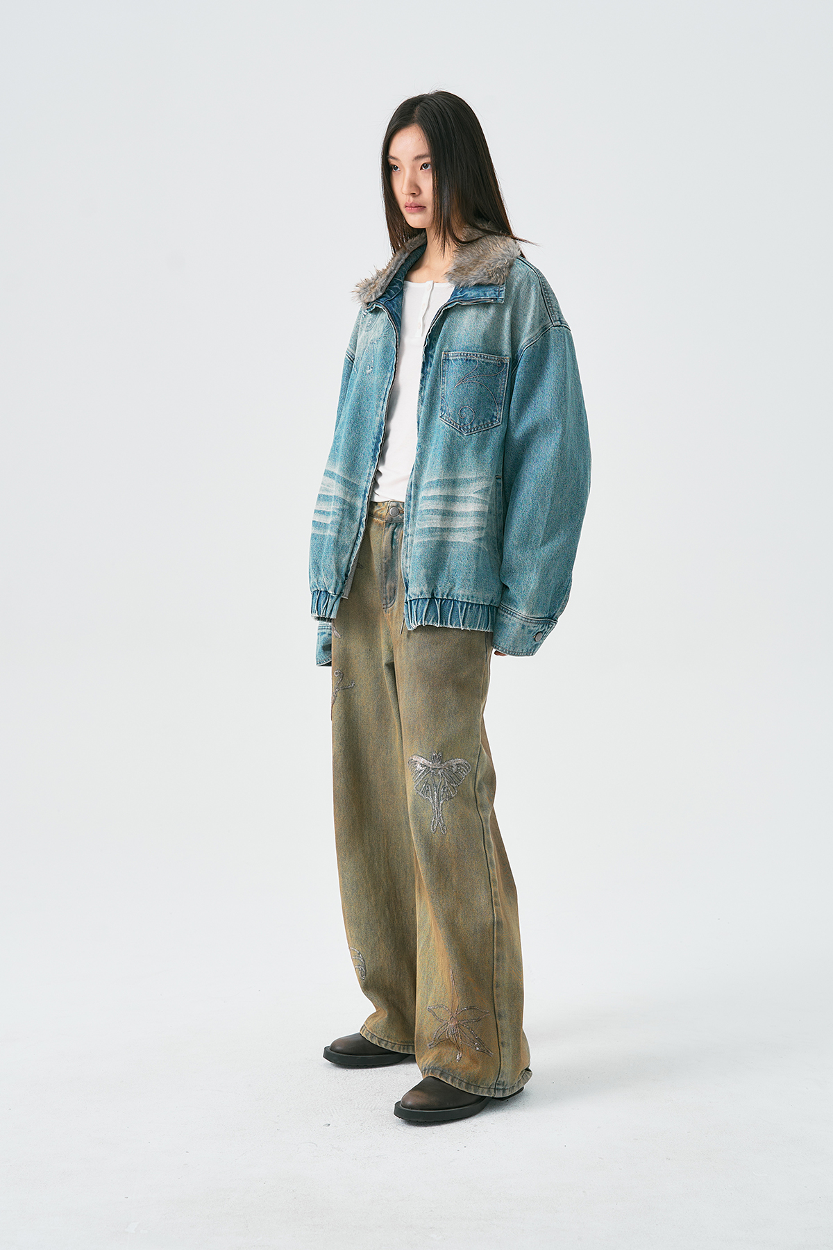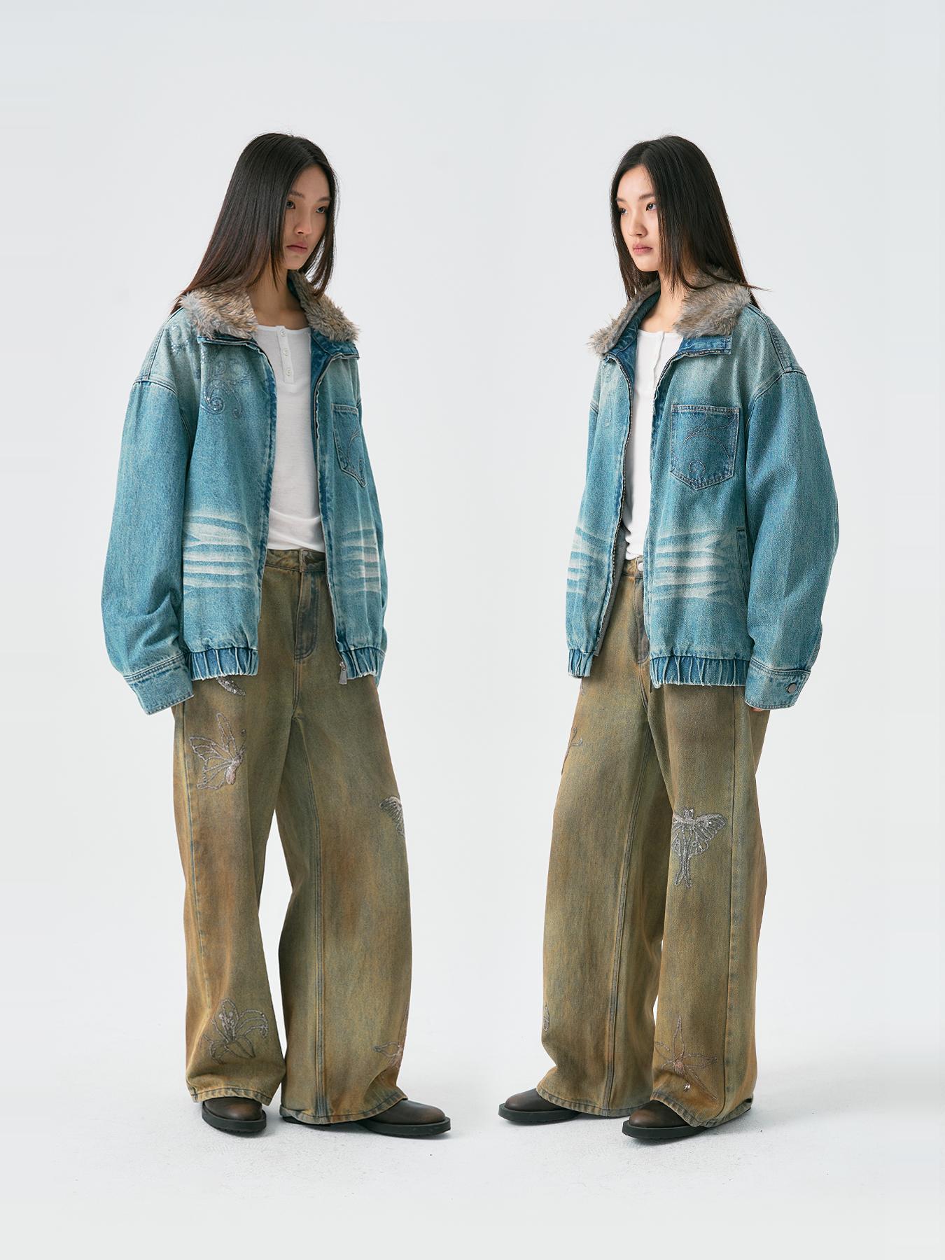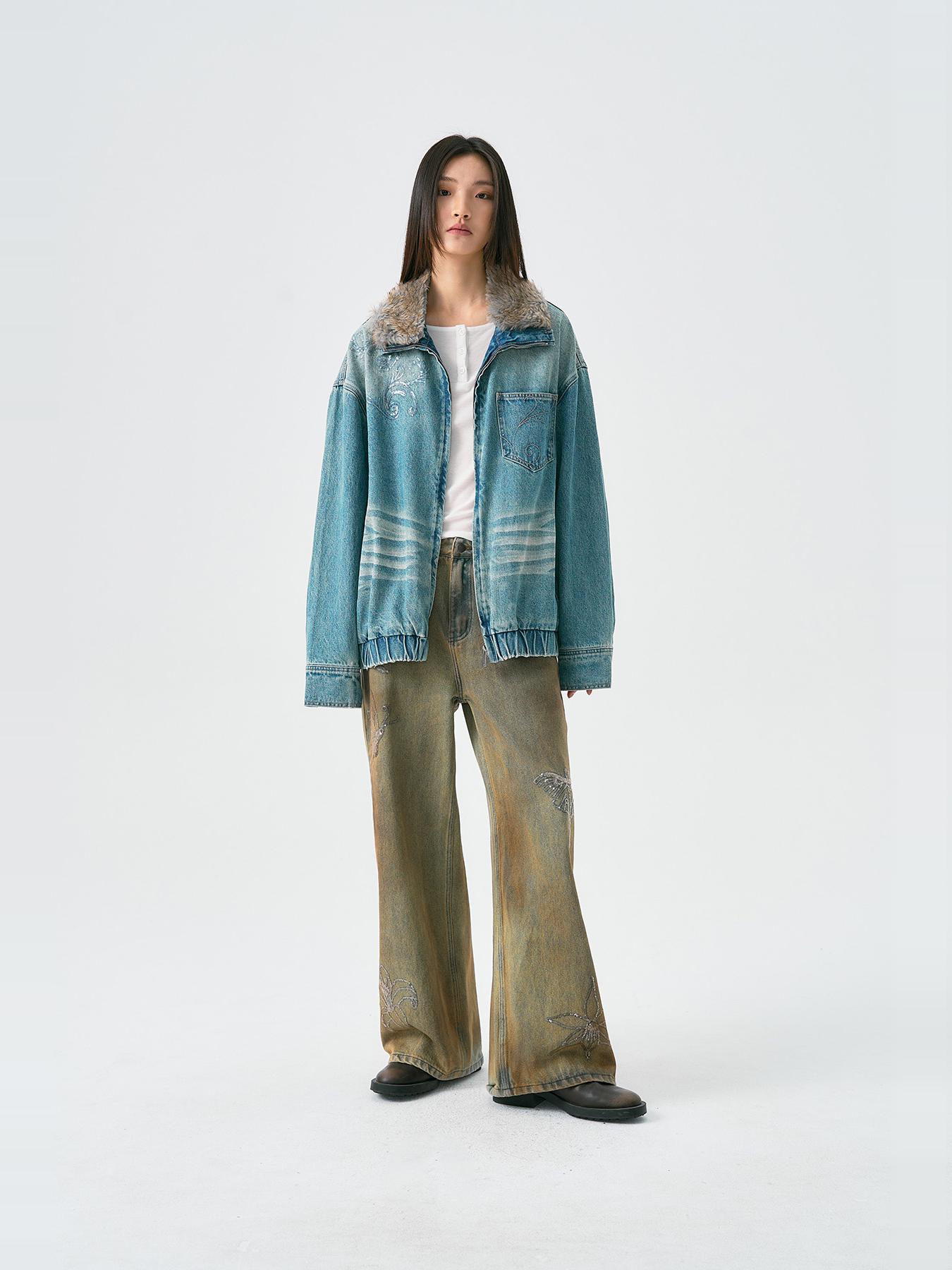 Embroidered Faux Fur Collar Wash Denim Jacket WN18926