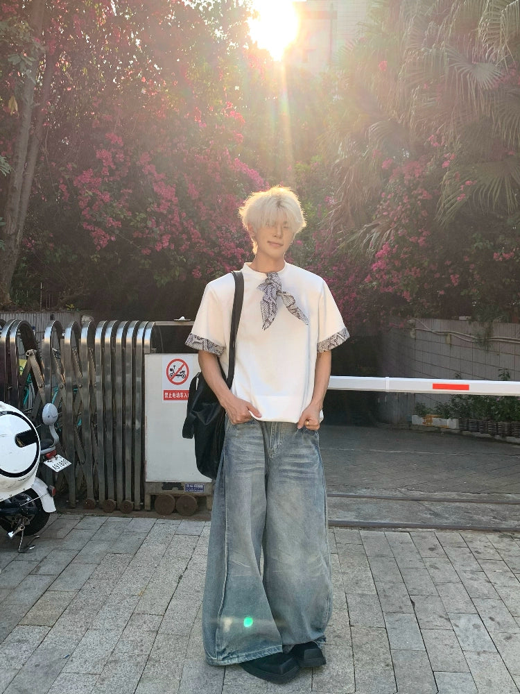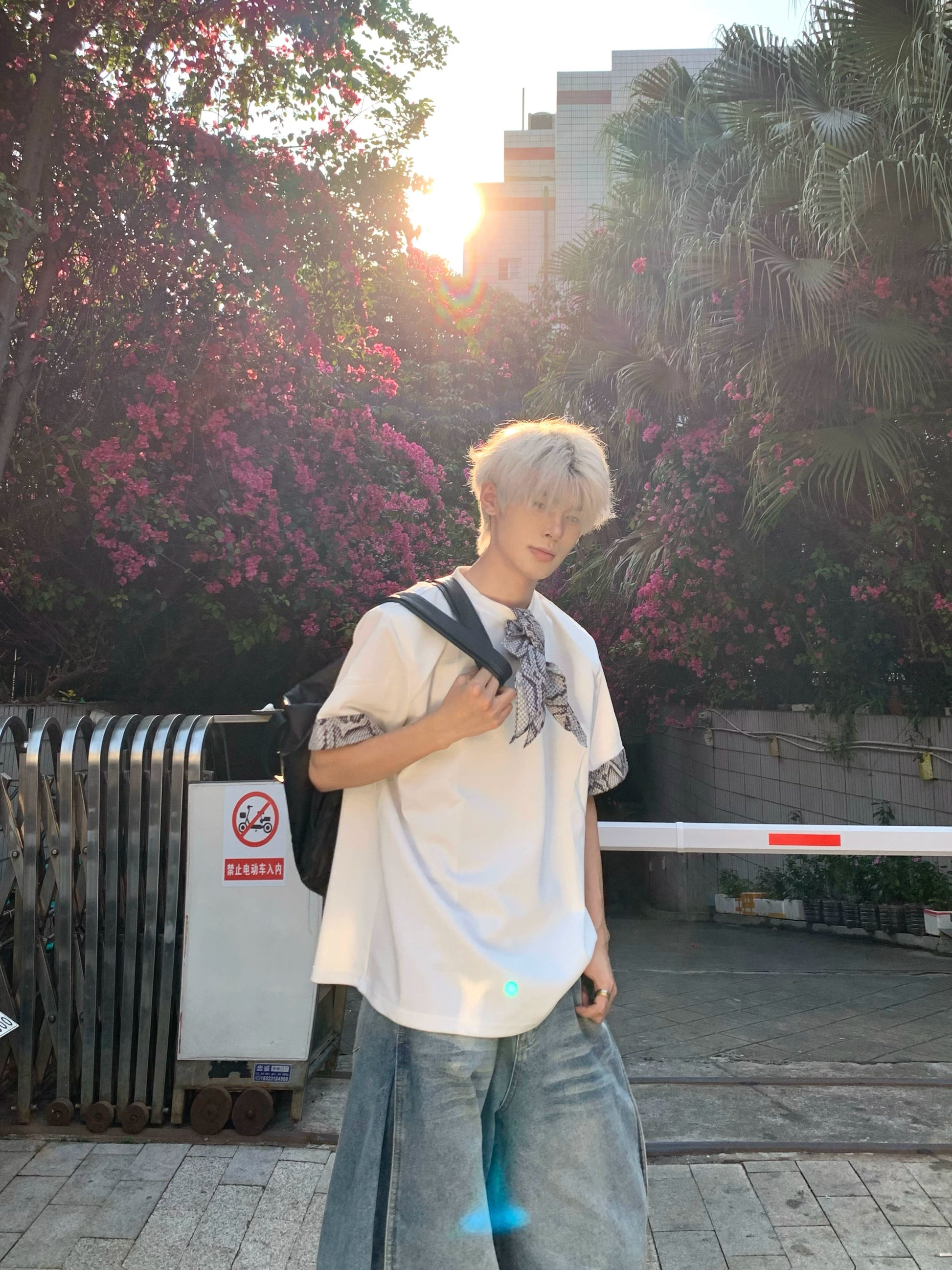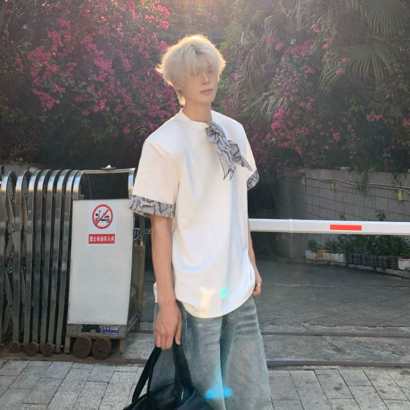 Snake Print Ribbon Contrast Short Sleeve T-Shirt WN19724