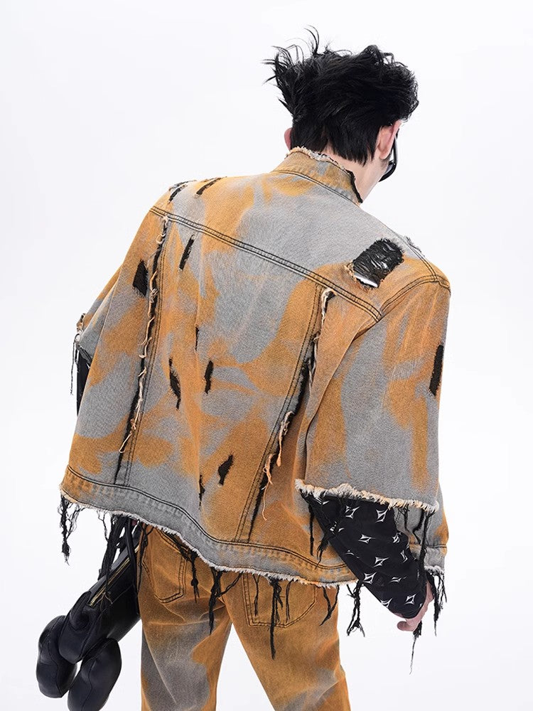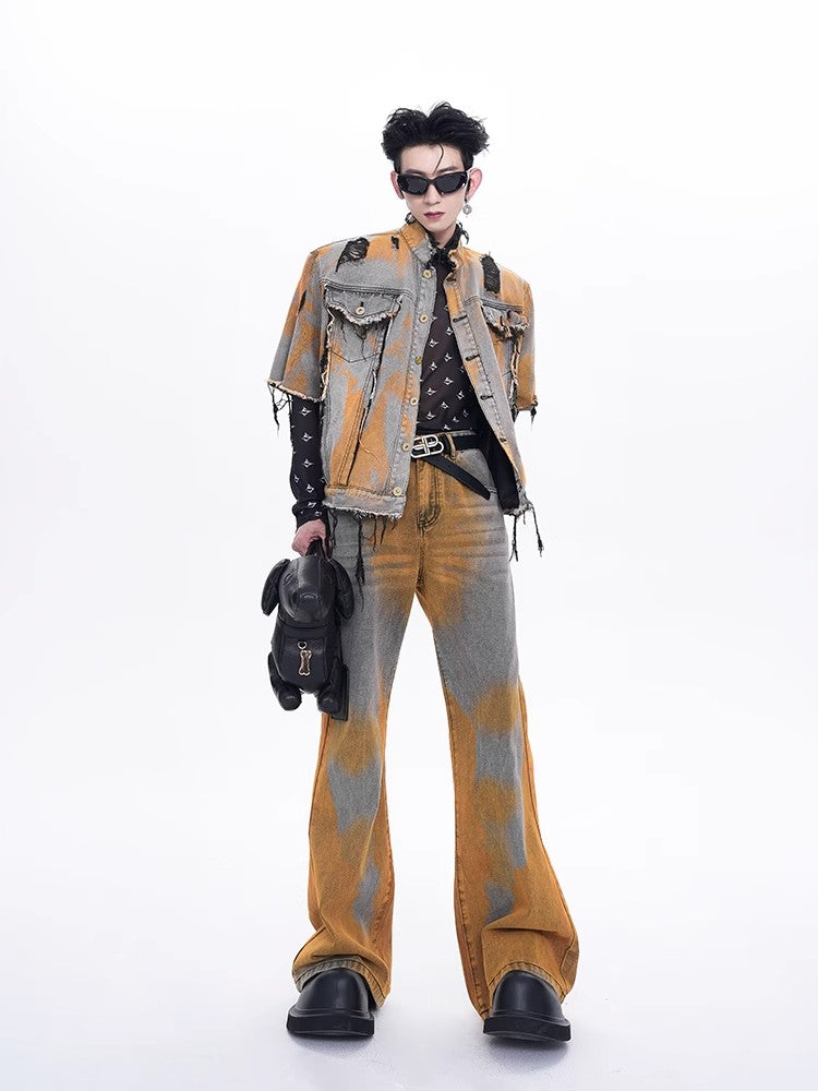 Gradient Short Sleeve Damage Denim Shirt Jacket & Micro Flare Denim Jeans Setup WN6913