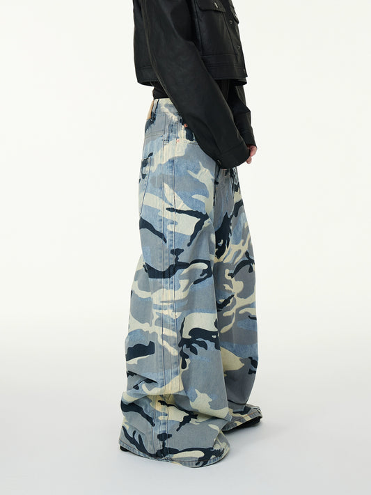 Camouflage Full Print Washed Wide Leg Baggy Dragging Denim Jeans WN16982