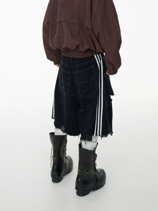 Washed Damage Fringe Wide Leg Three-Stripe Half Denim Jeans WN16960