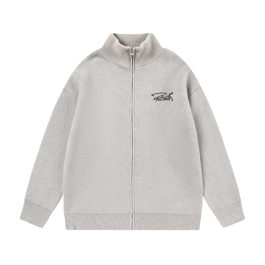 Letter Embroidery Zipper High-Neck Knit Cardigan WN11523