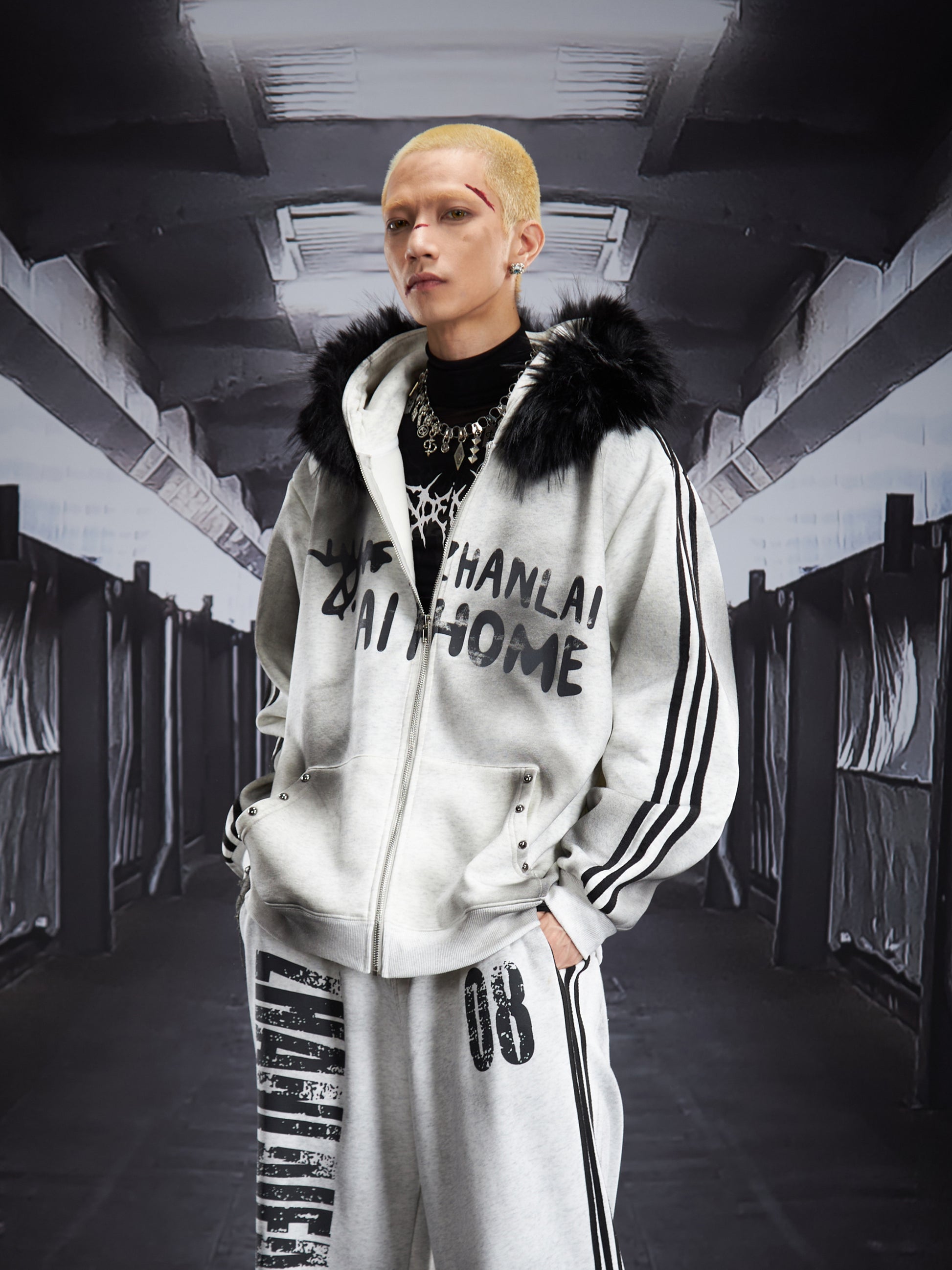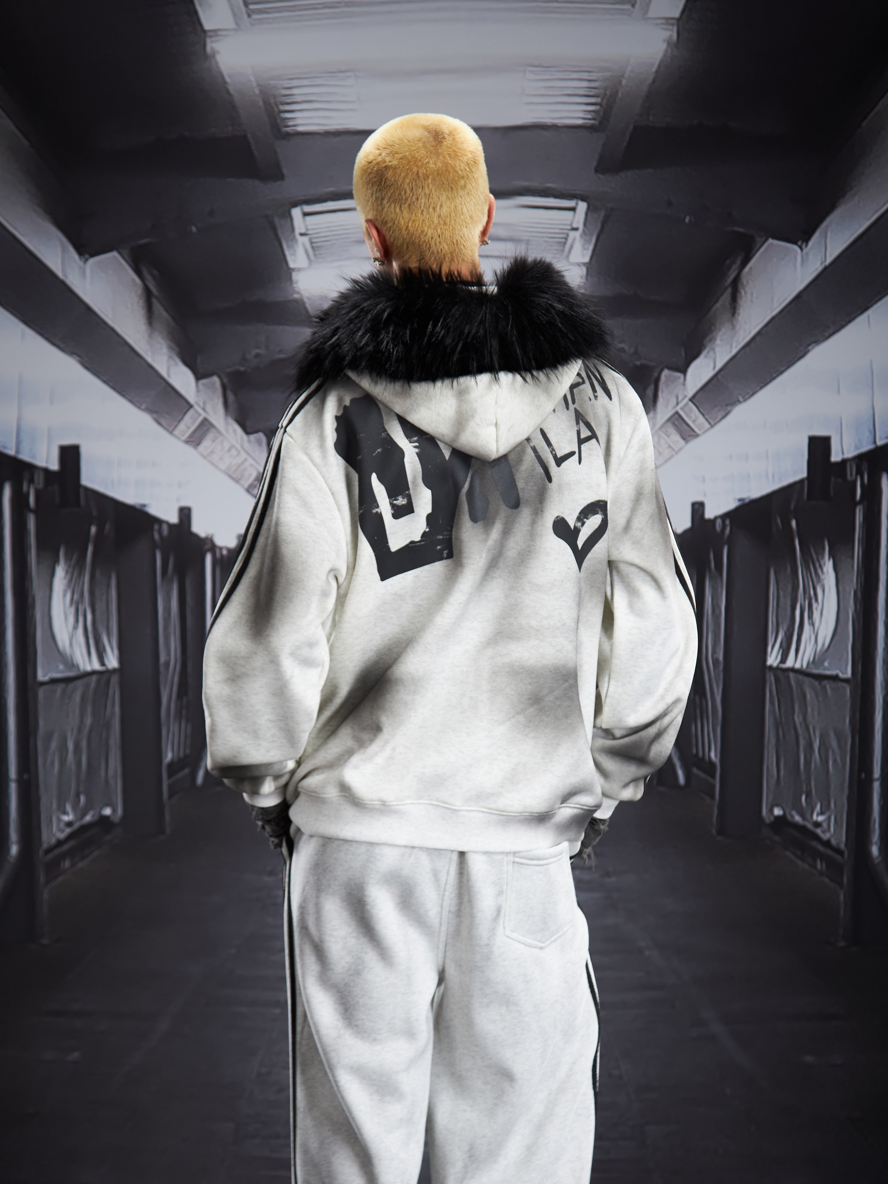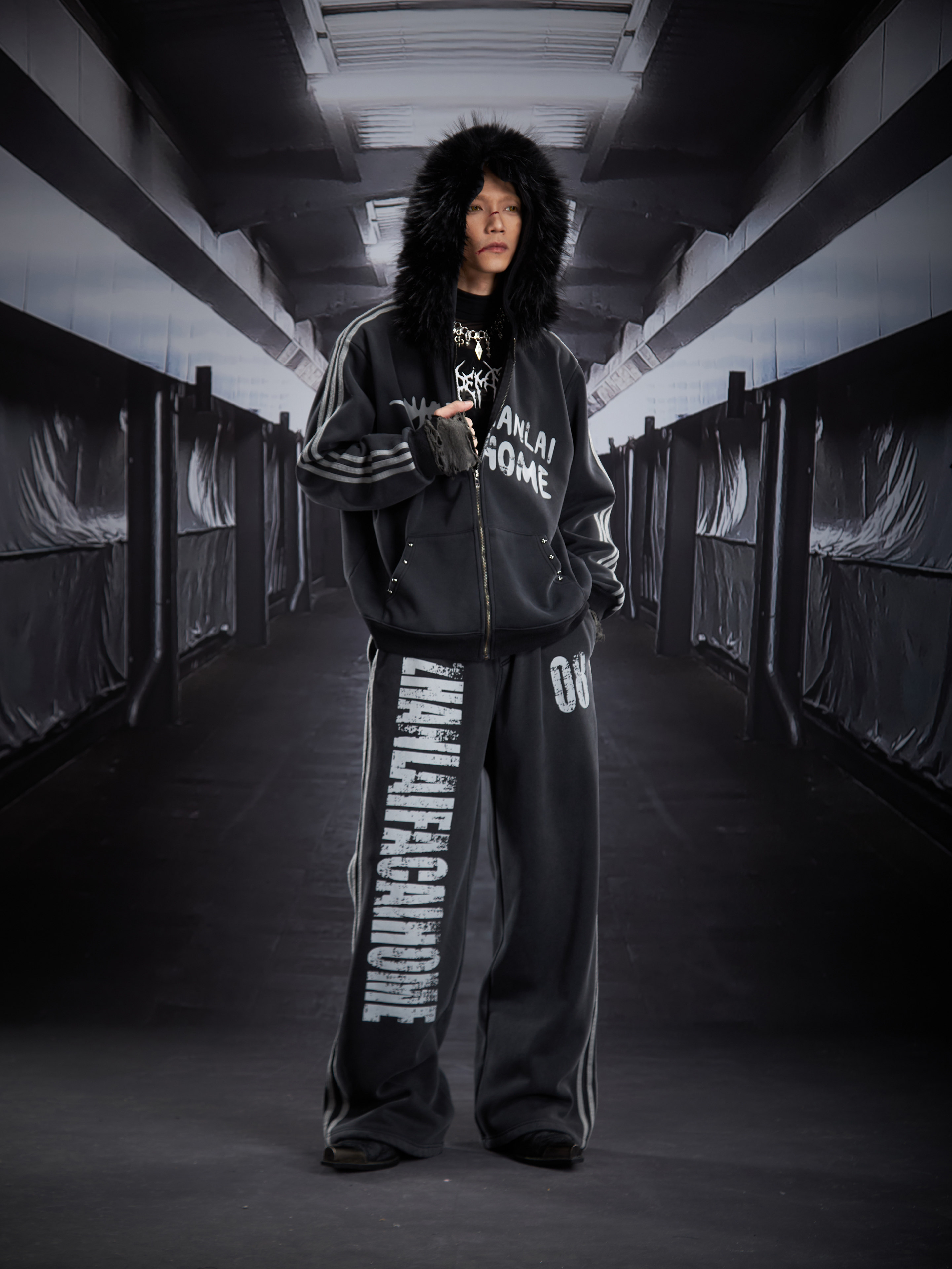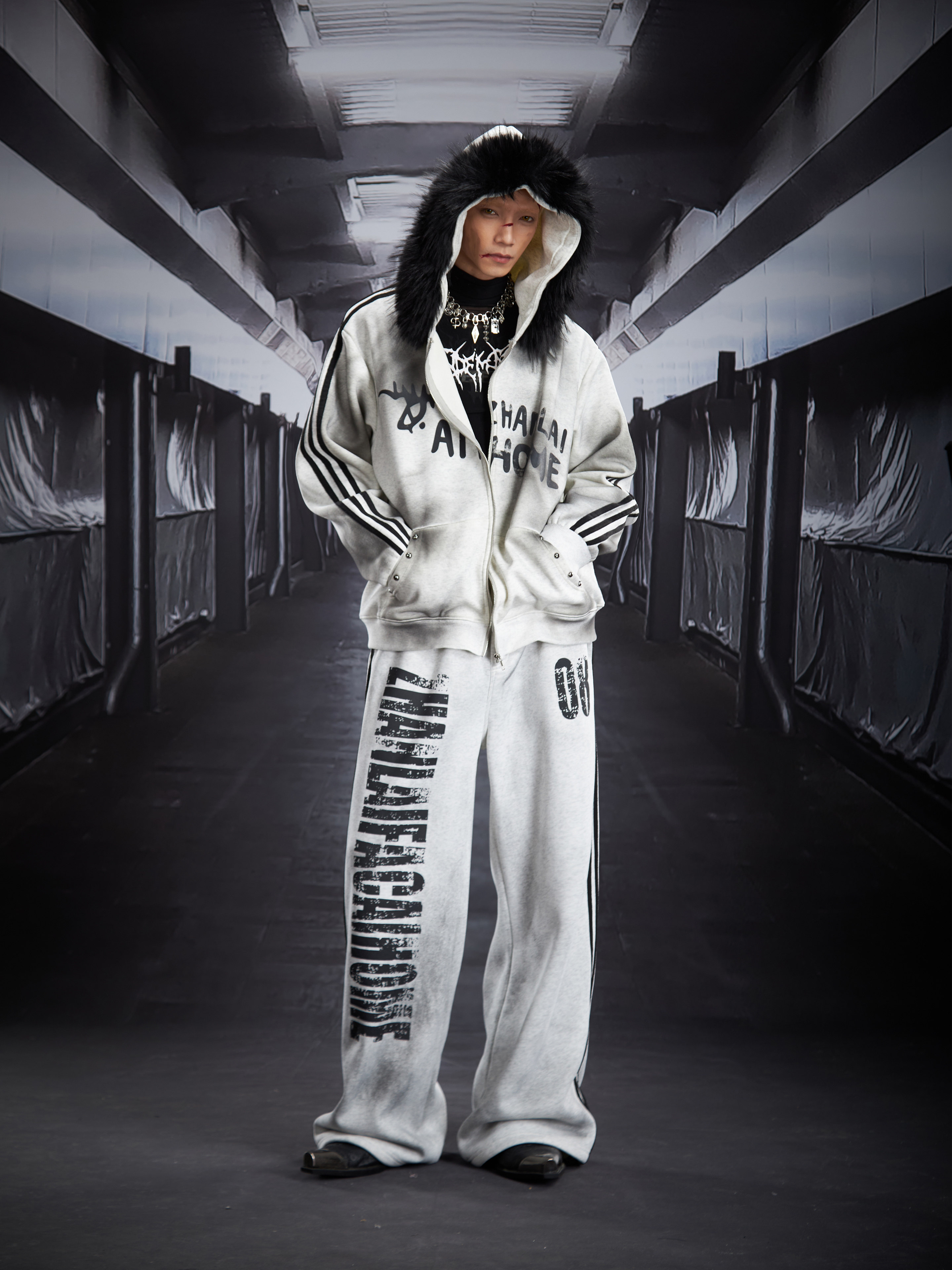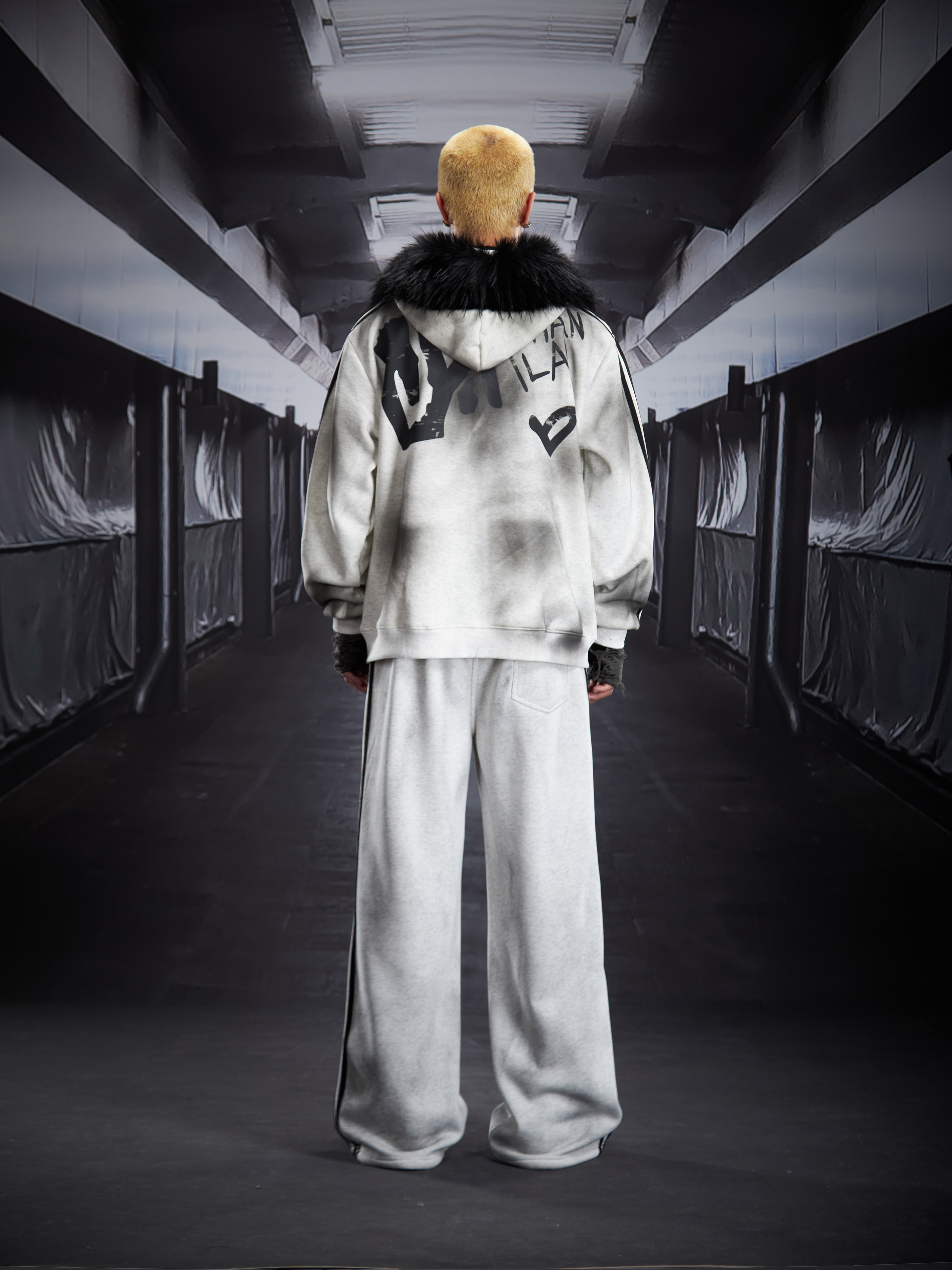 Print Fake Fur Zipper Hoodie & Print Wide Leg Sweatpants Setup WN22792