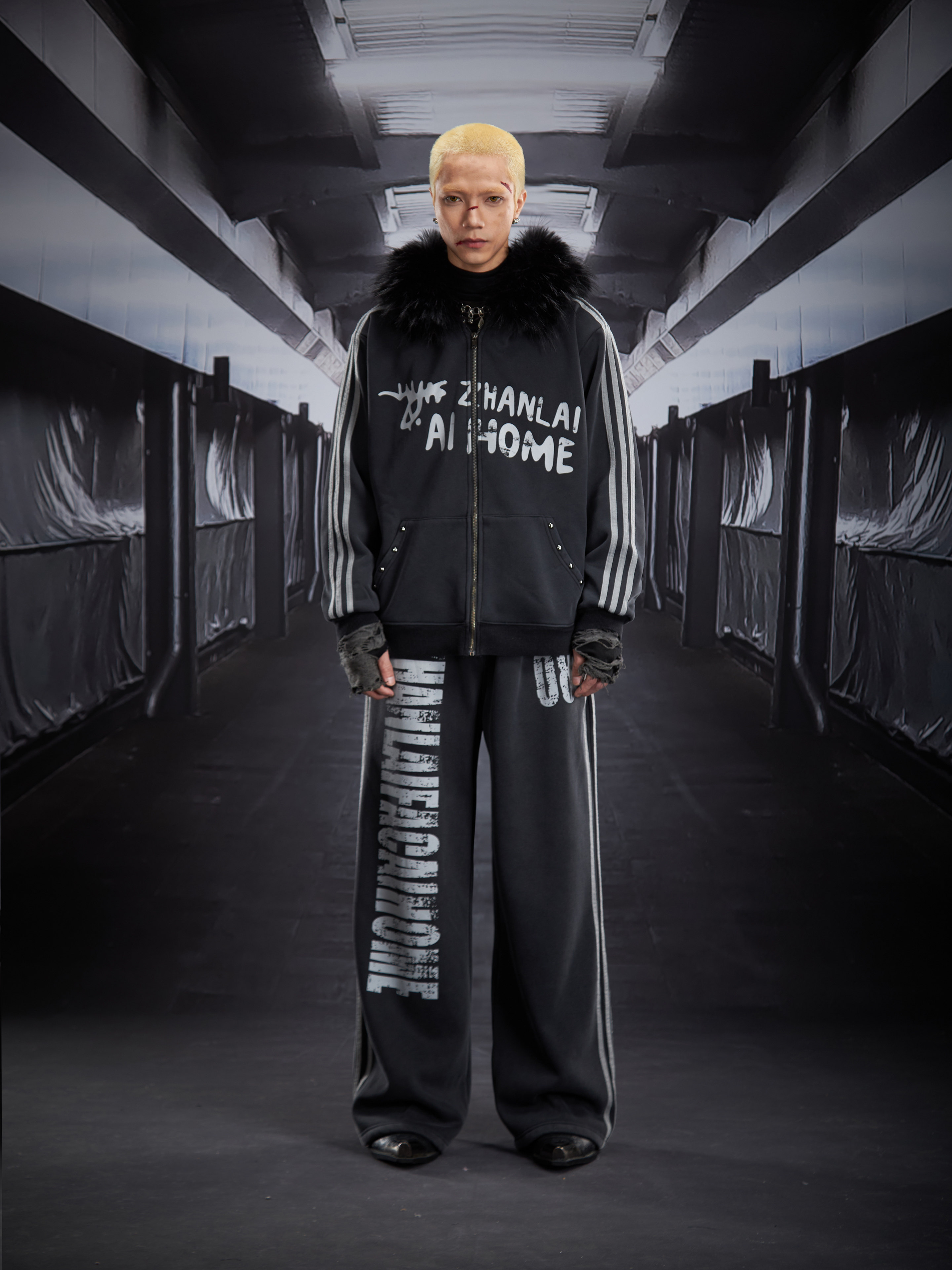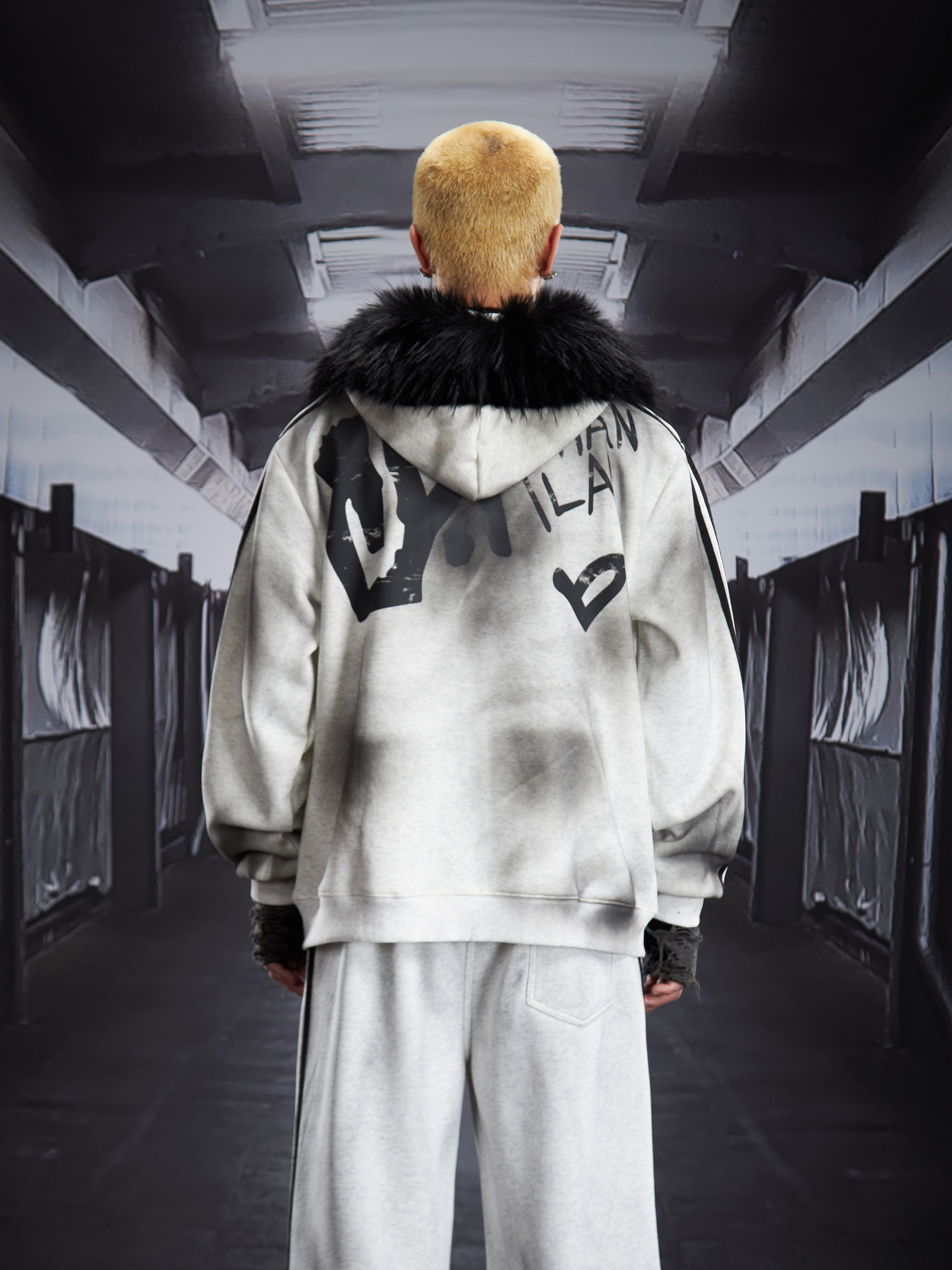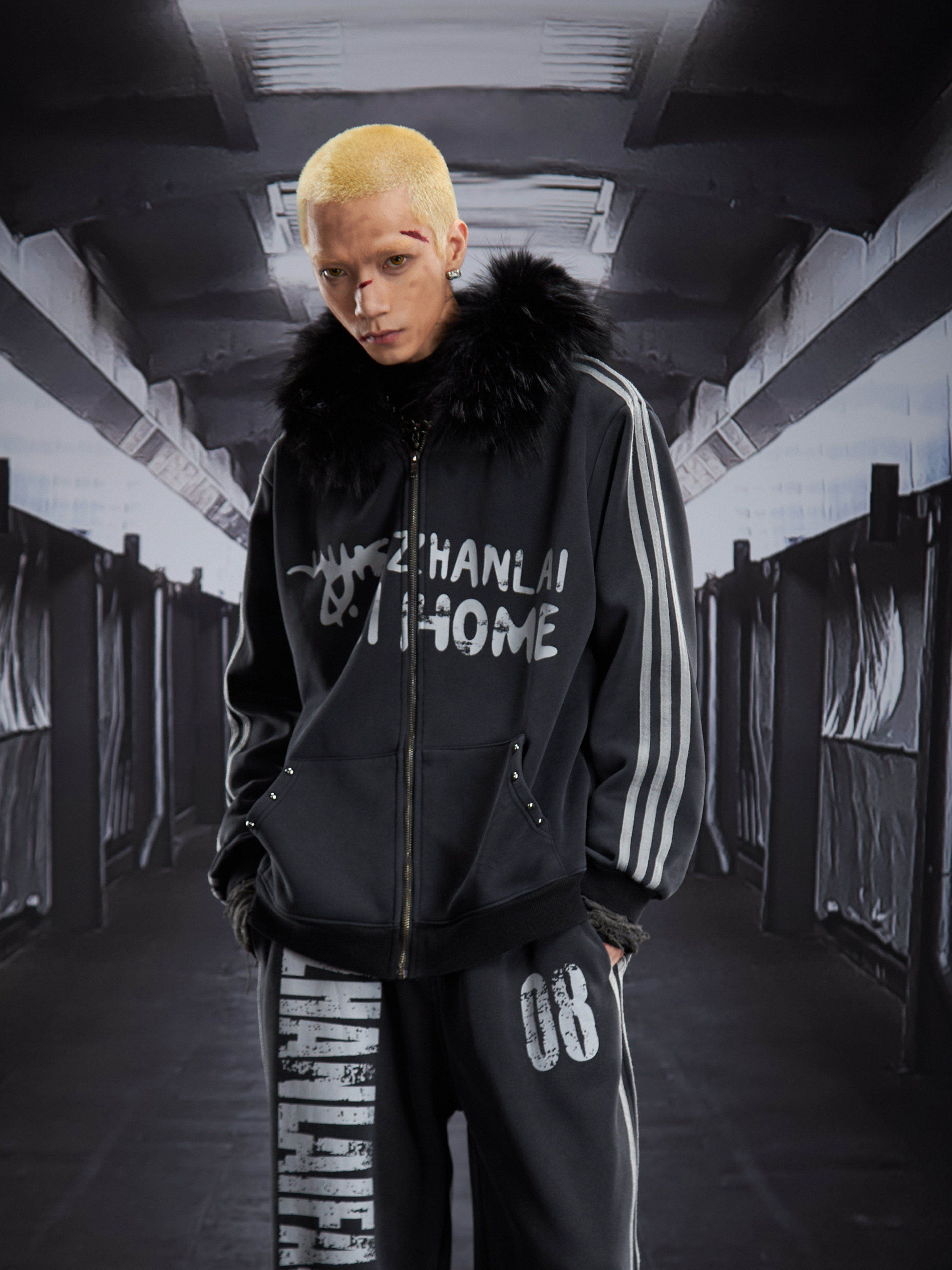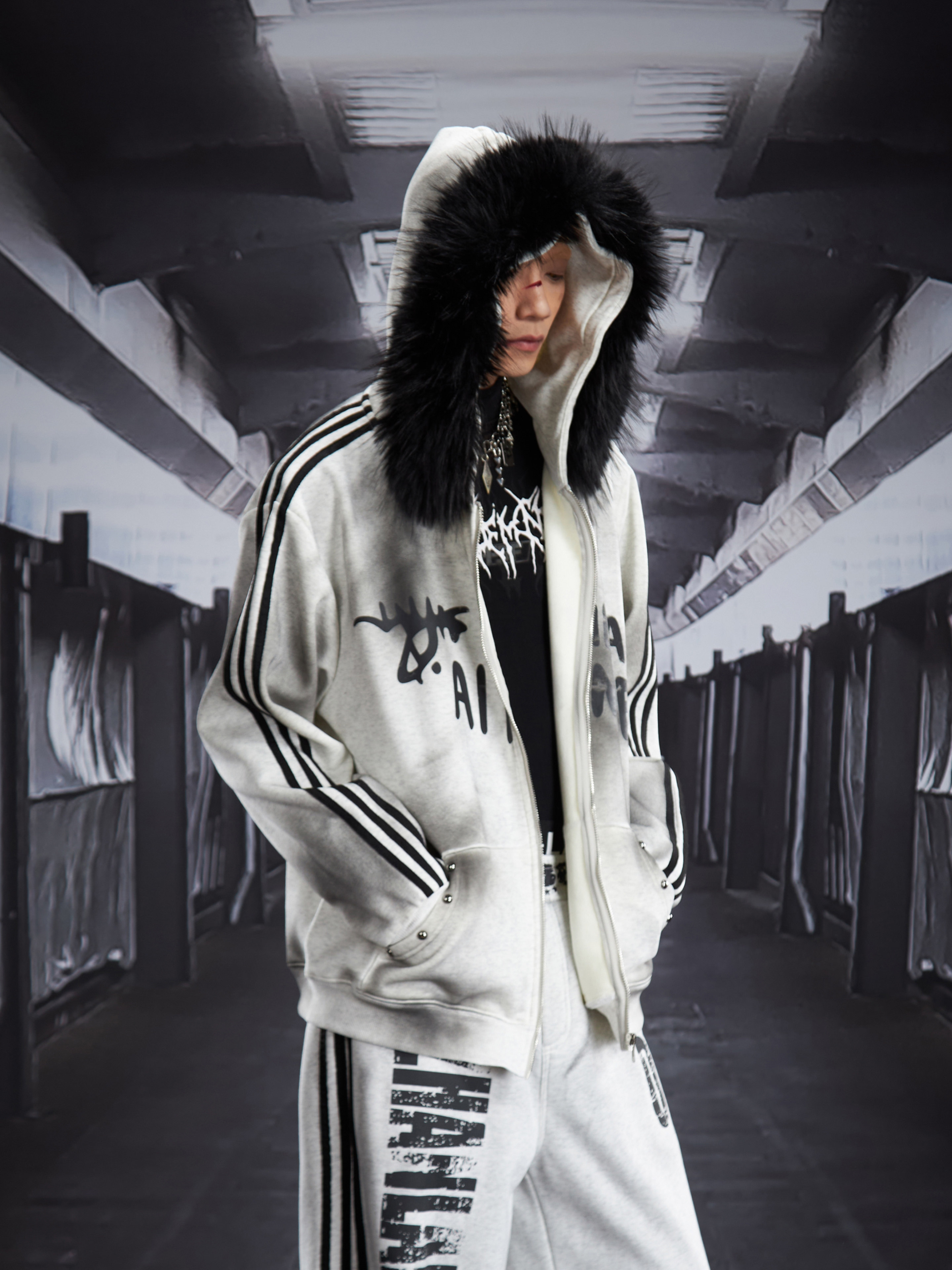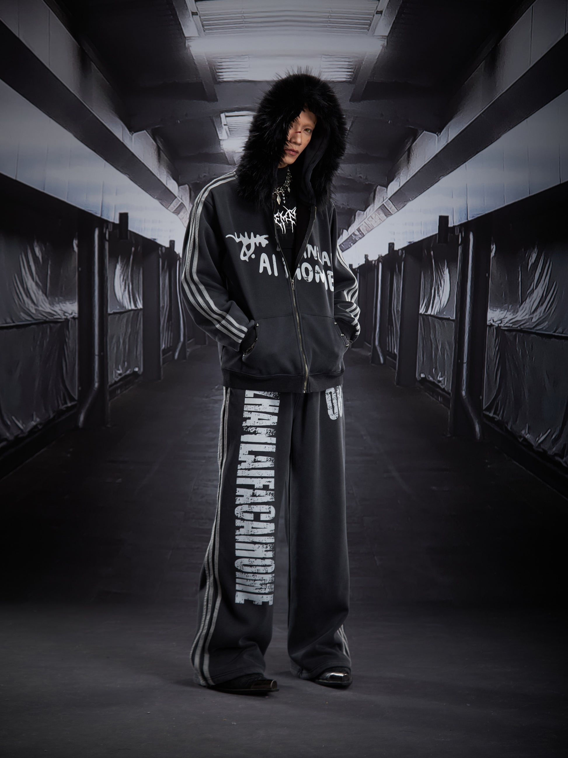 Print Fake Fur Zipper Hoodie & Print Wide Leg Sweatpants Setup WN22792