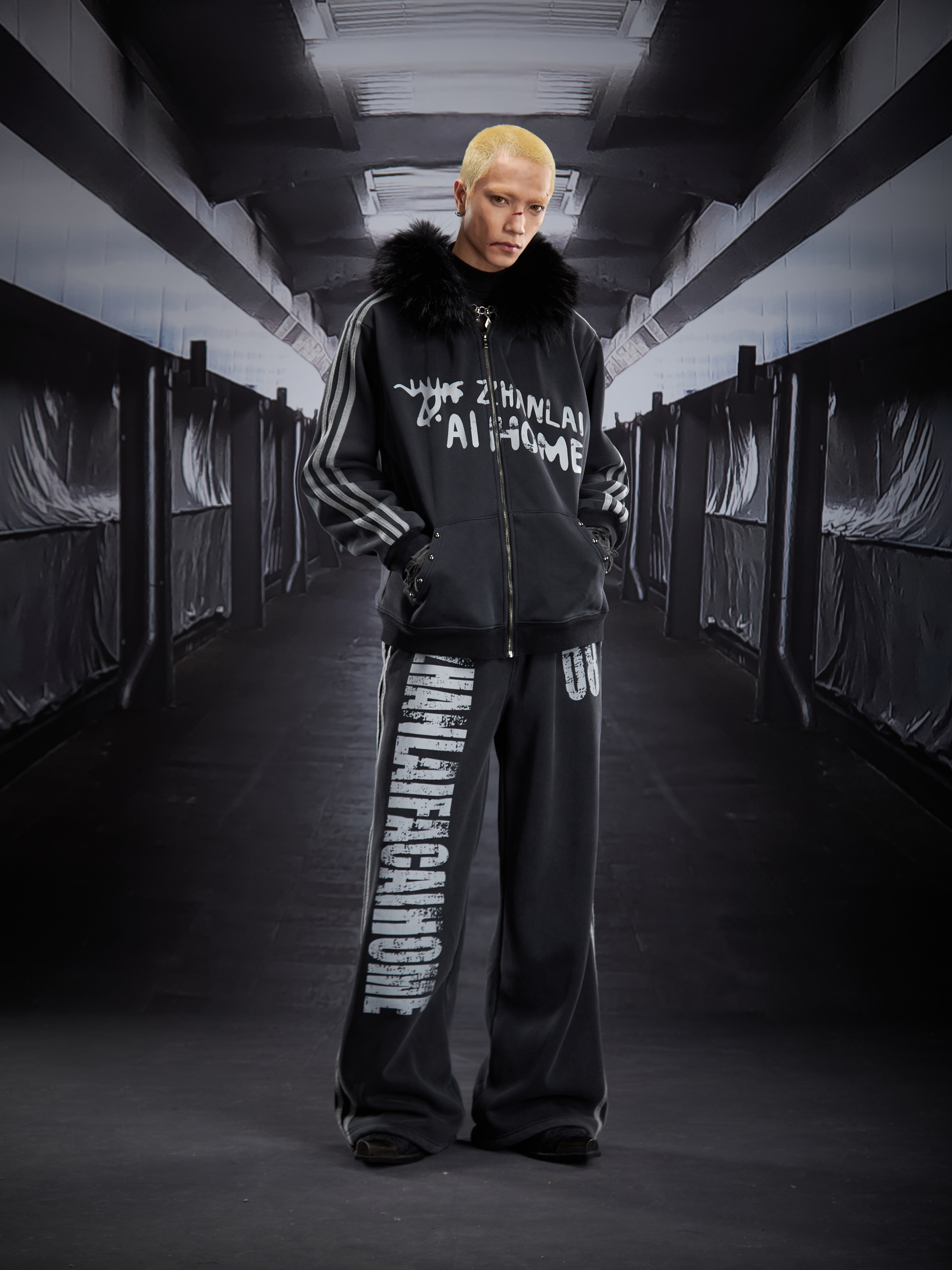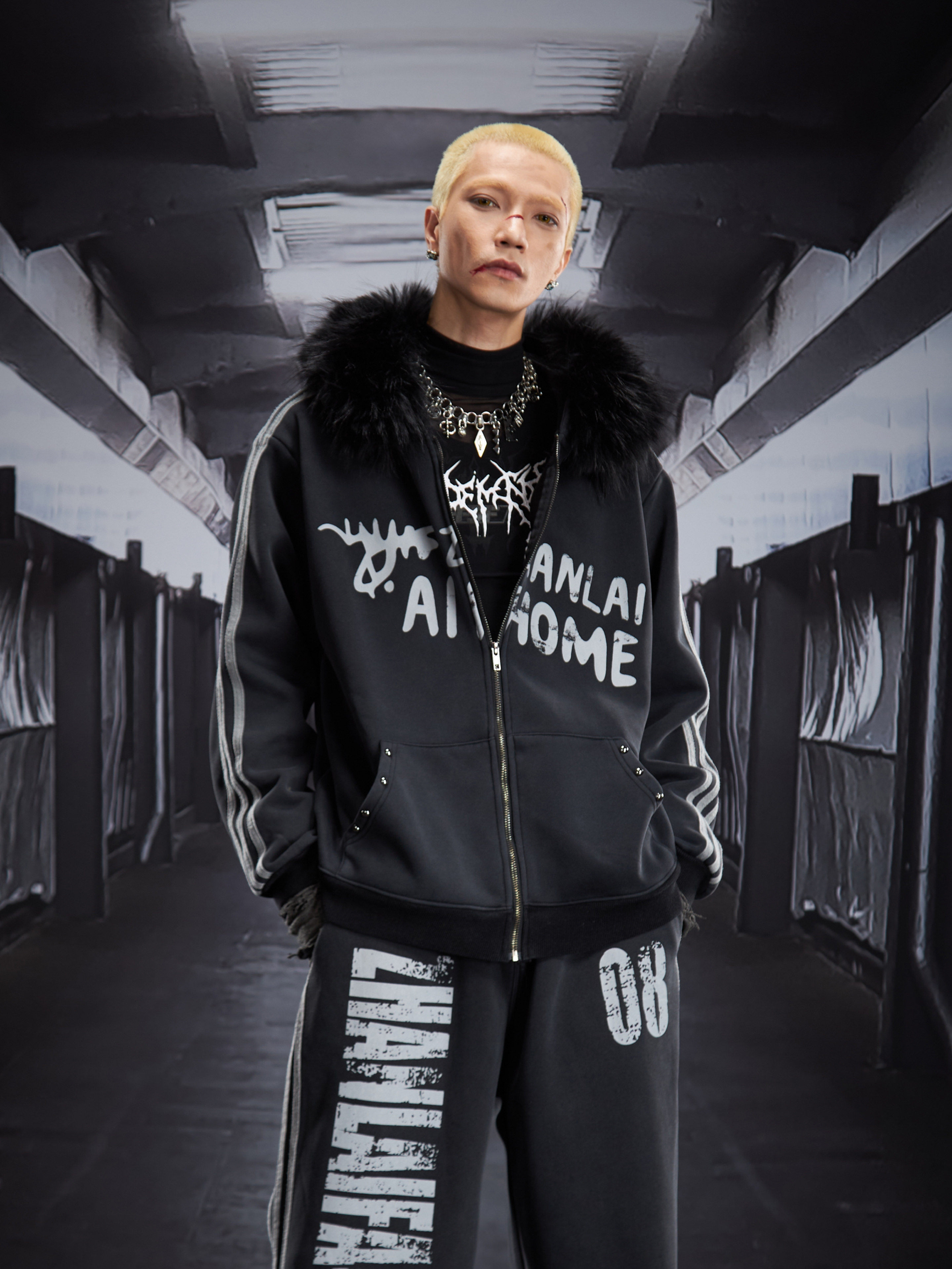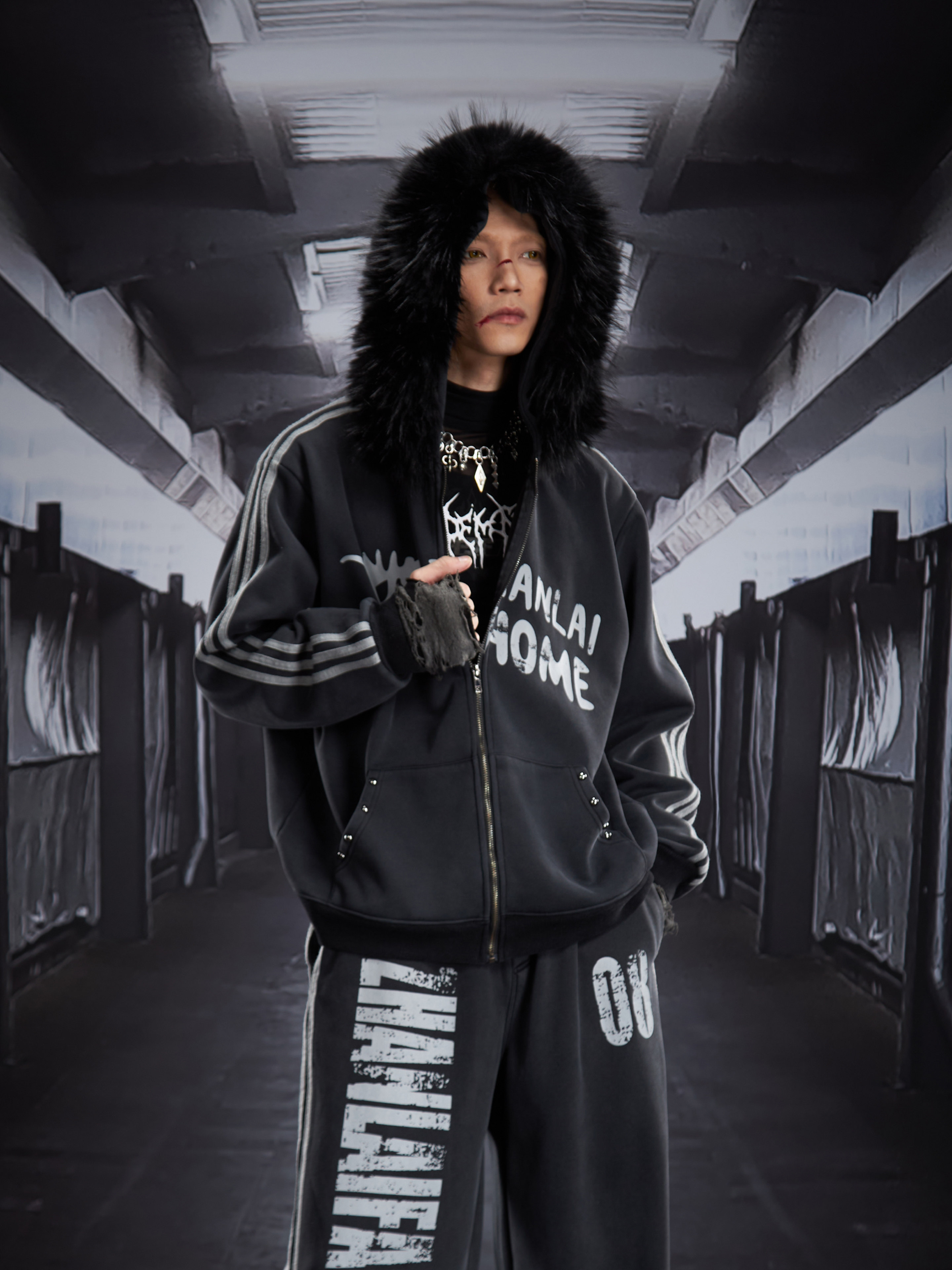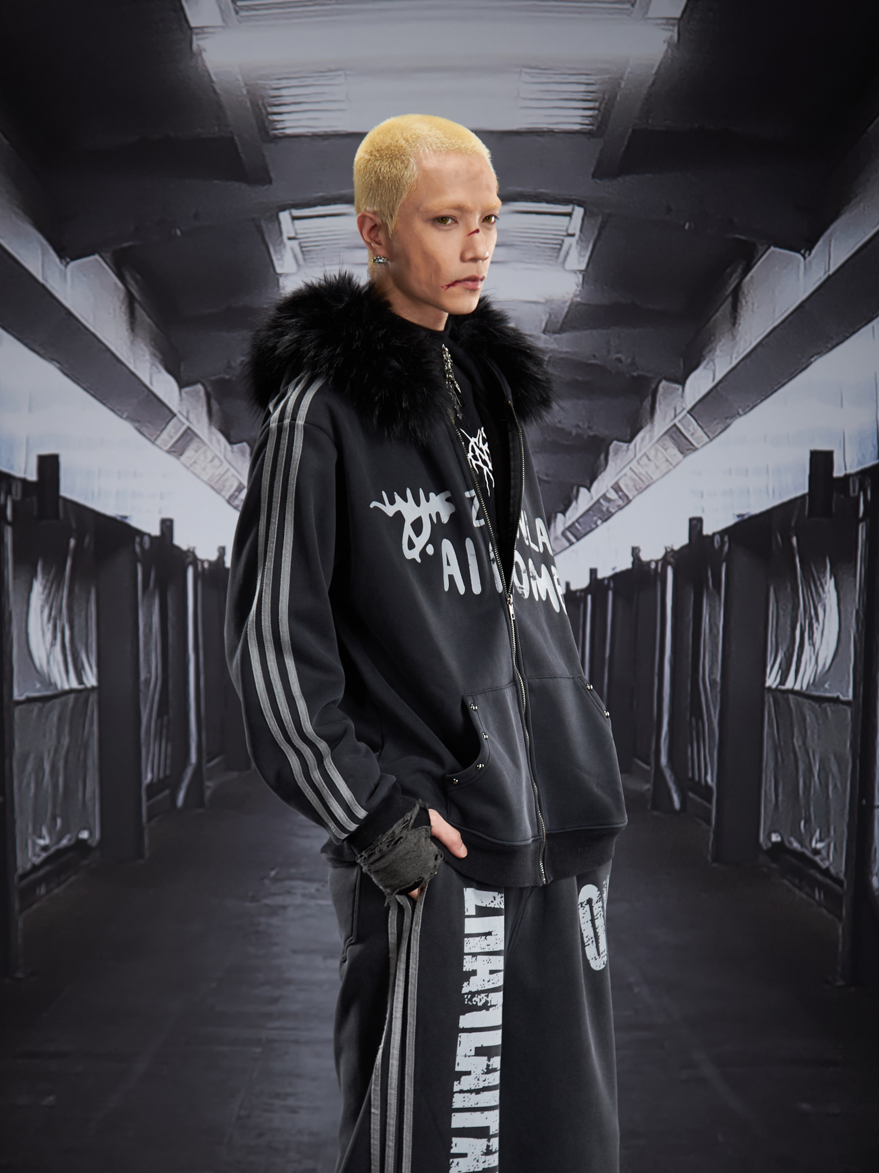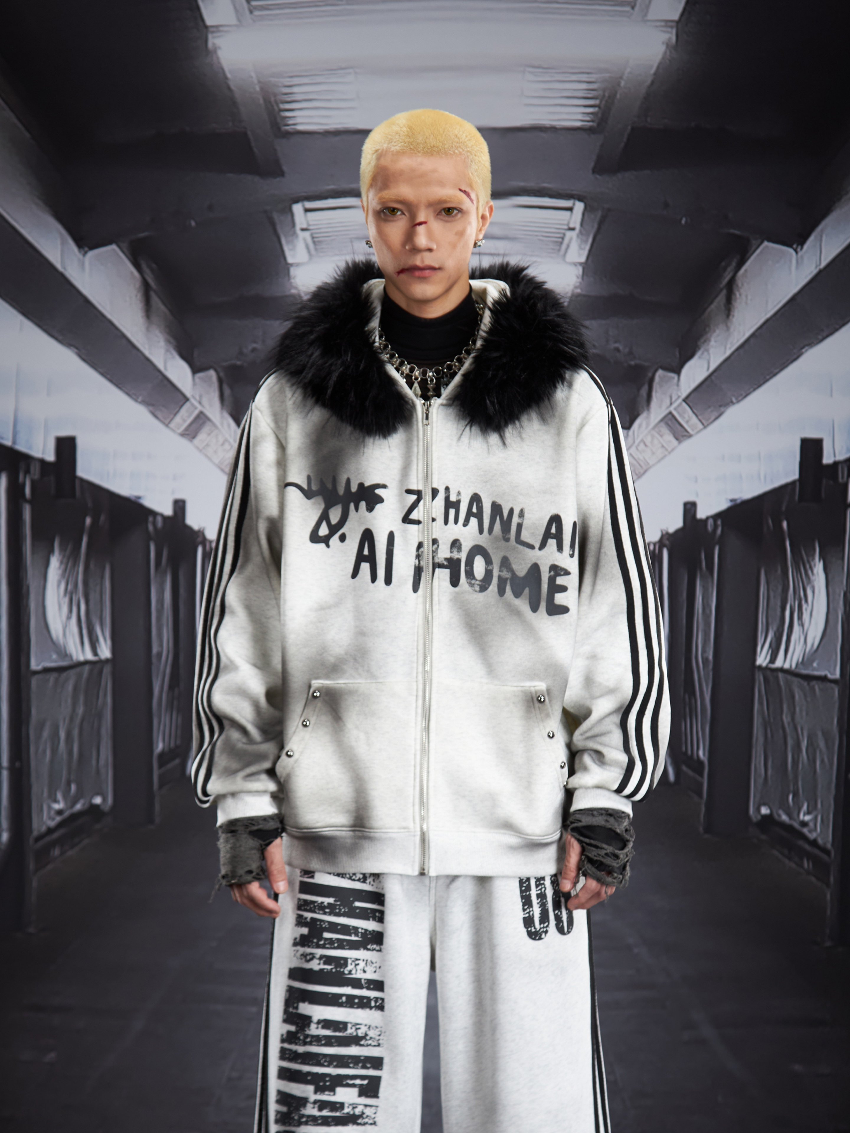Print Fake Fur Zipper Hoodie & Print Wide Leg Sweatpants Setup WN22792