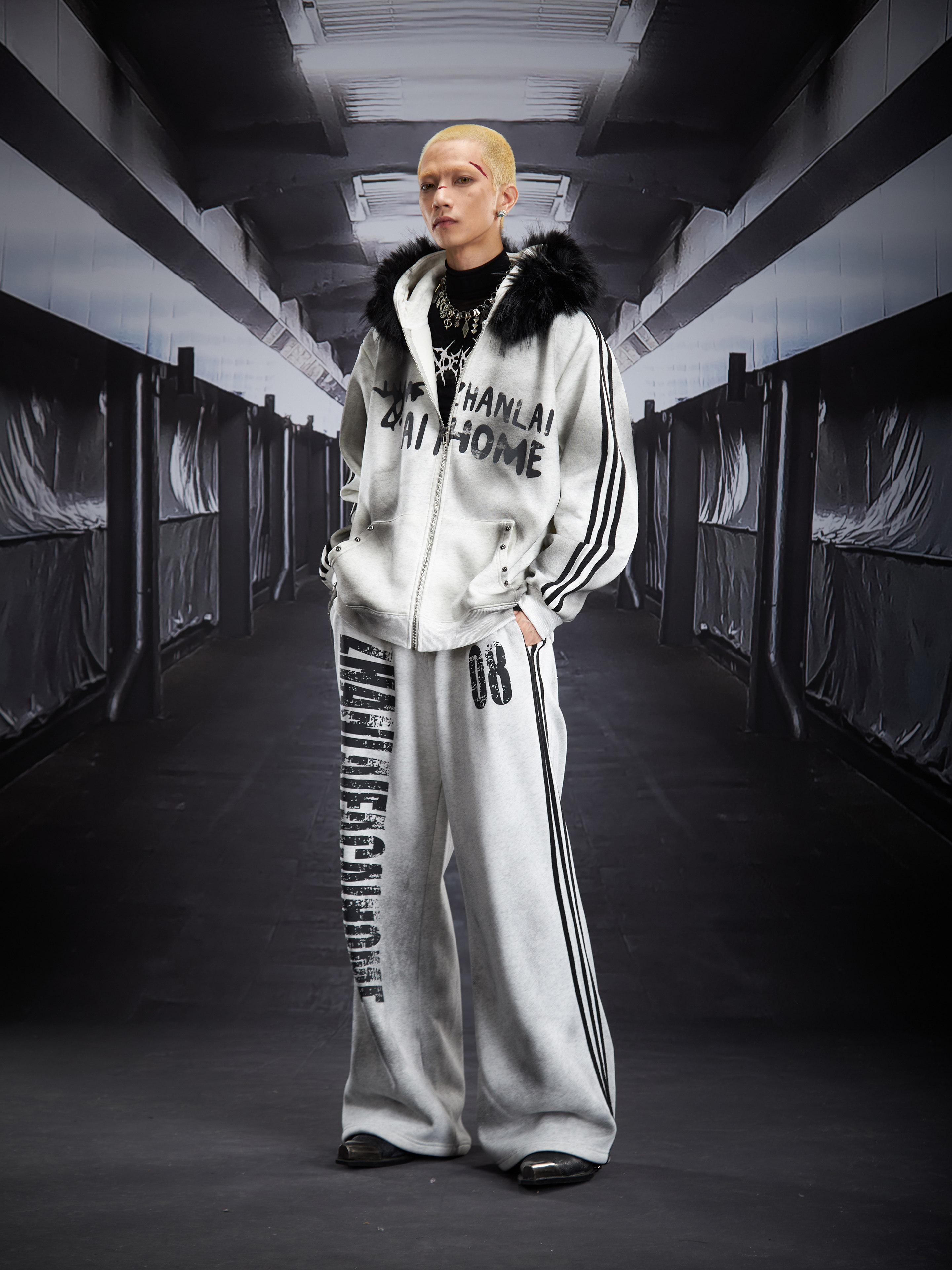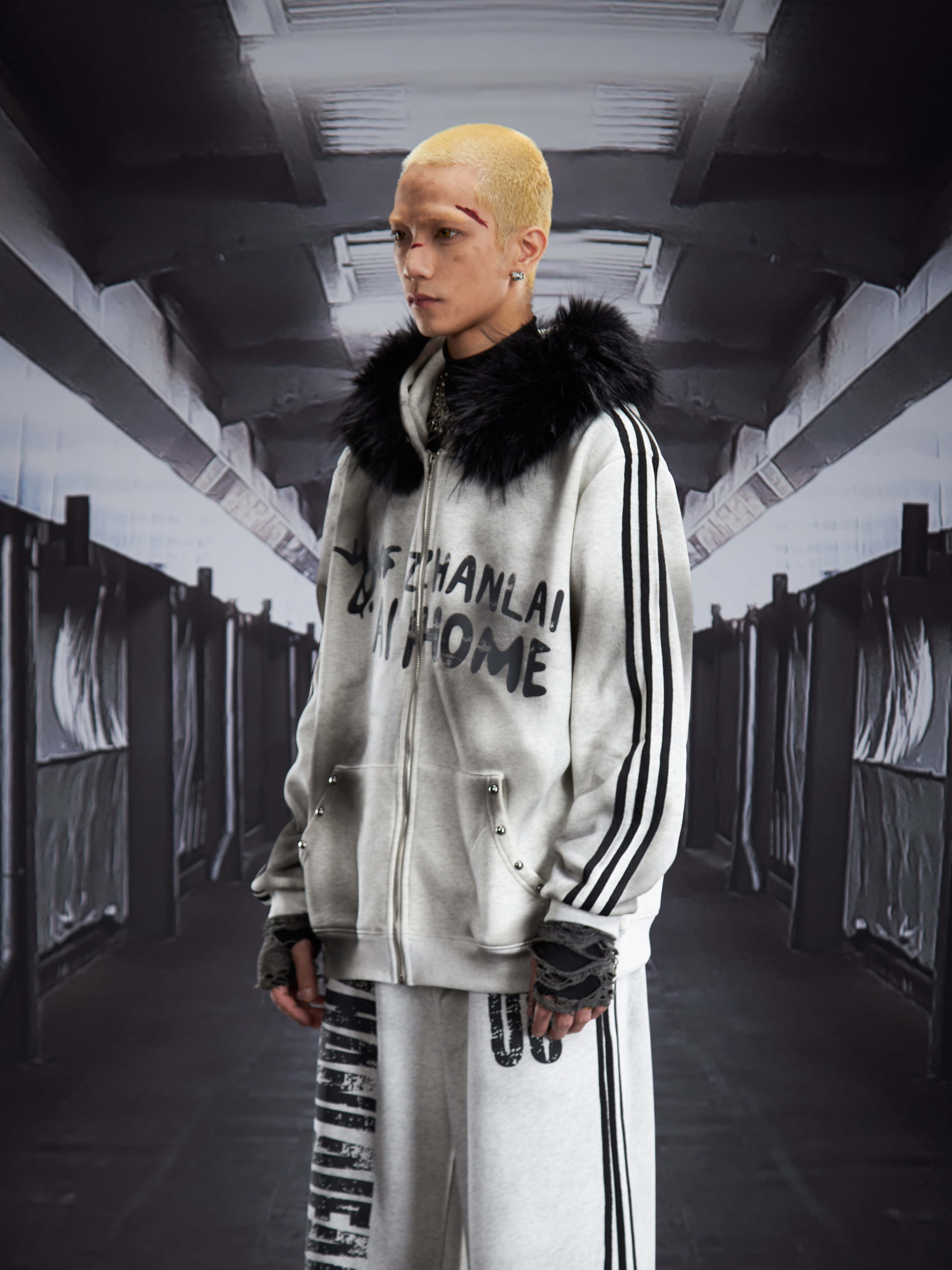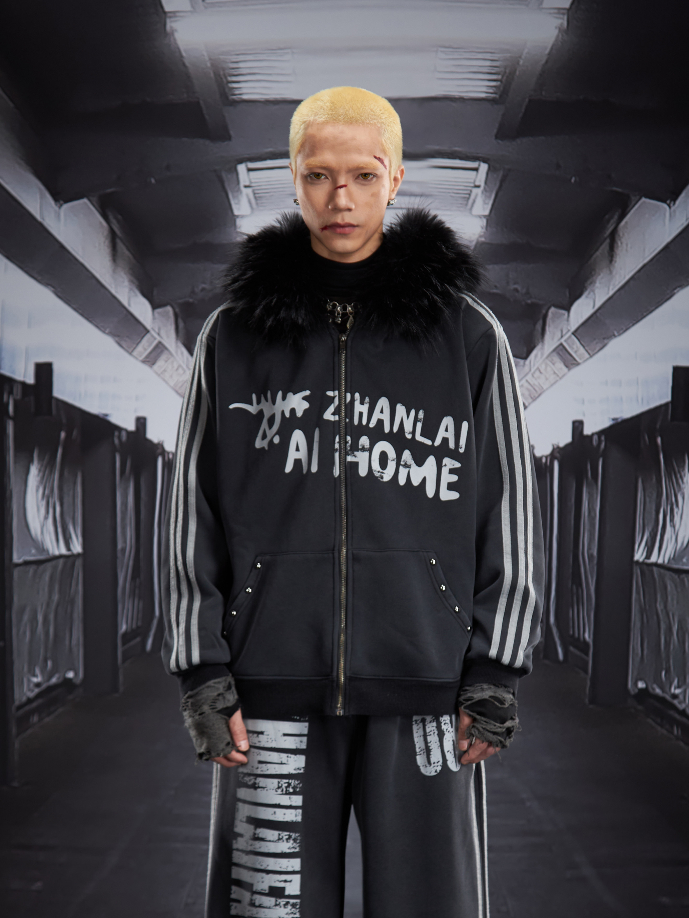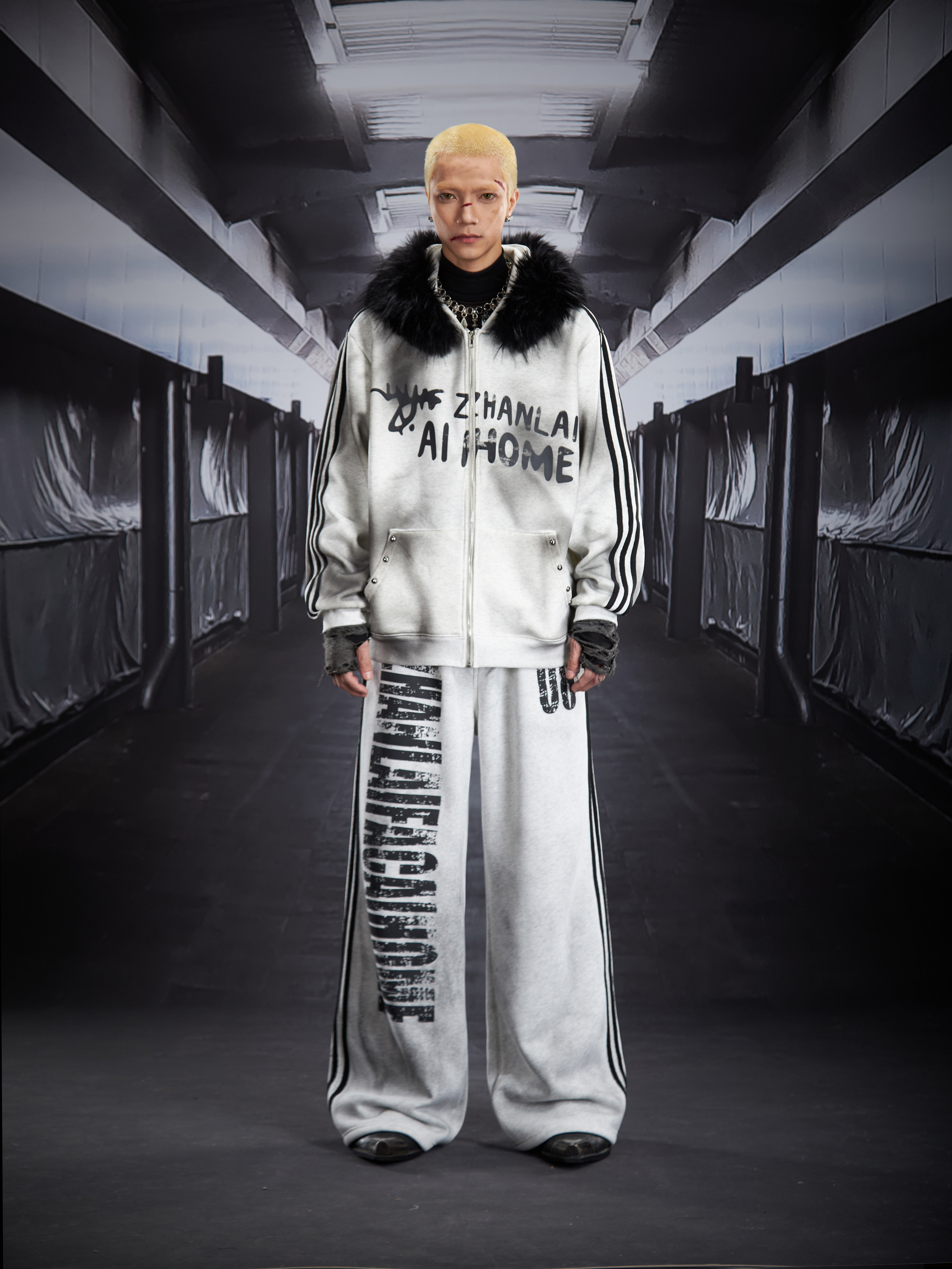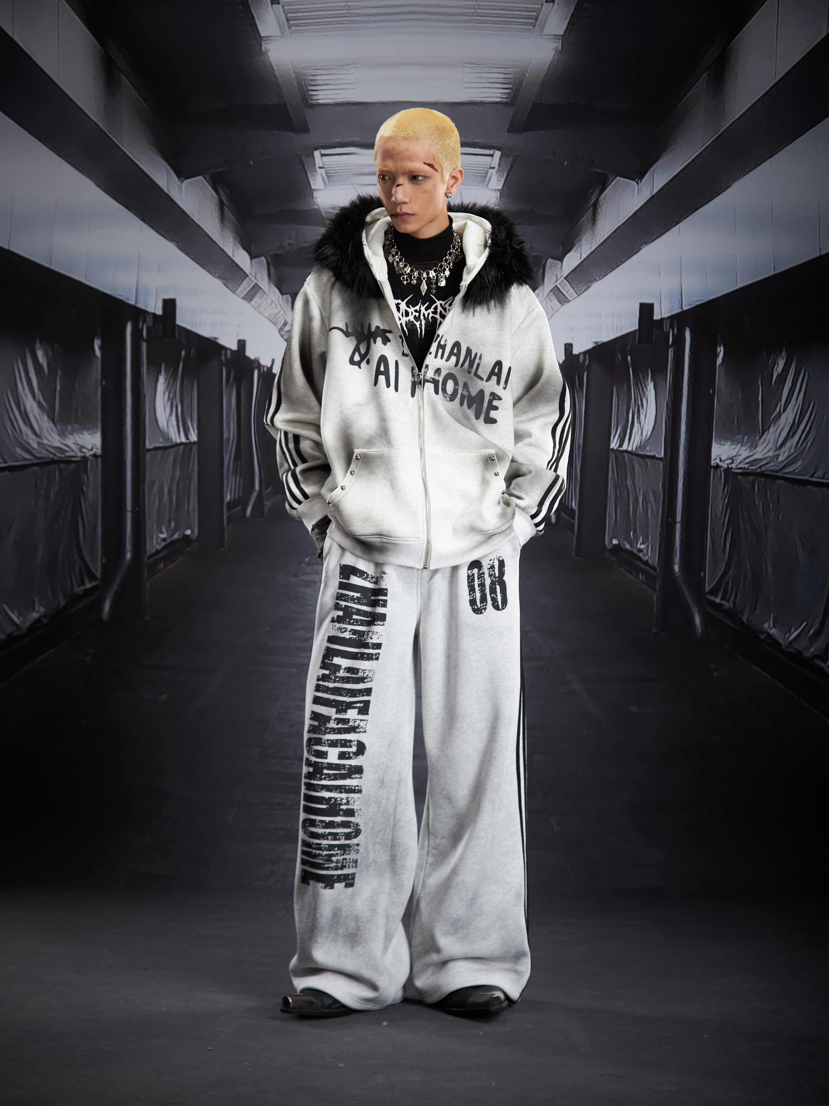 Print Fake Fur Zipper Hoodie & Print Wide Leg Sweatpants Setup WN22792