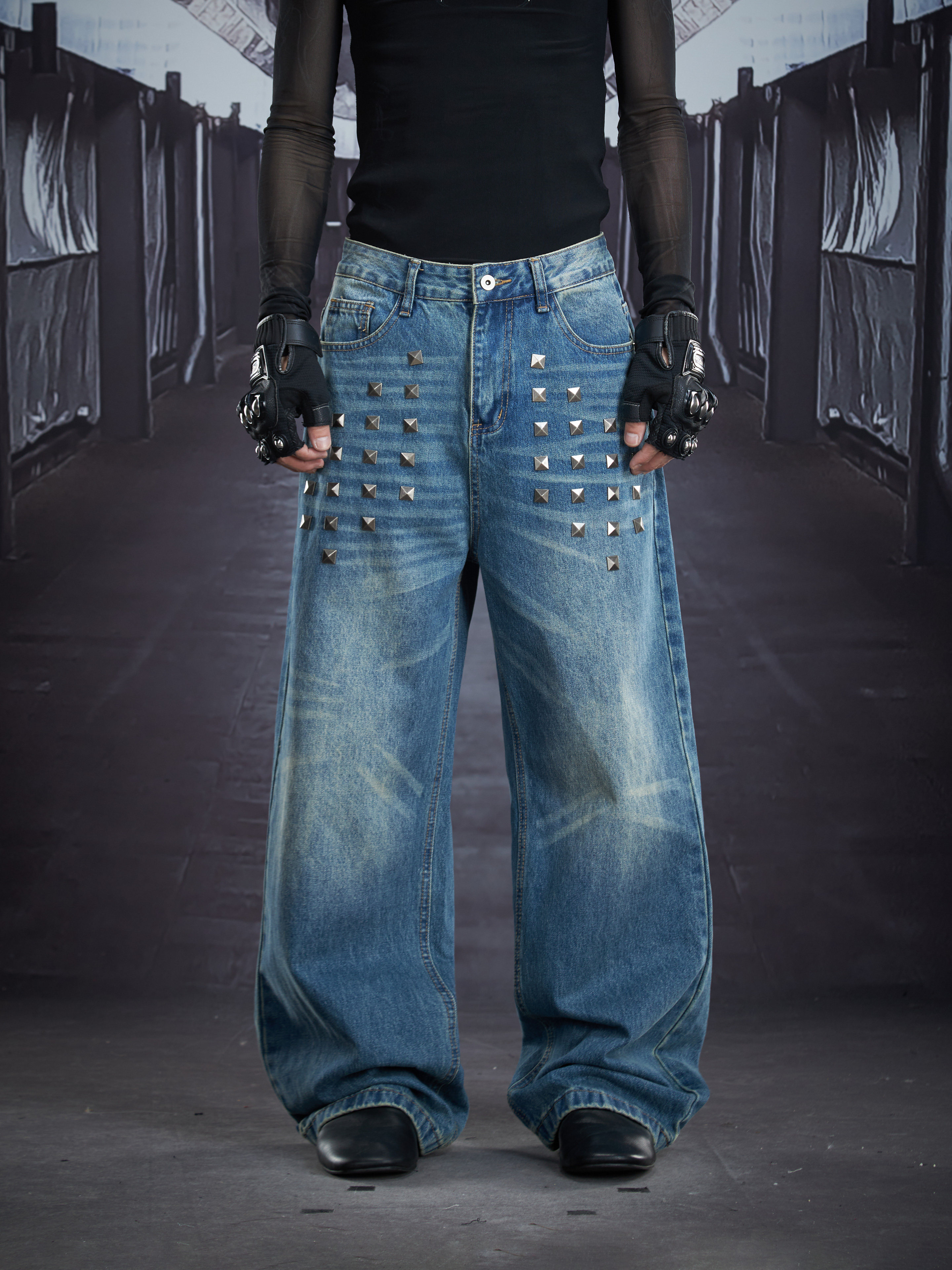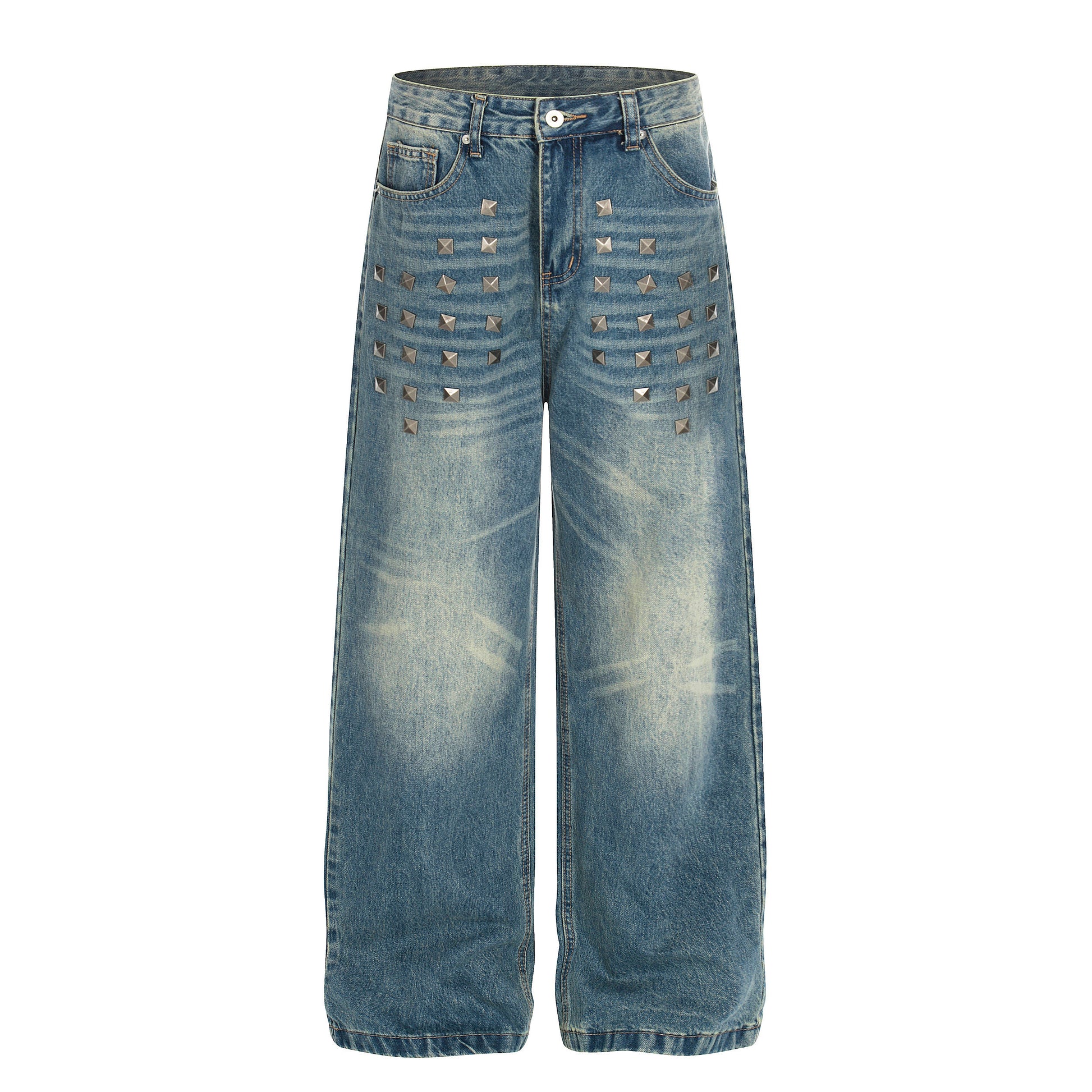 Heavy Metal Stud Whisker Wash Straight Denim Jeans WN22883