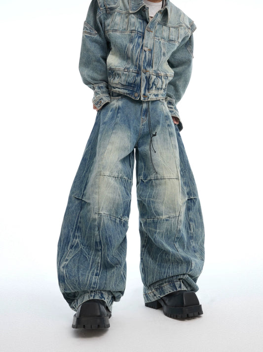 Heavyweight Side Pleats Washed Wide-Leg Denim Jeans WN14935
