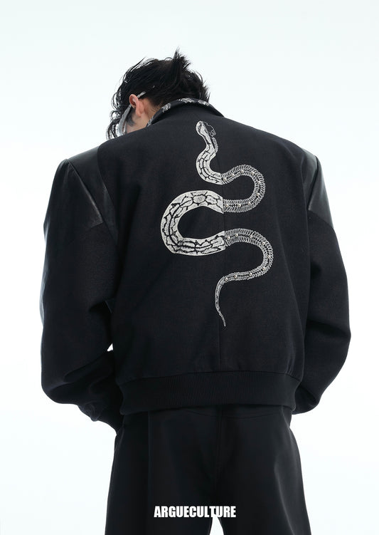 Snake Pattern Patchwork Studs Embroidery PU Leather Jacket WN14917