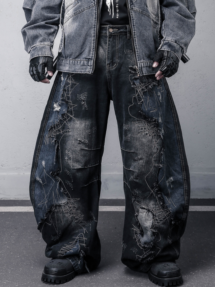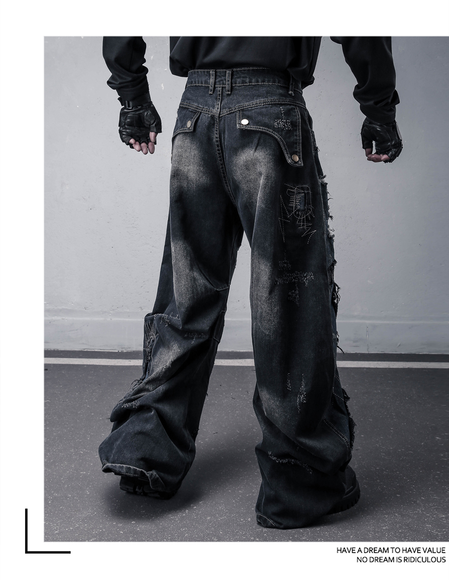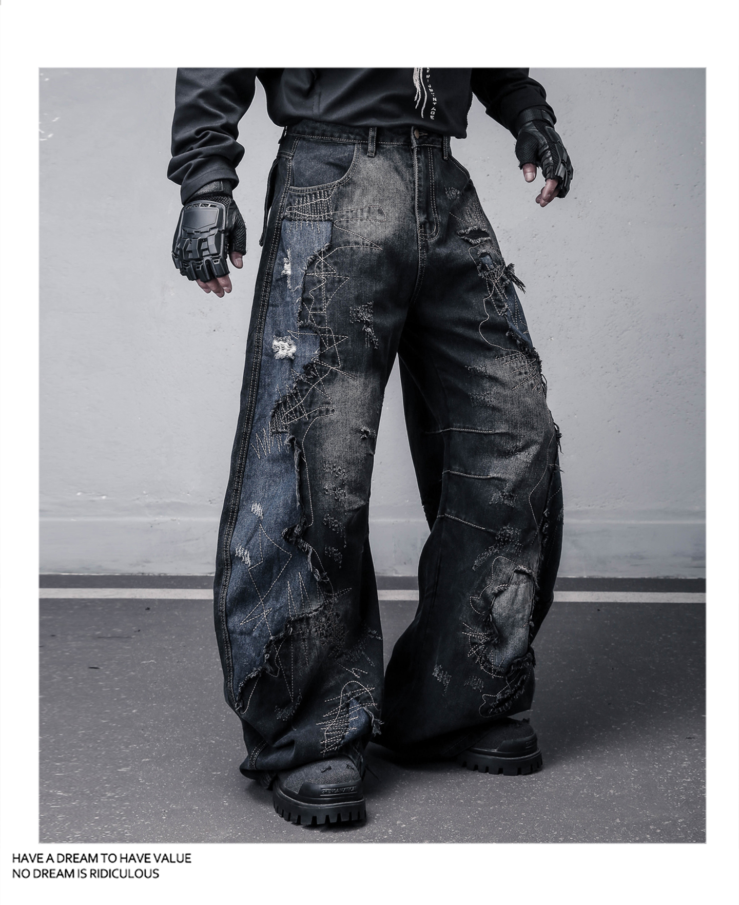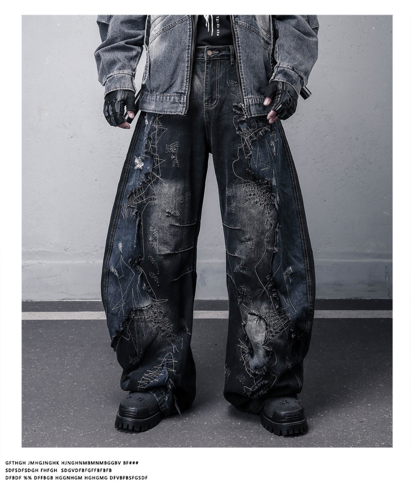 Wash Damage Embroidery Wide Leg Denim Jeans WN22359