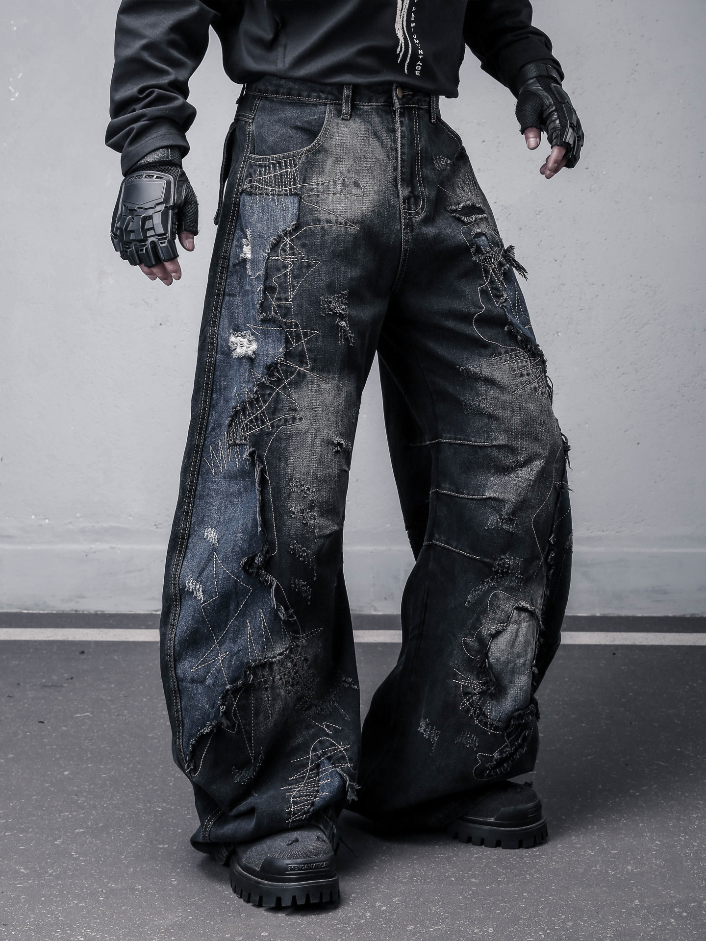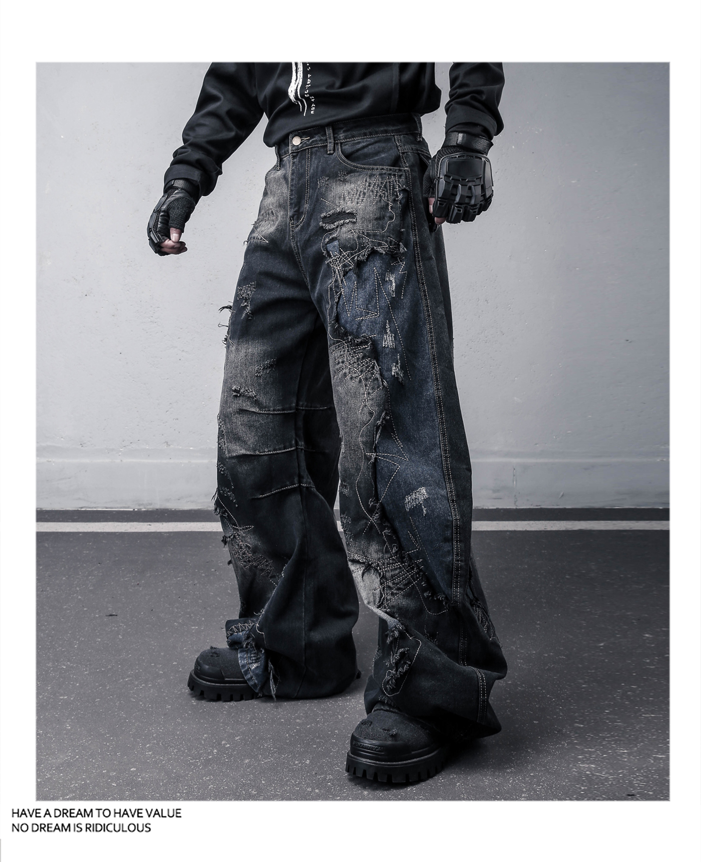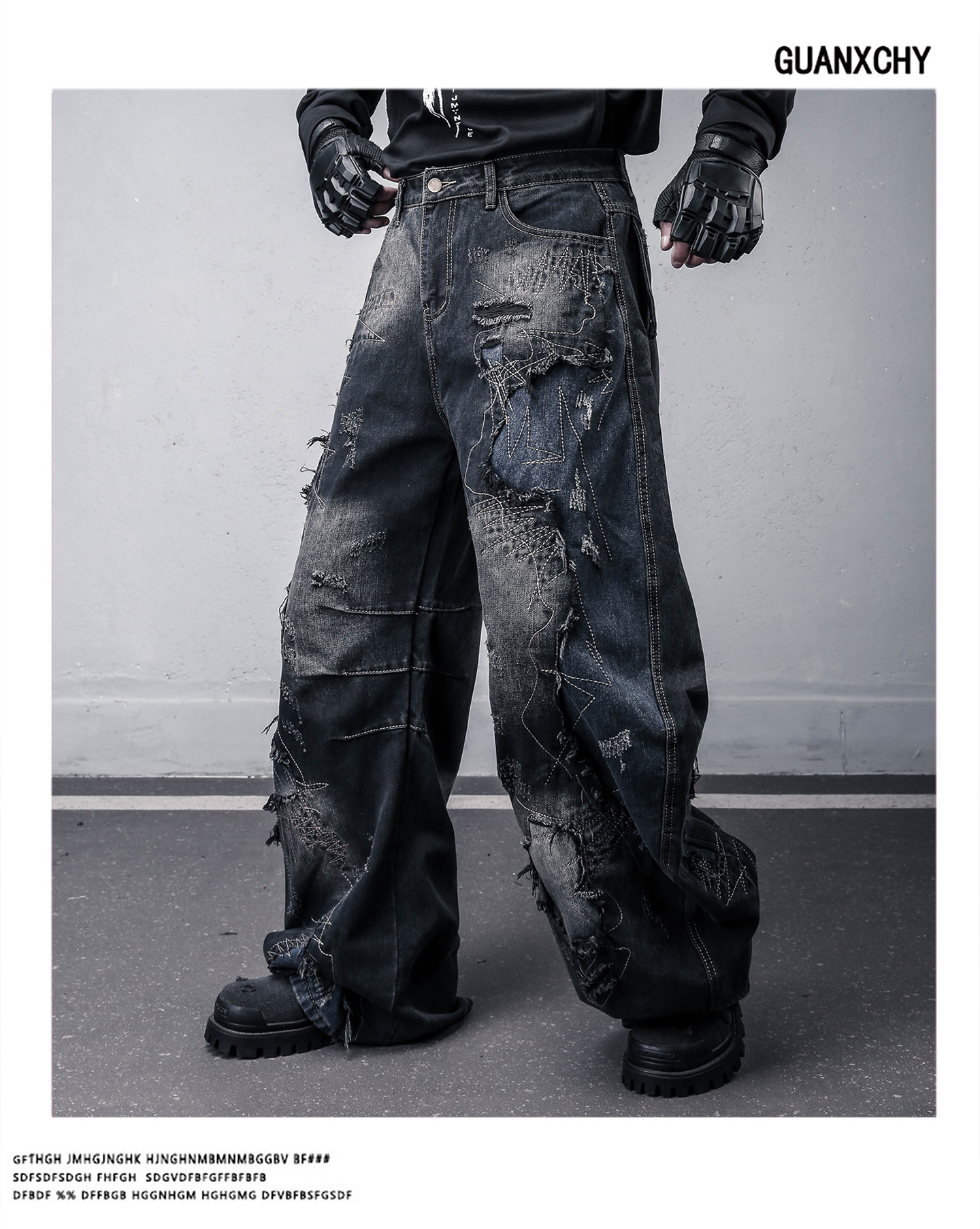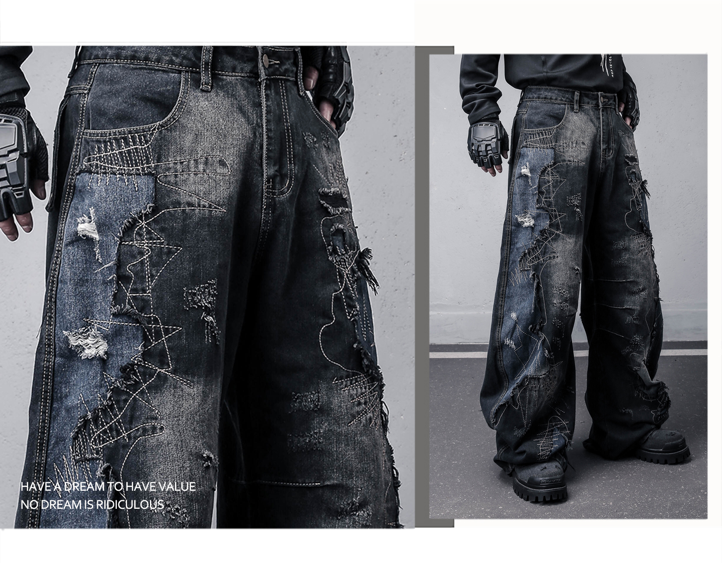 Wash Damage Embroidery Wide Leg Denim Jeans WN22359