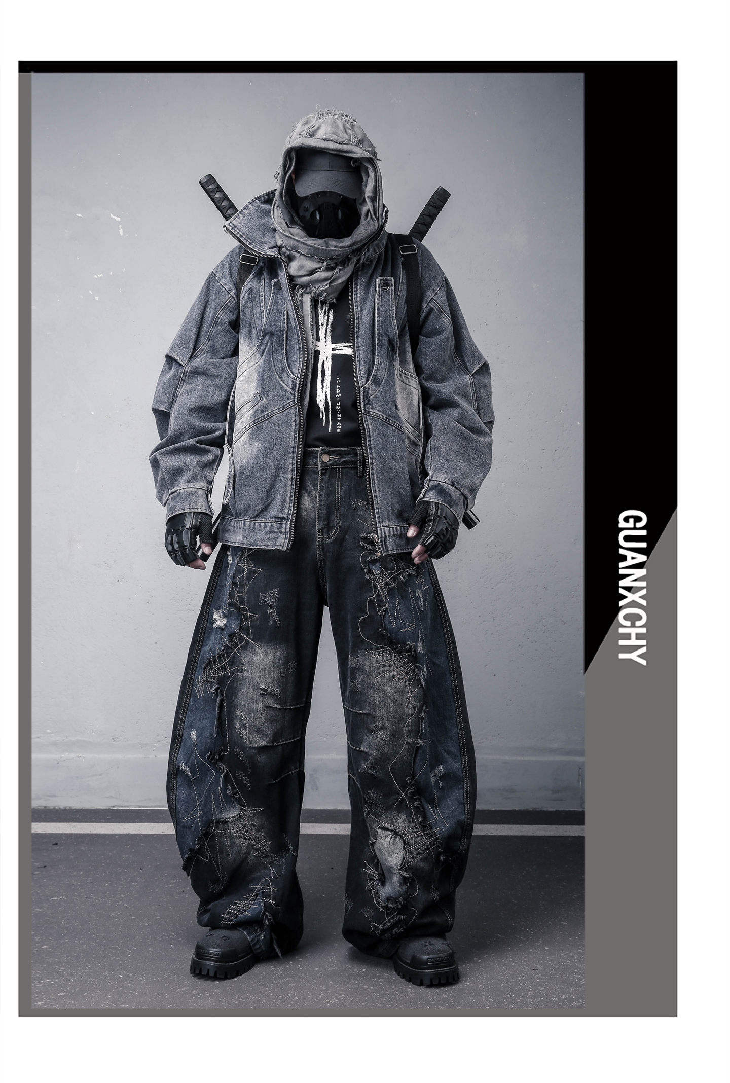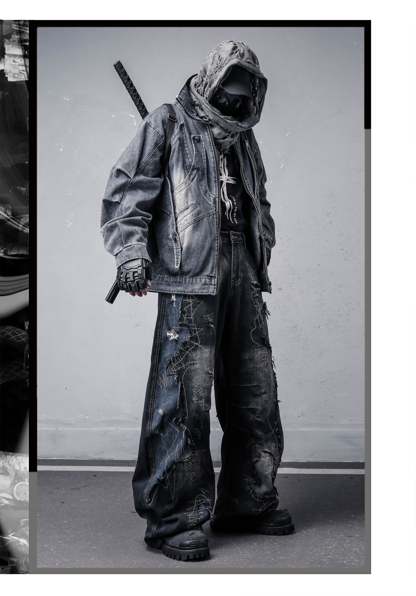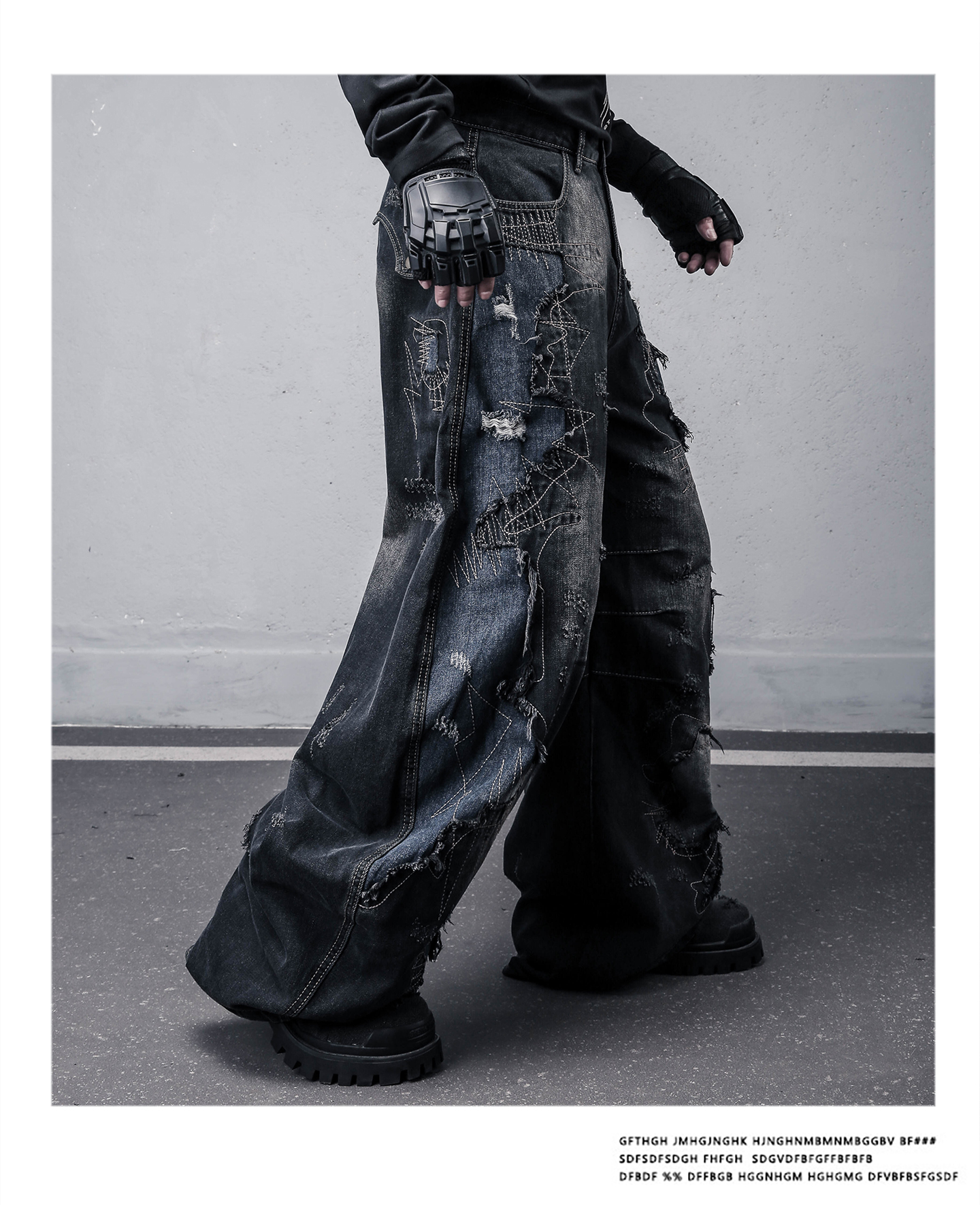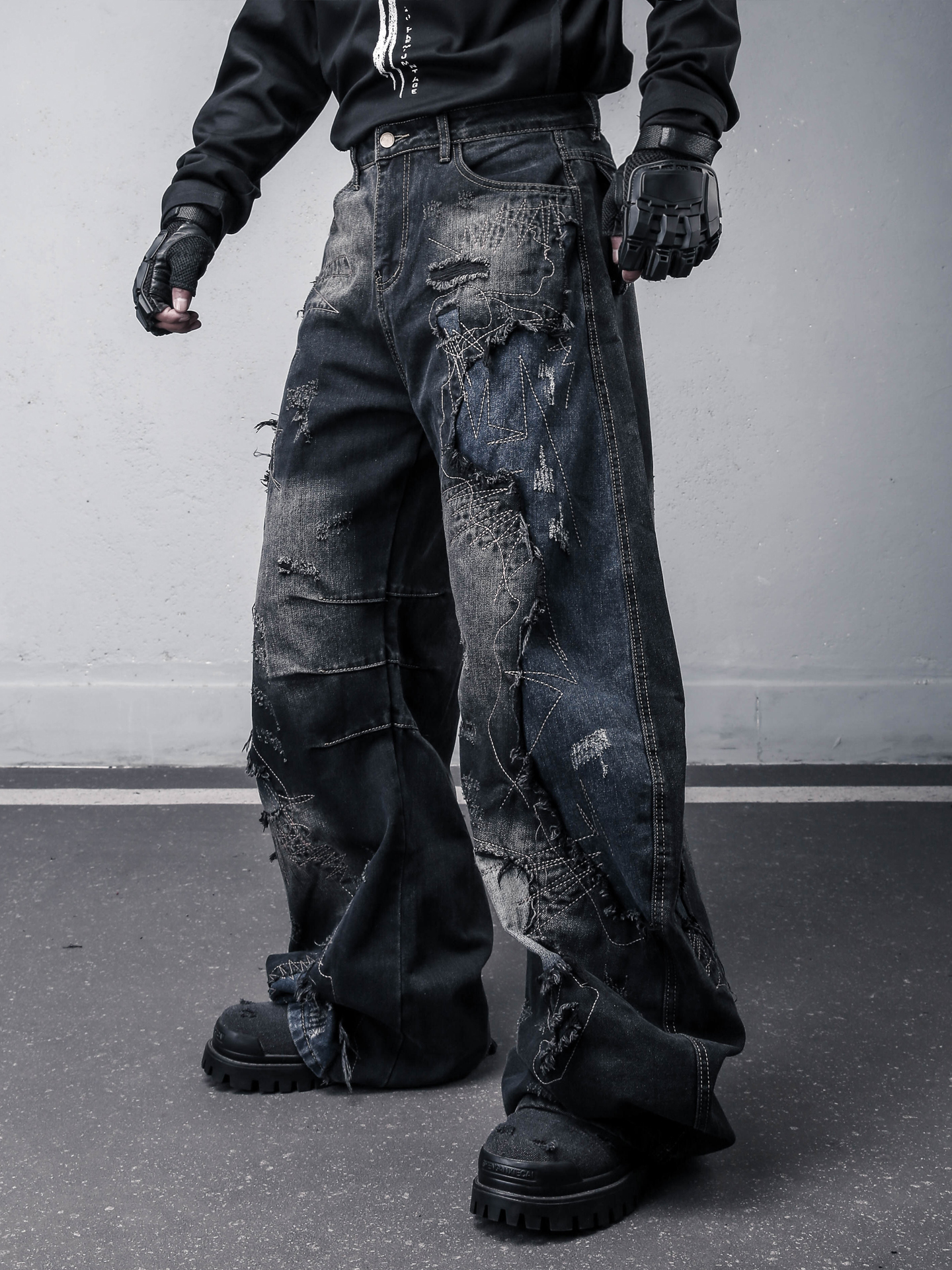 Wash Damage Embroidery Wide Leg Denim Jeans WN22359