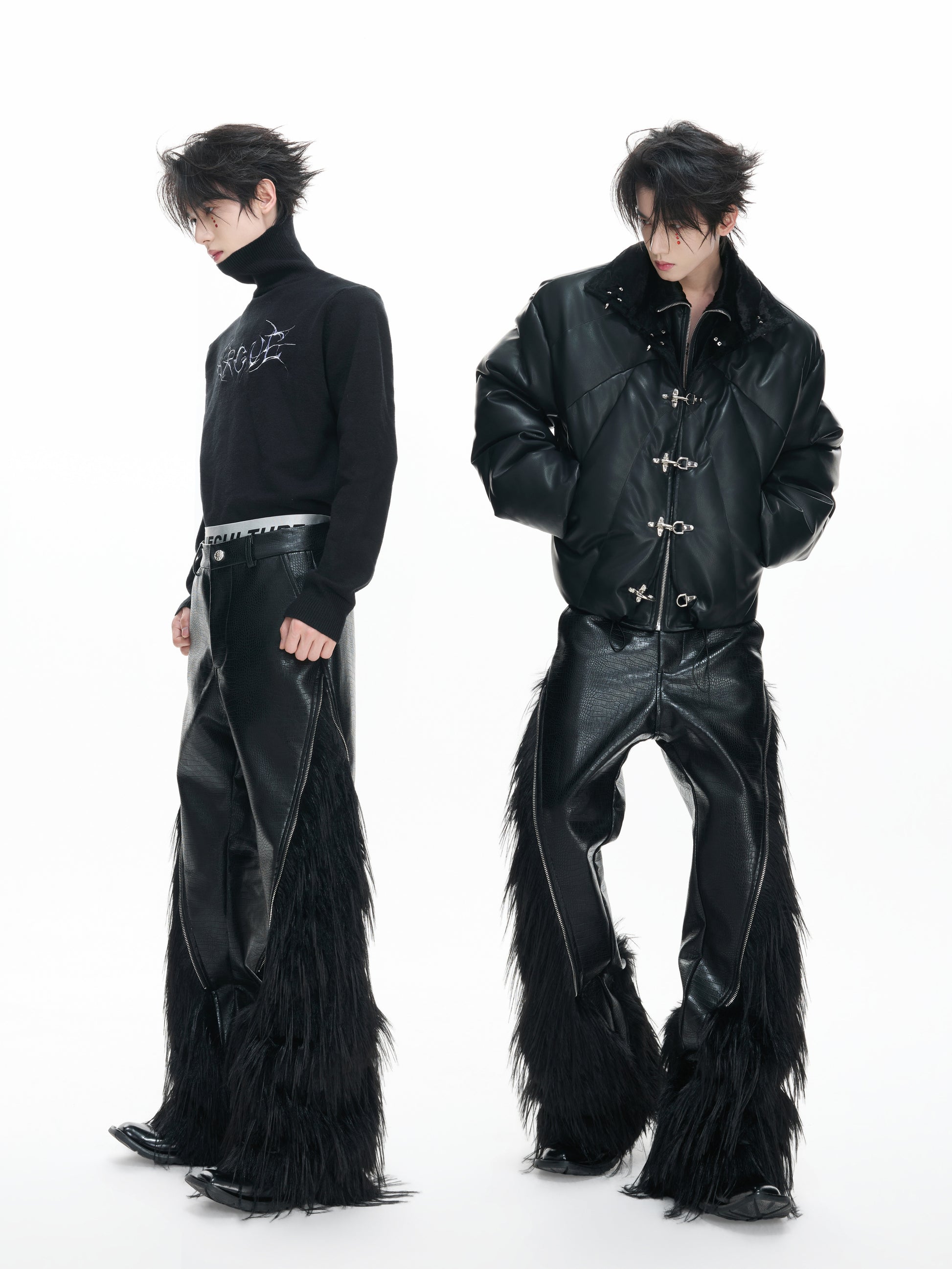 Fake Wolf Fur Patchwork Crocodile Texture Metal Zipper Straight PU Leather Pants WN23316