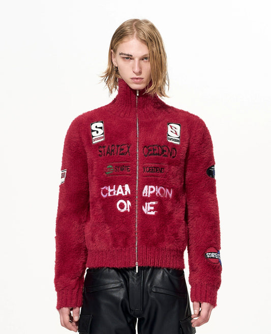 Letter Embroidery Print High-Neck Zipper Knit Cardigan WN22649