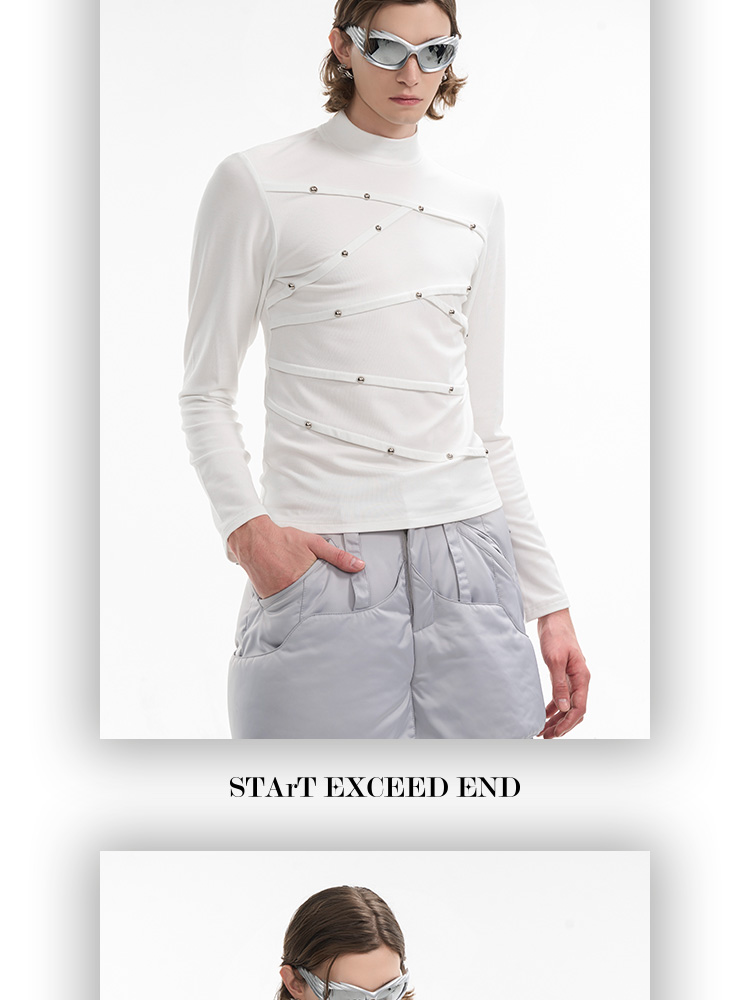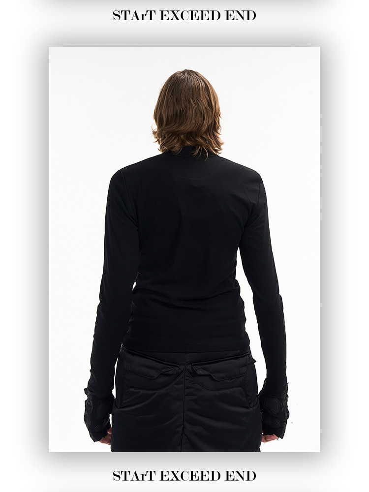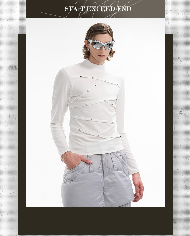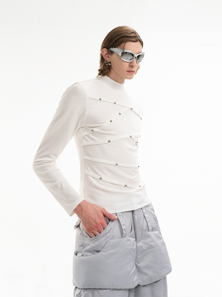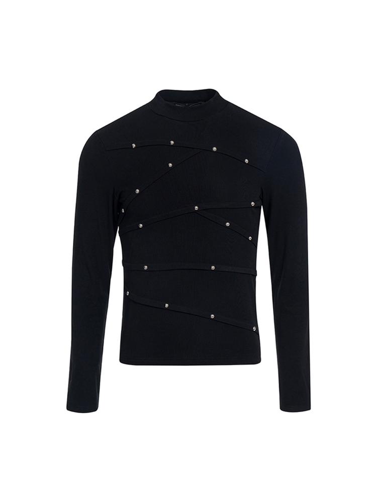 Studded Accents Fitted High-Neck Long Sleeve T-Shirt WN12151