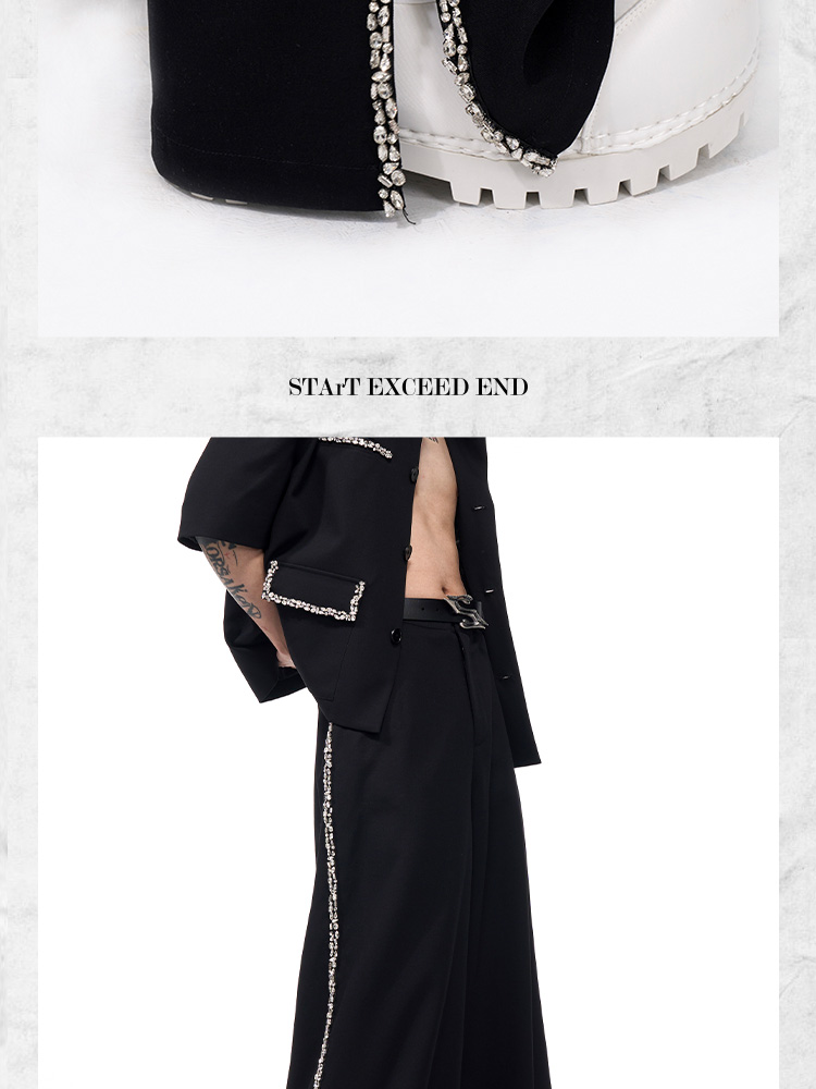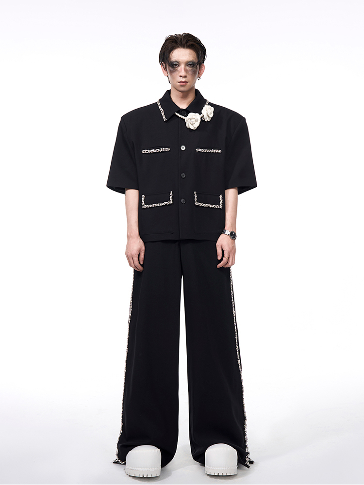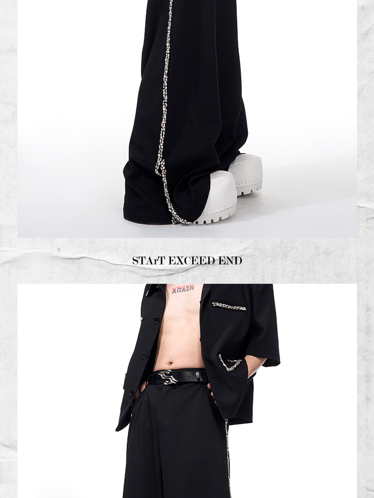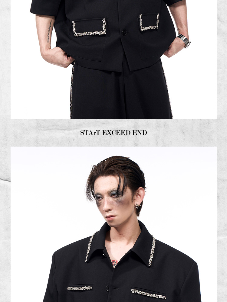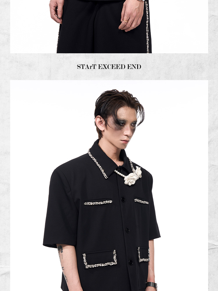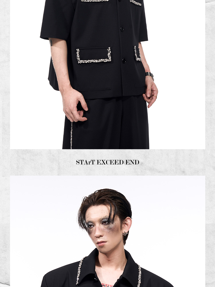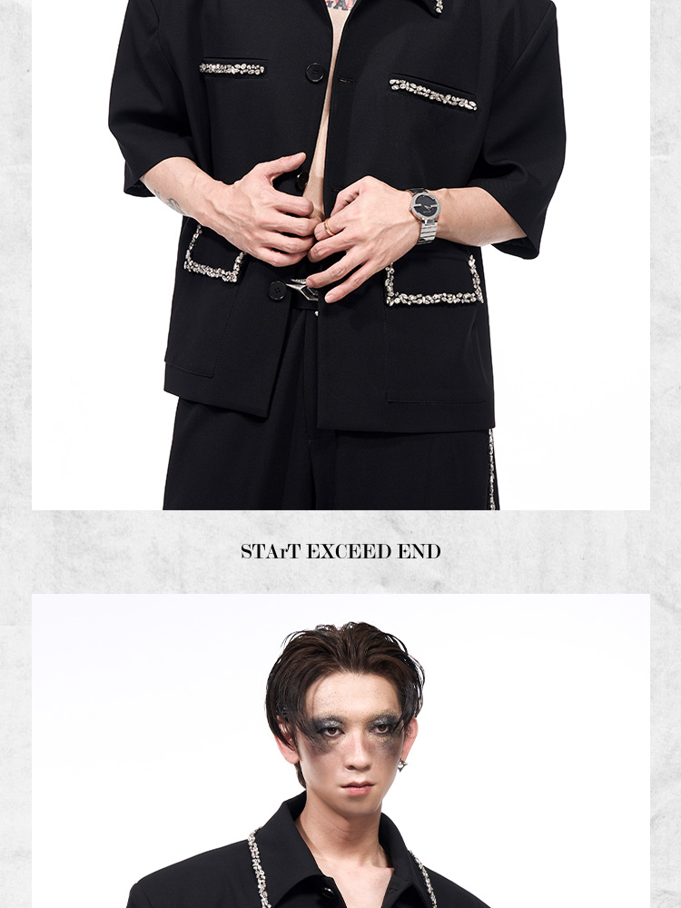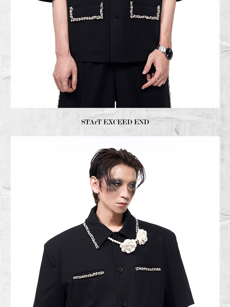 Rhinestone Short Sleeve Shirt Jacket & Rhinestone Slit Flare Trousers Setup WN16581