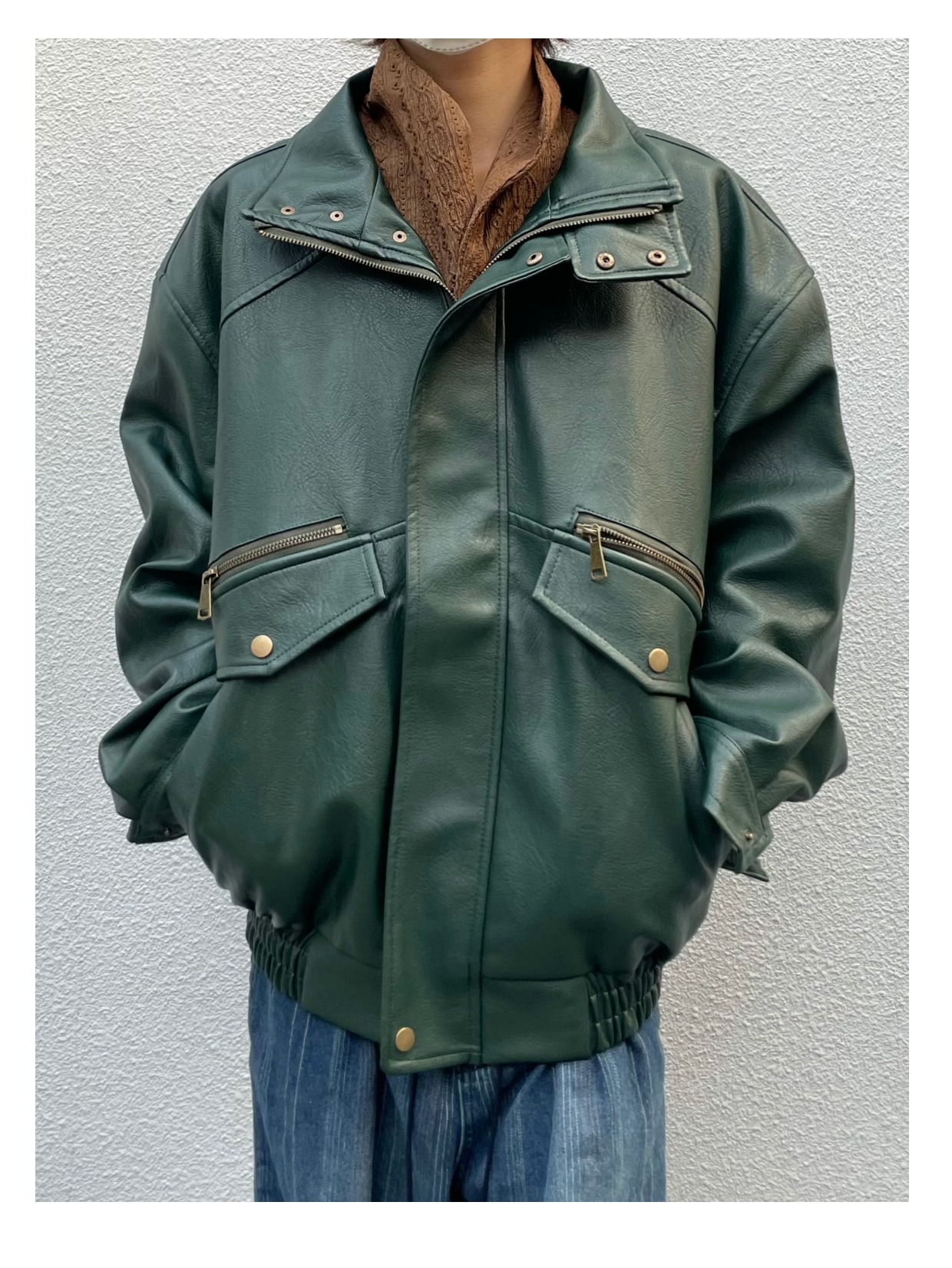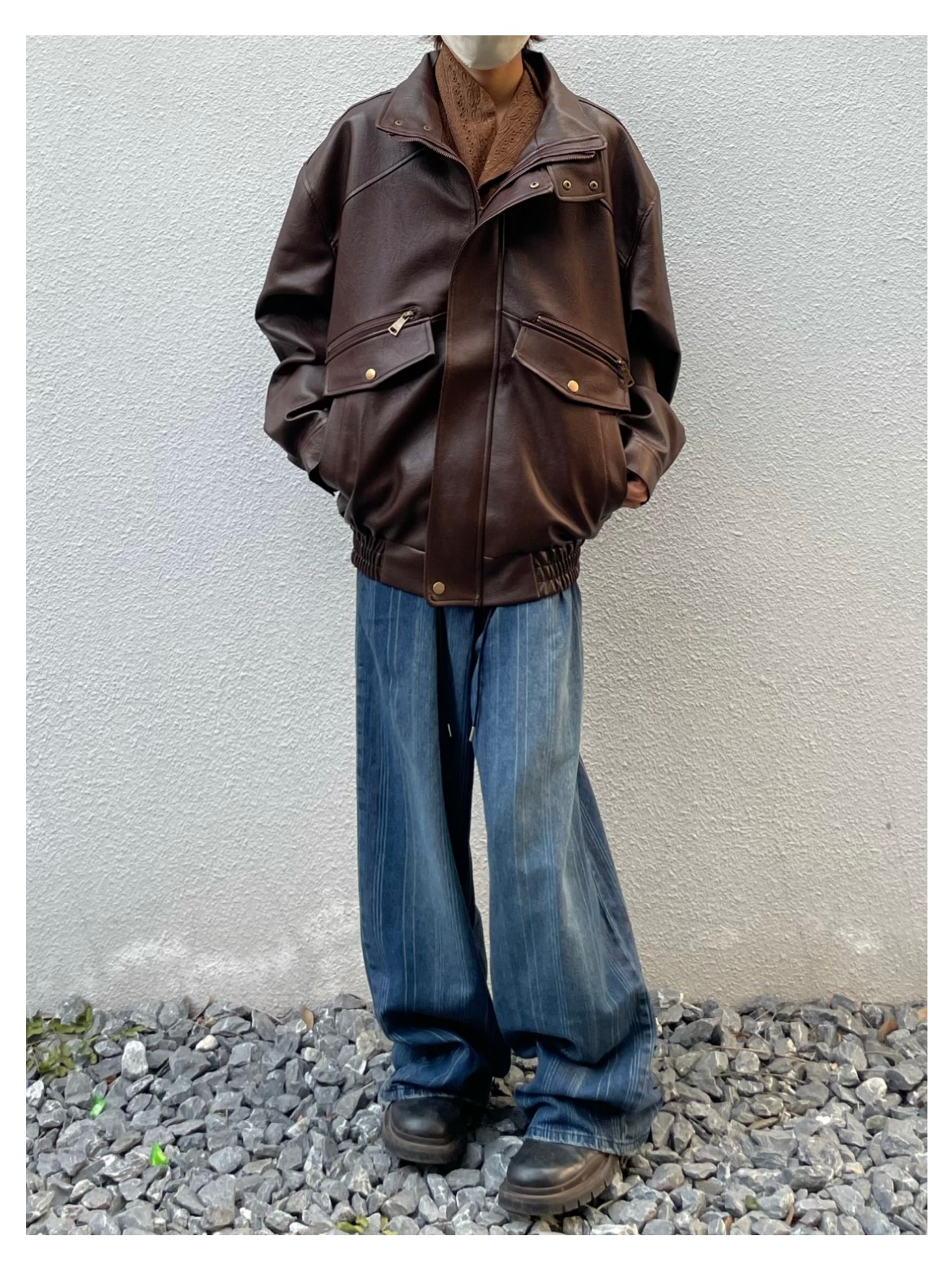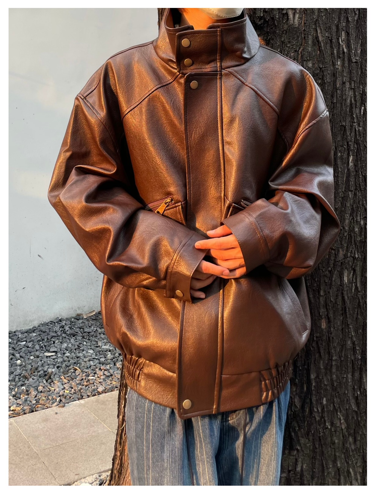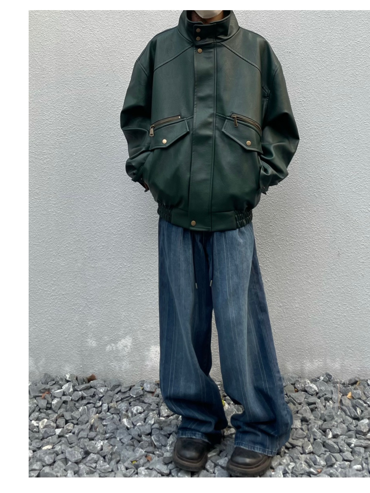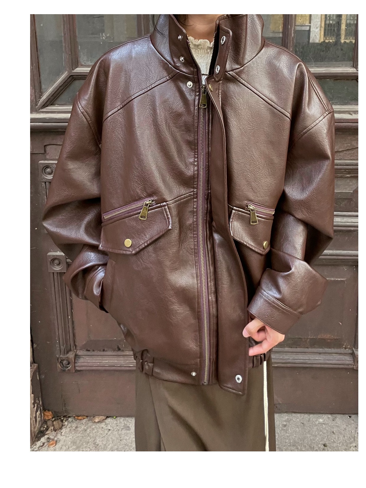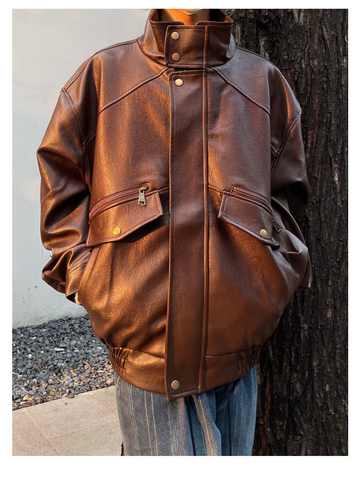 Stand Neck Oversize Windproof PU Leather Jacket WN19987