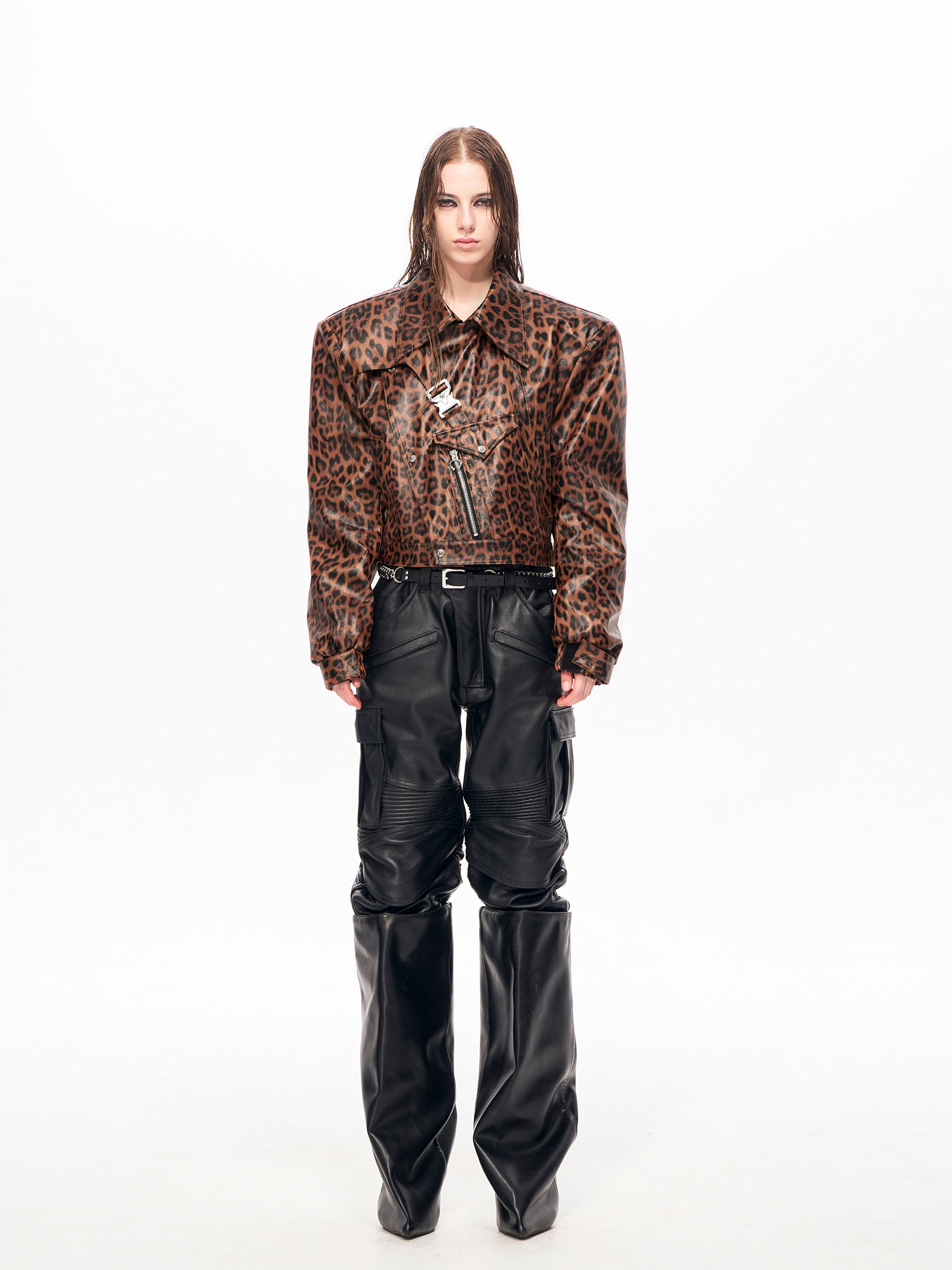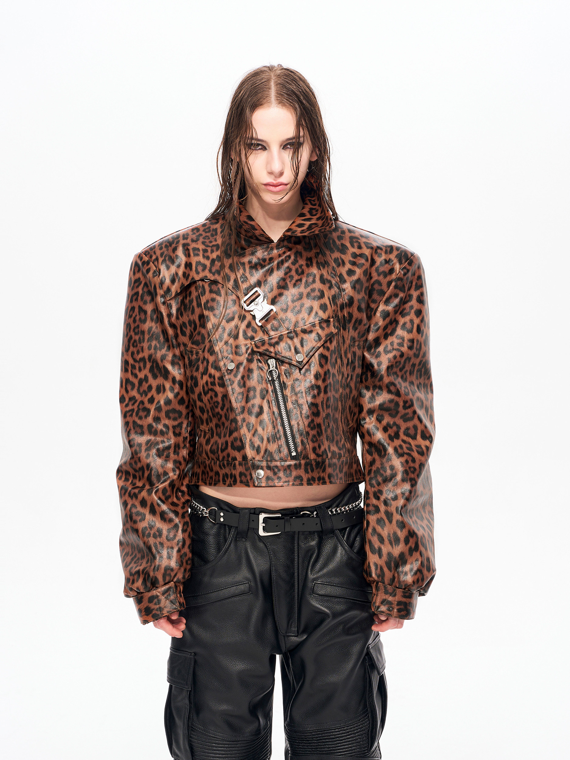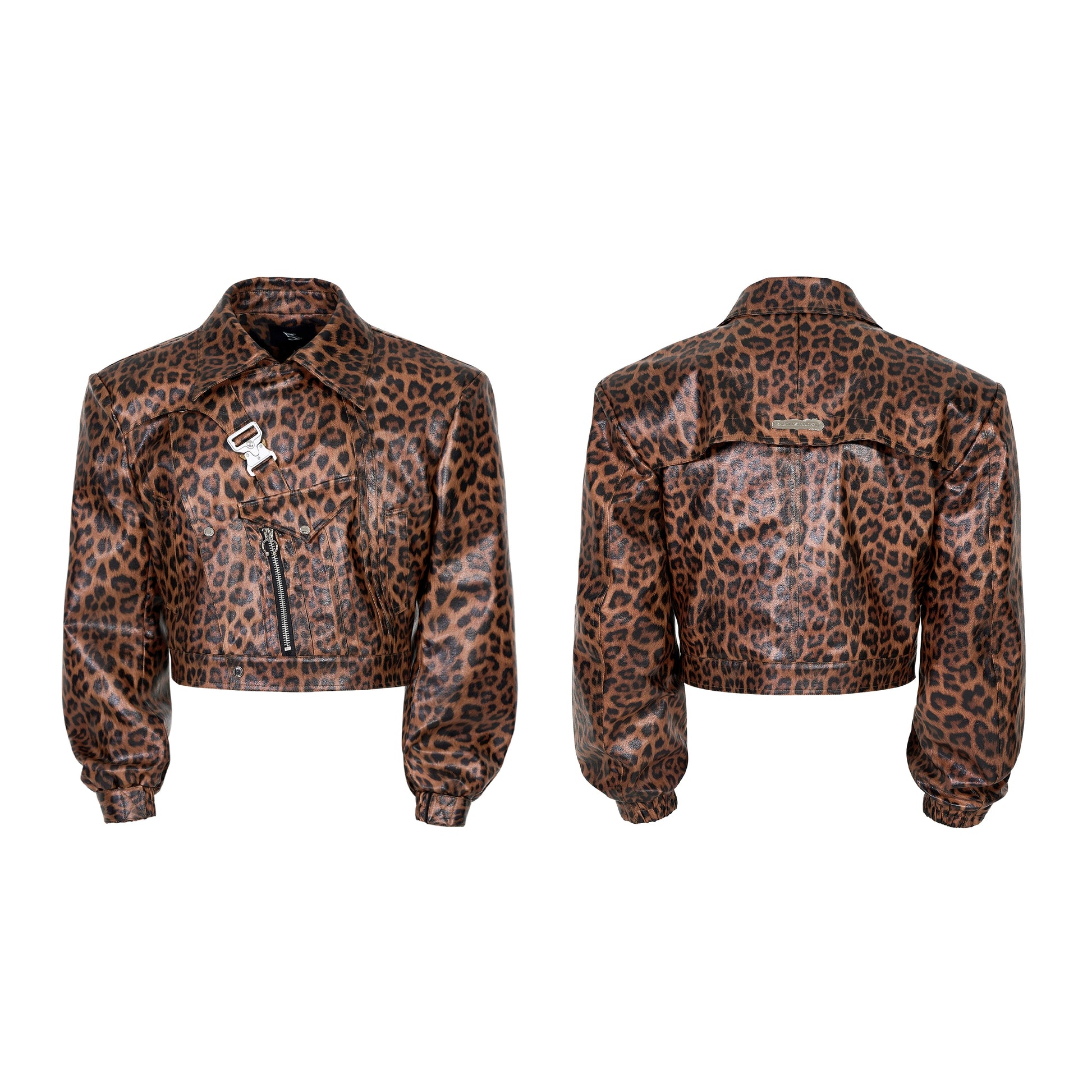 Metal Buckle Leopard PU Leather Short Jacket WN22162