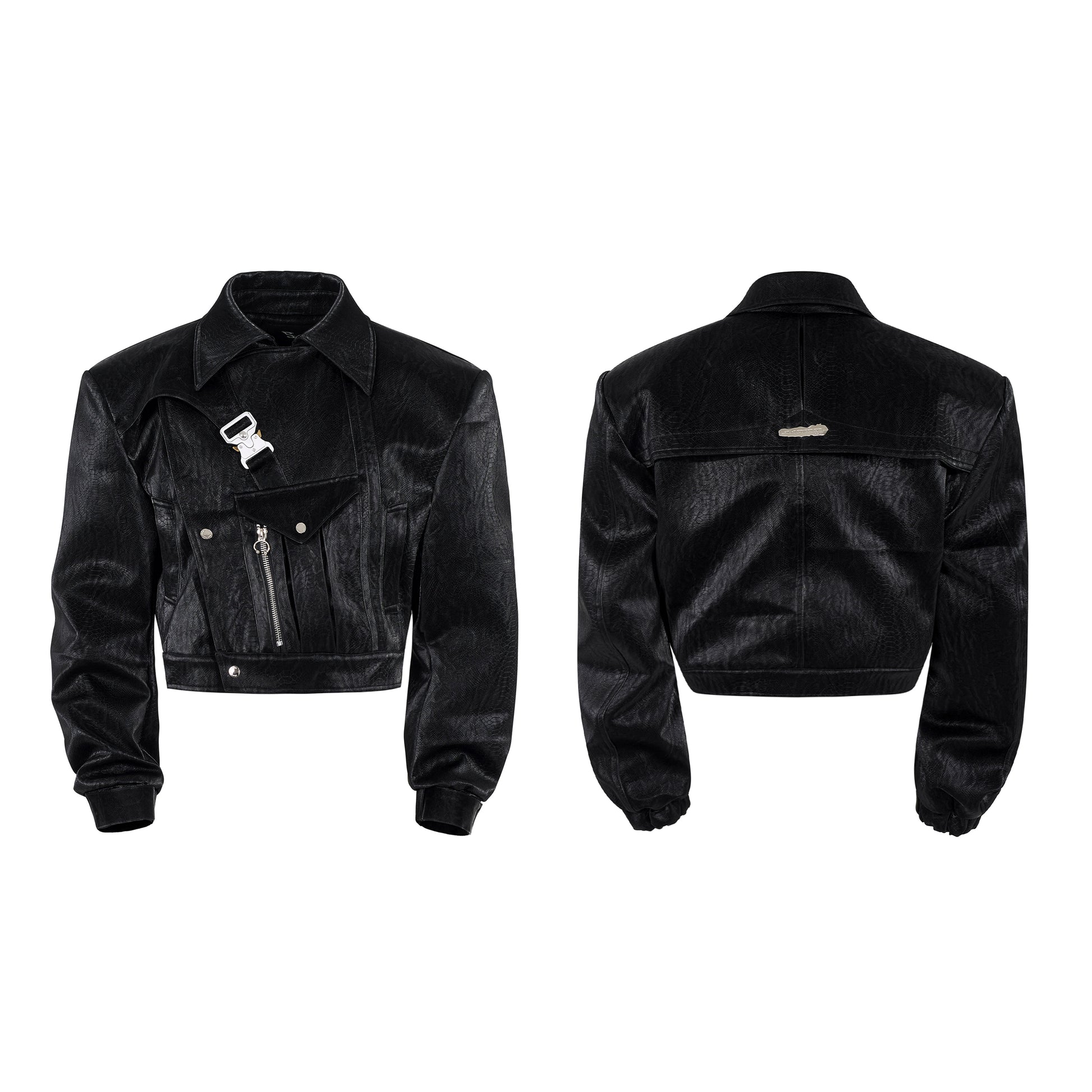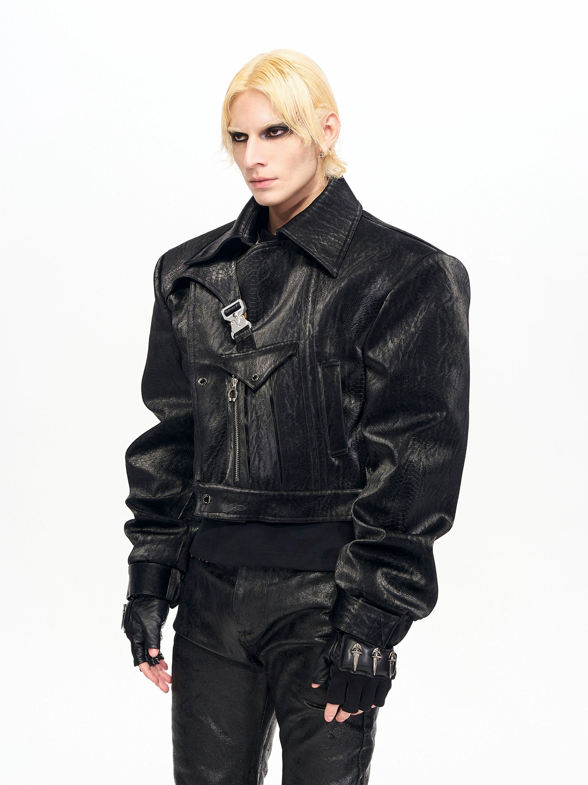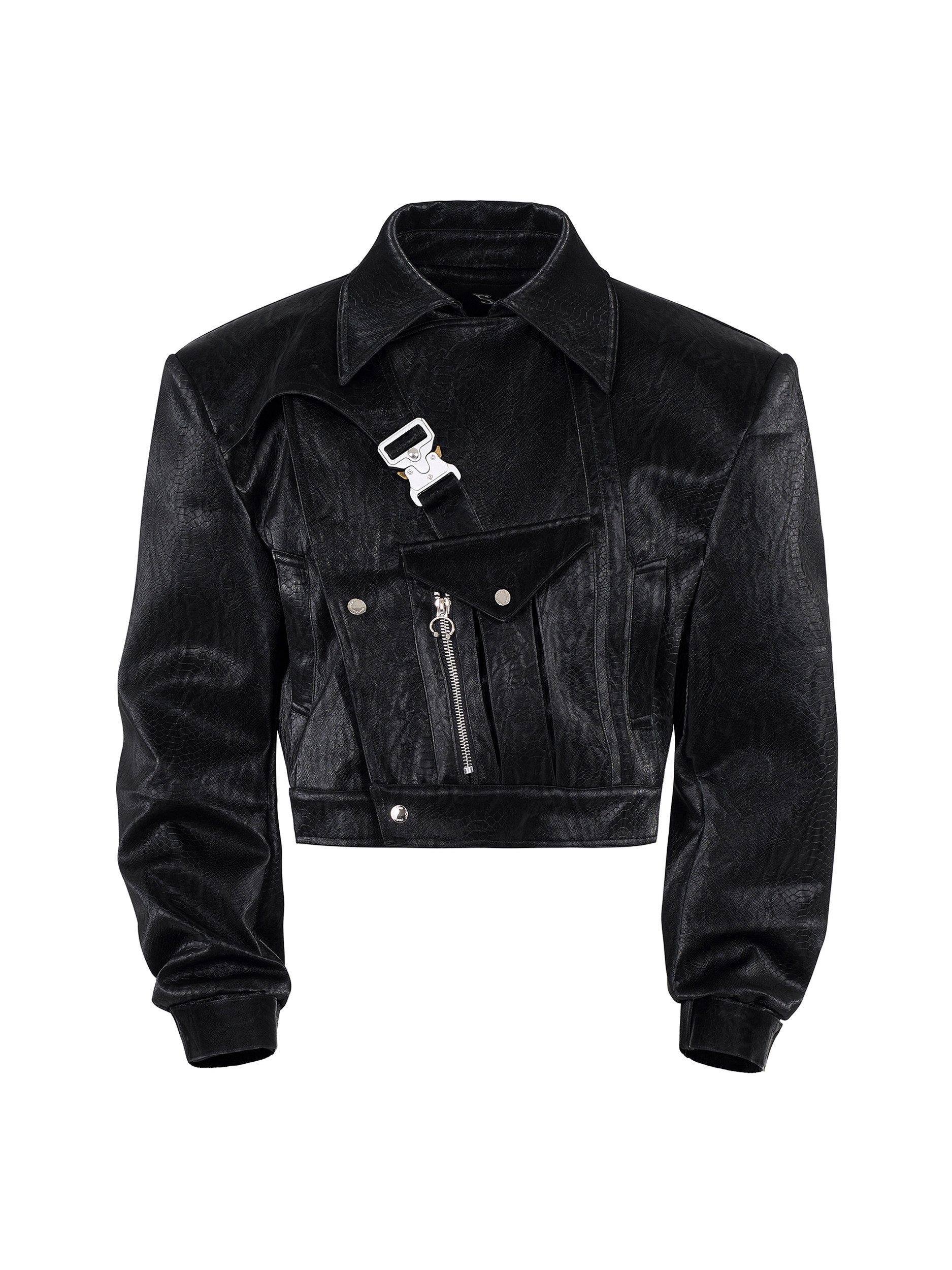Metal Buckle Leopard PU Leather Short Jacket WN22162