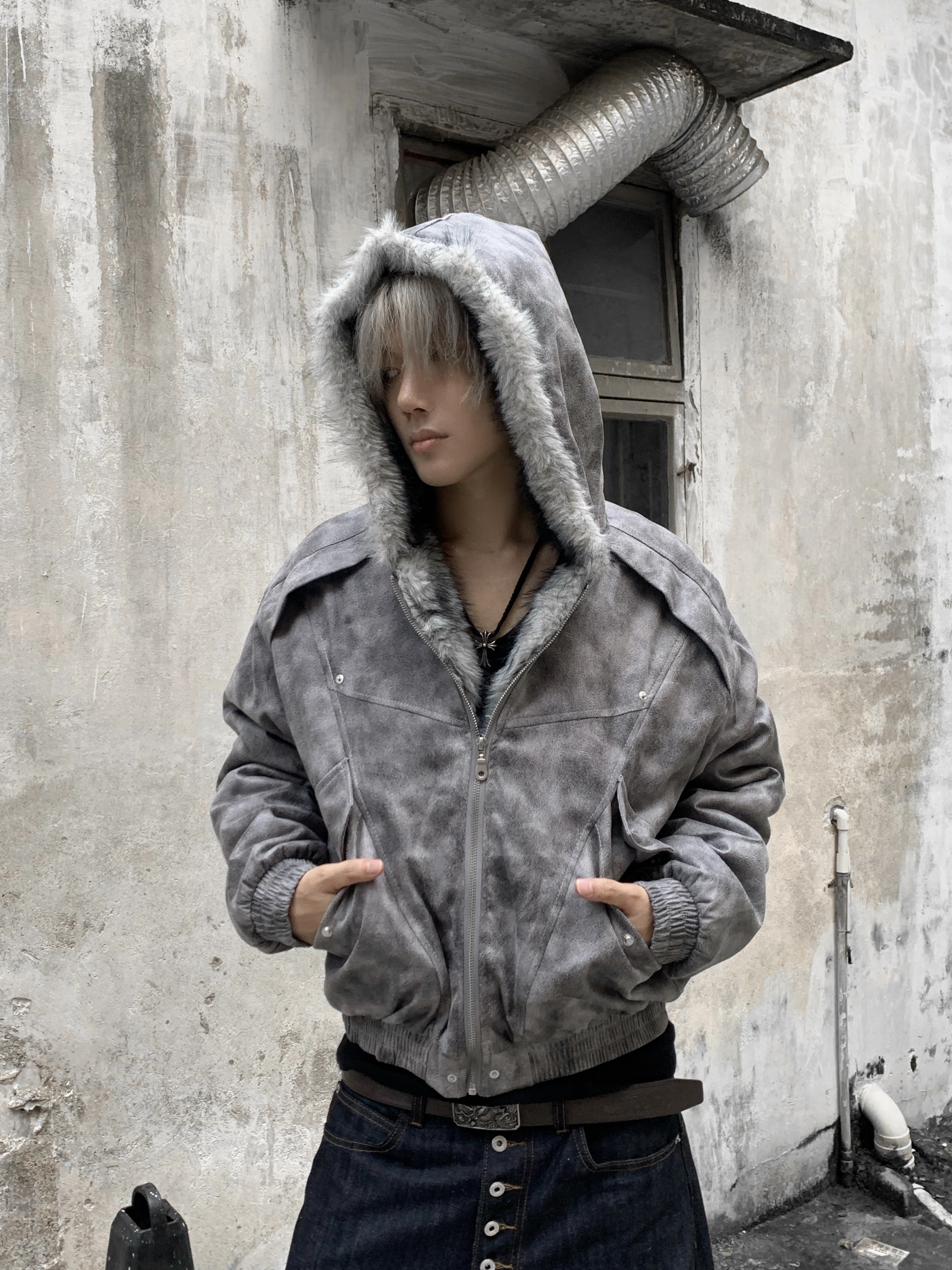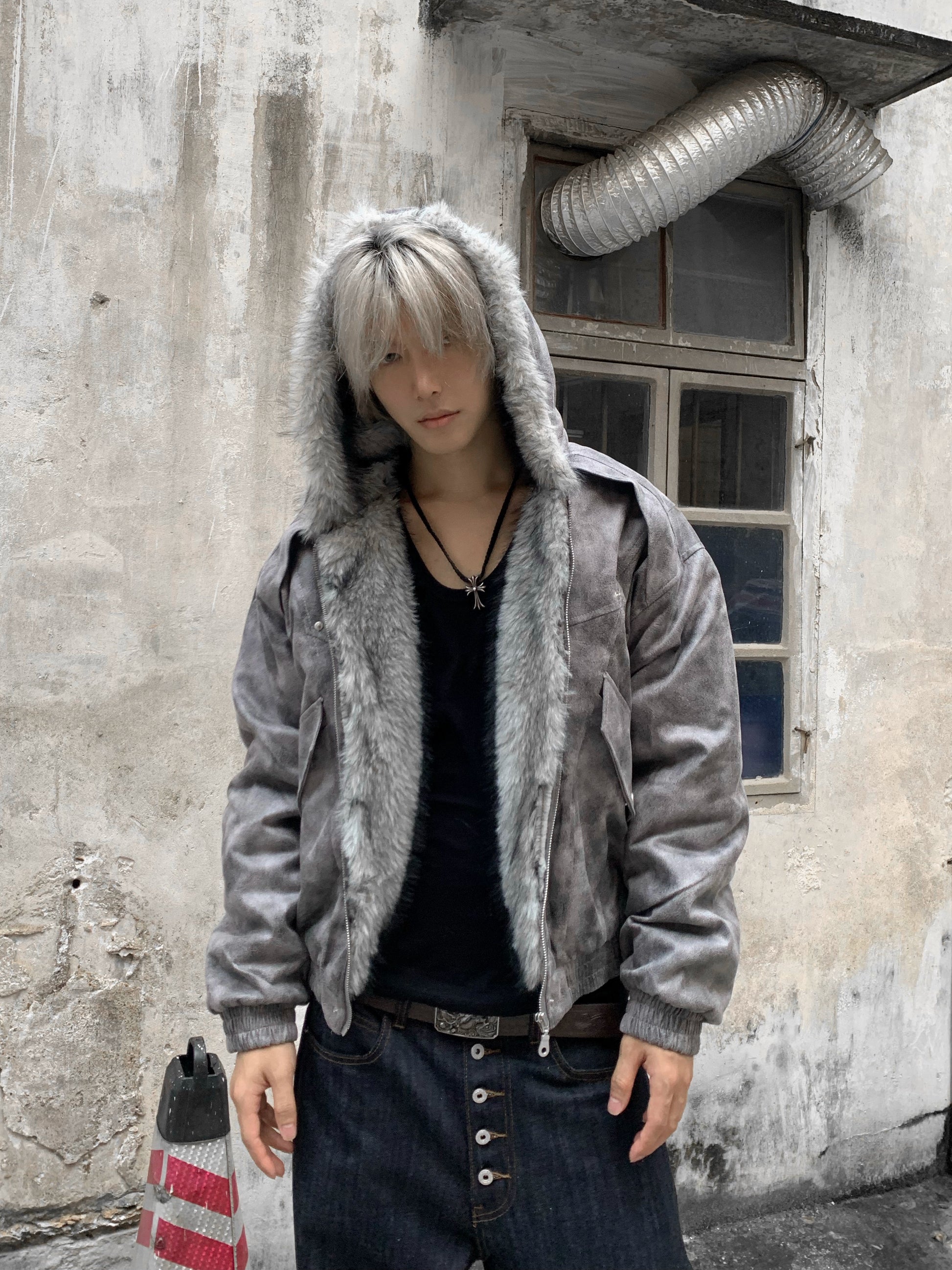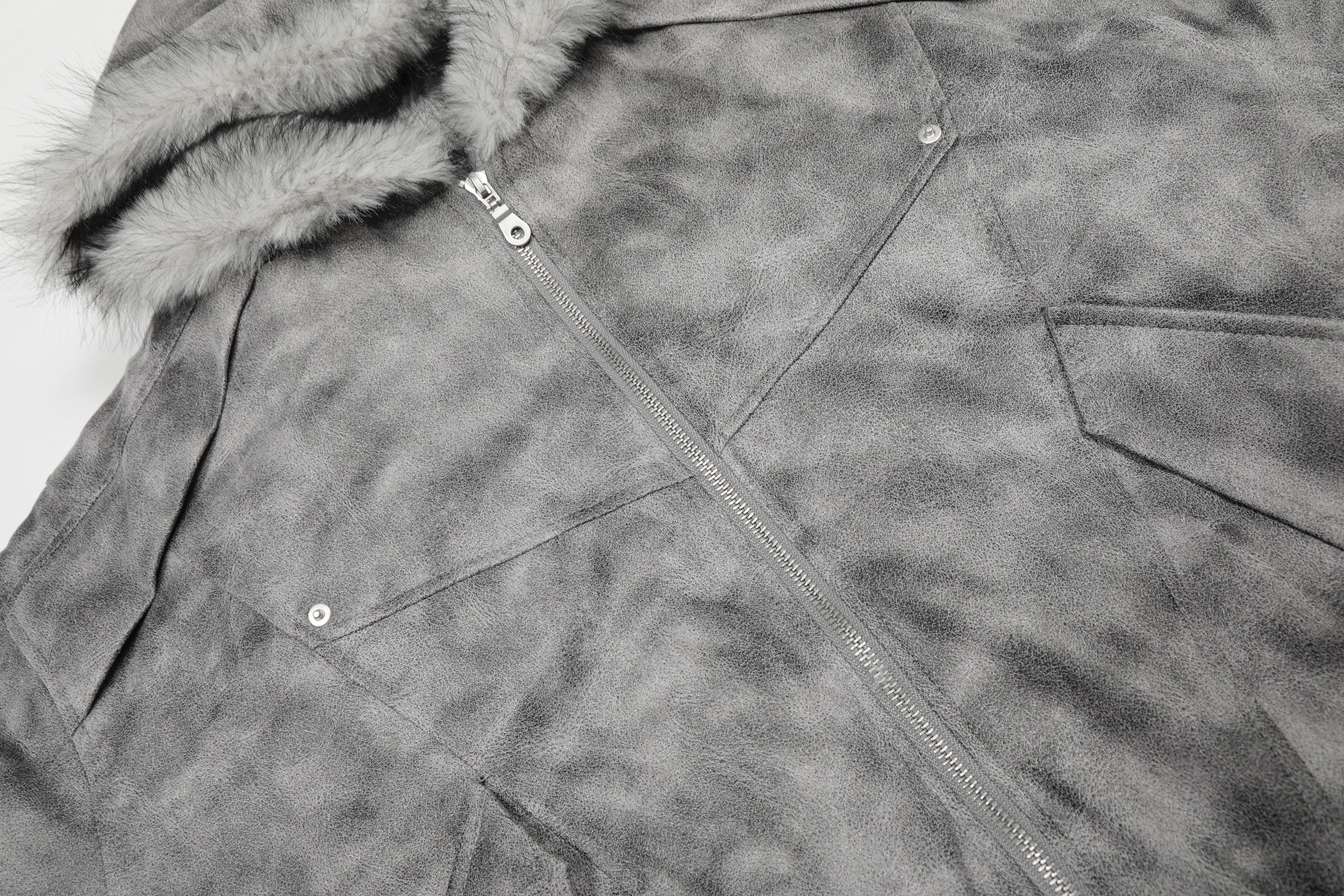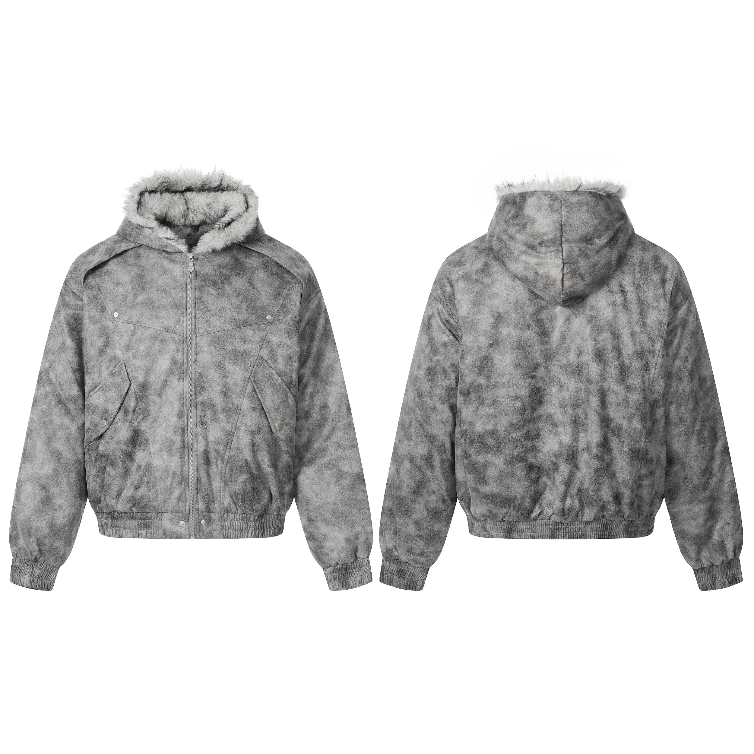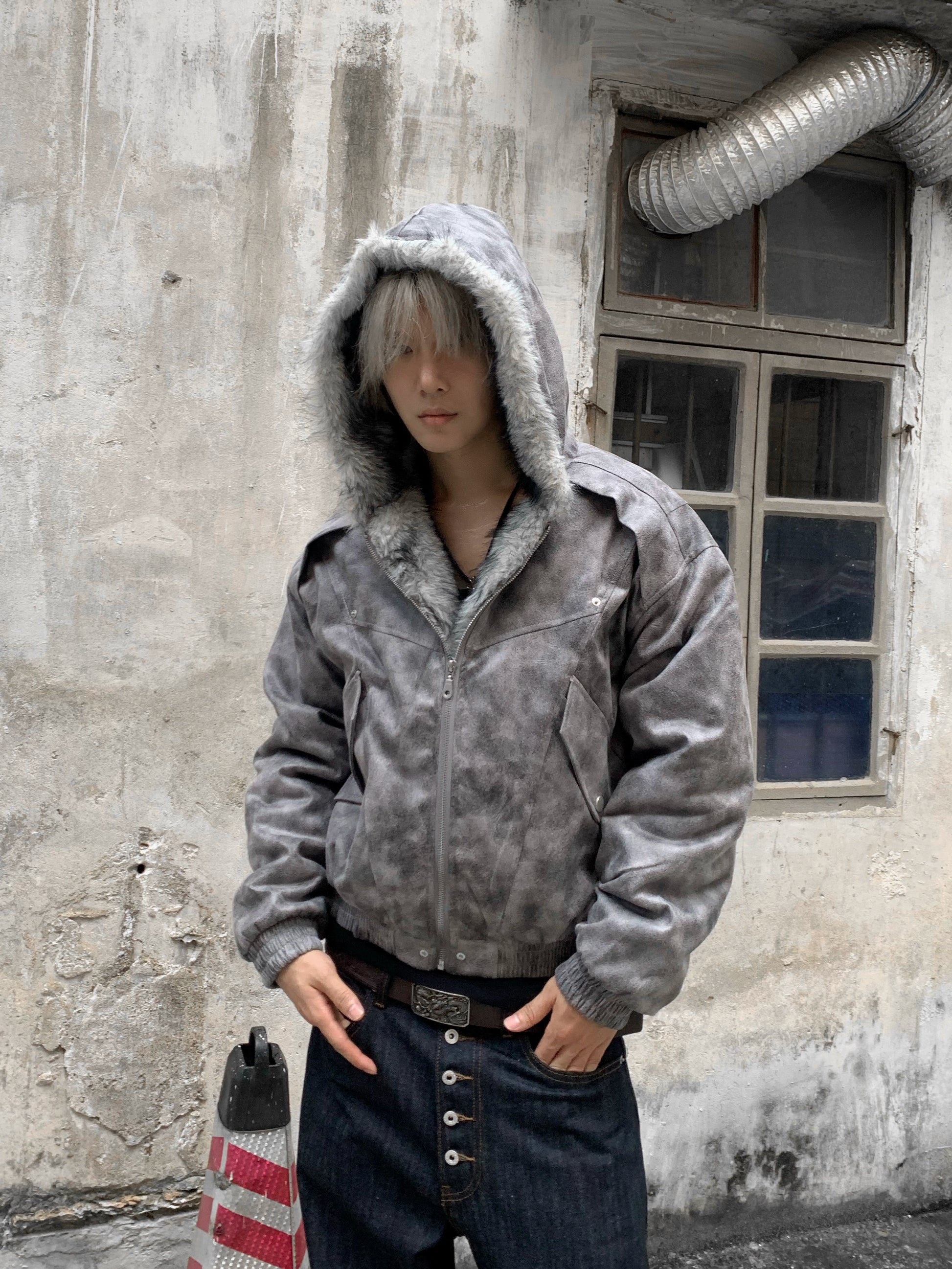 Washed Fake Fur-Collar Hooded Jacket WN22219
