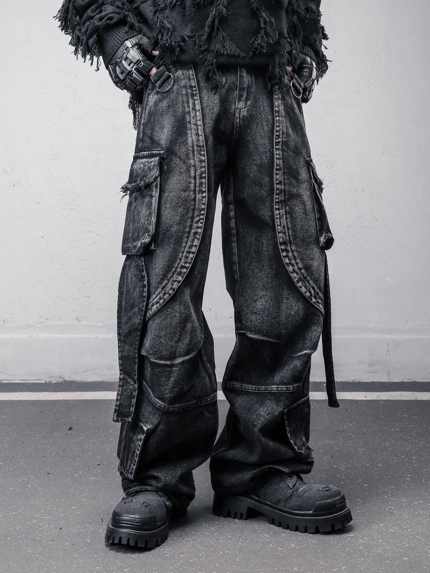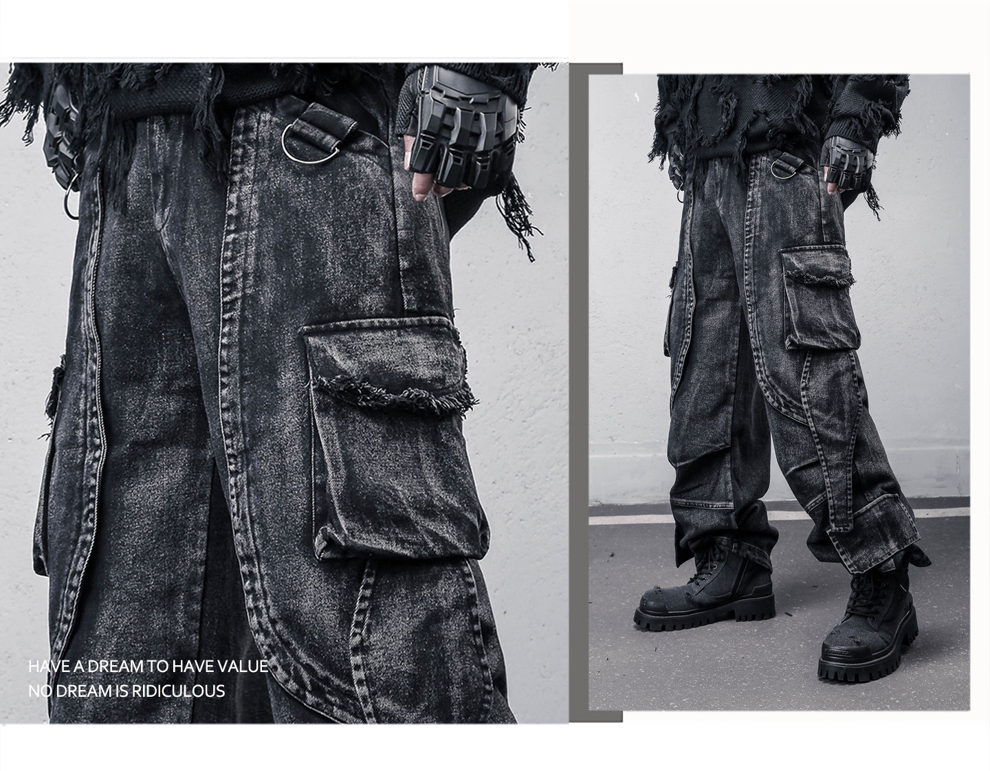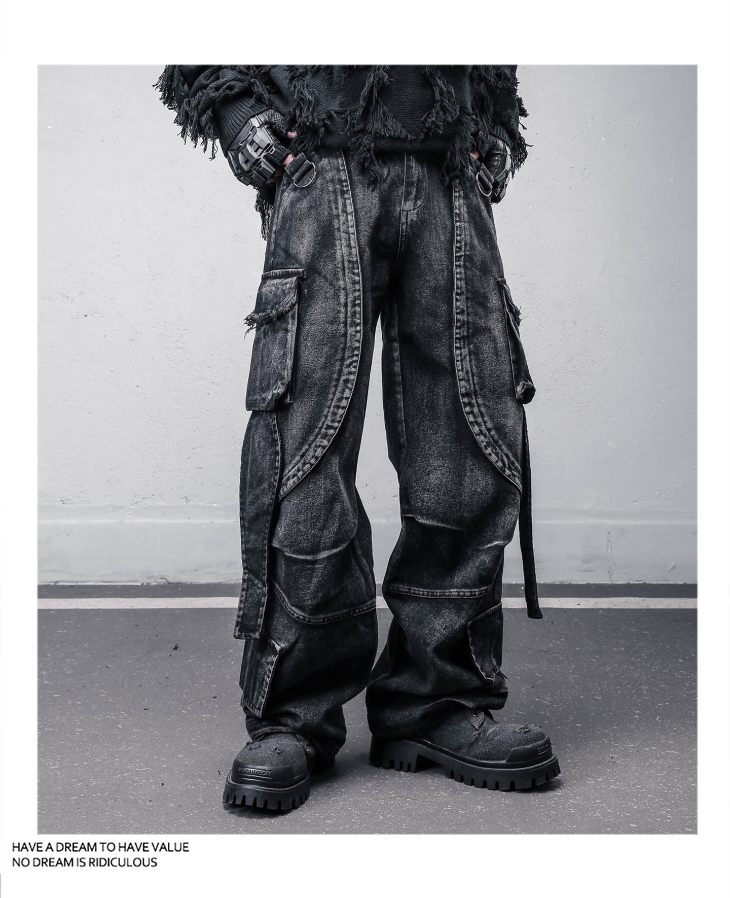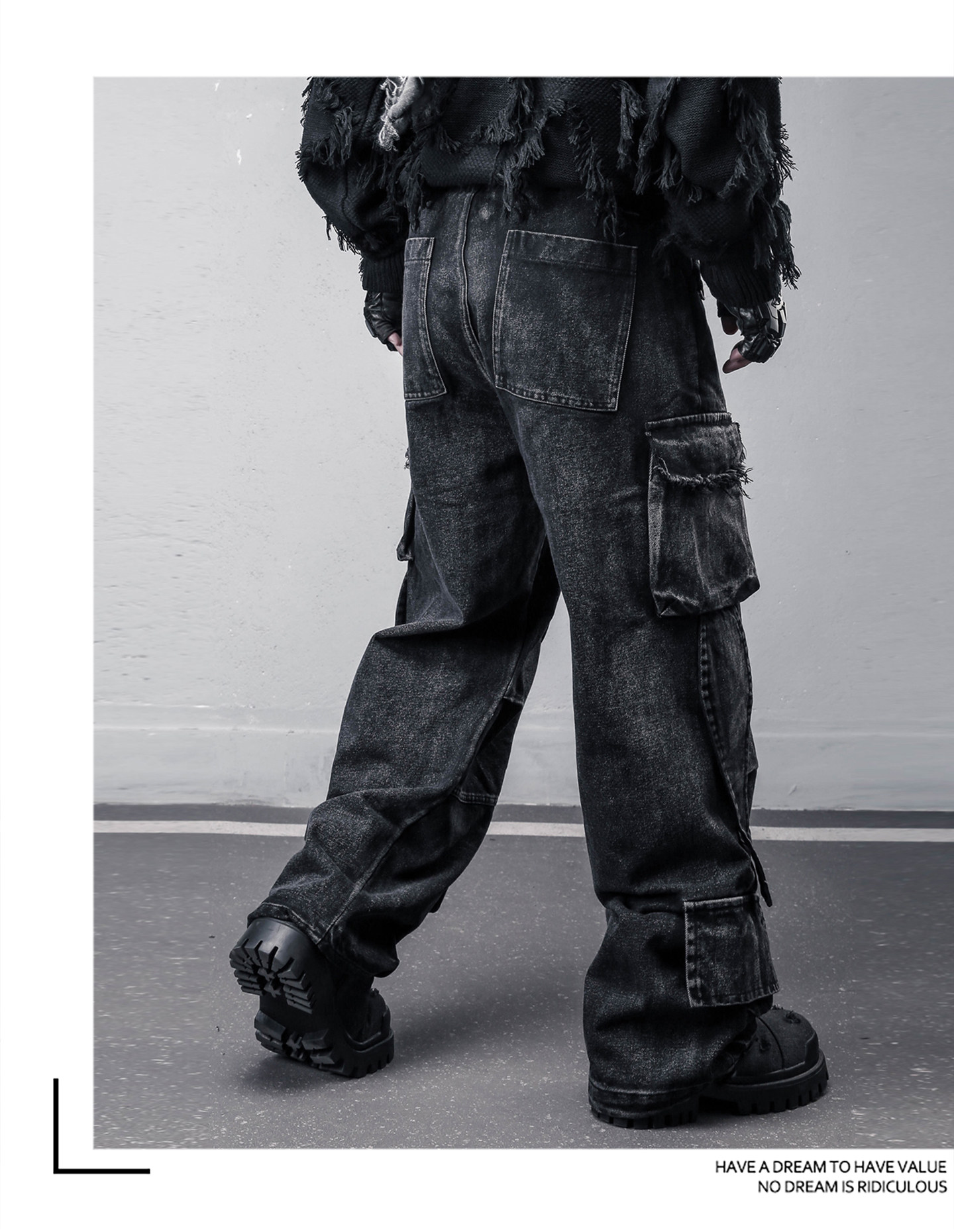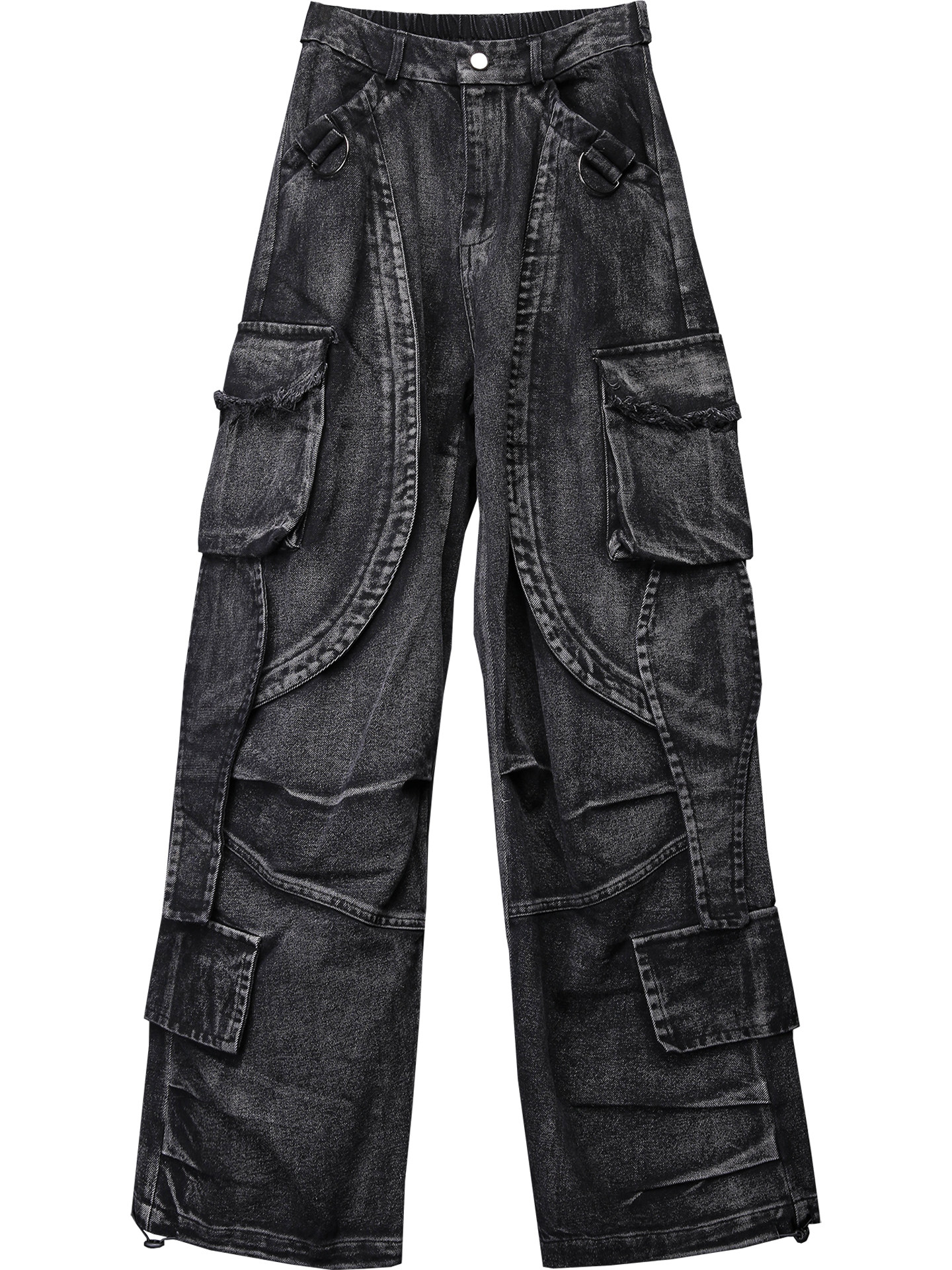 Multi Pocket Wash Damage Wide Leg Denim Jeans WN22388