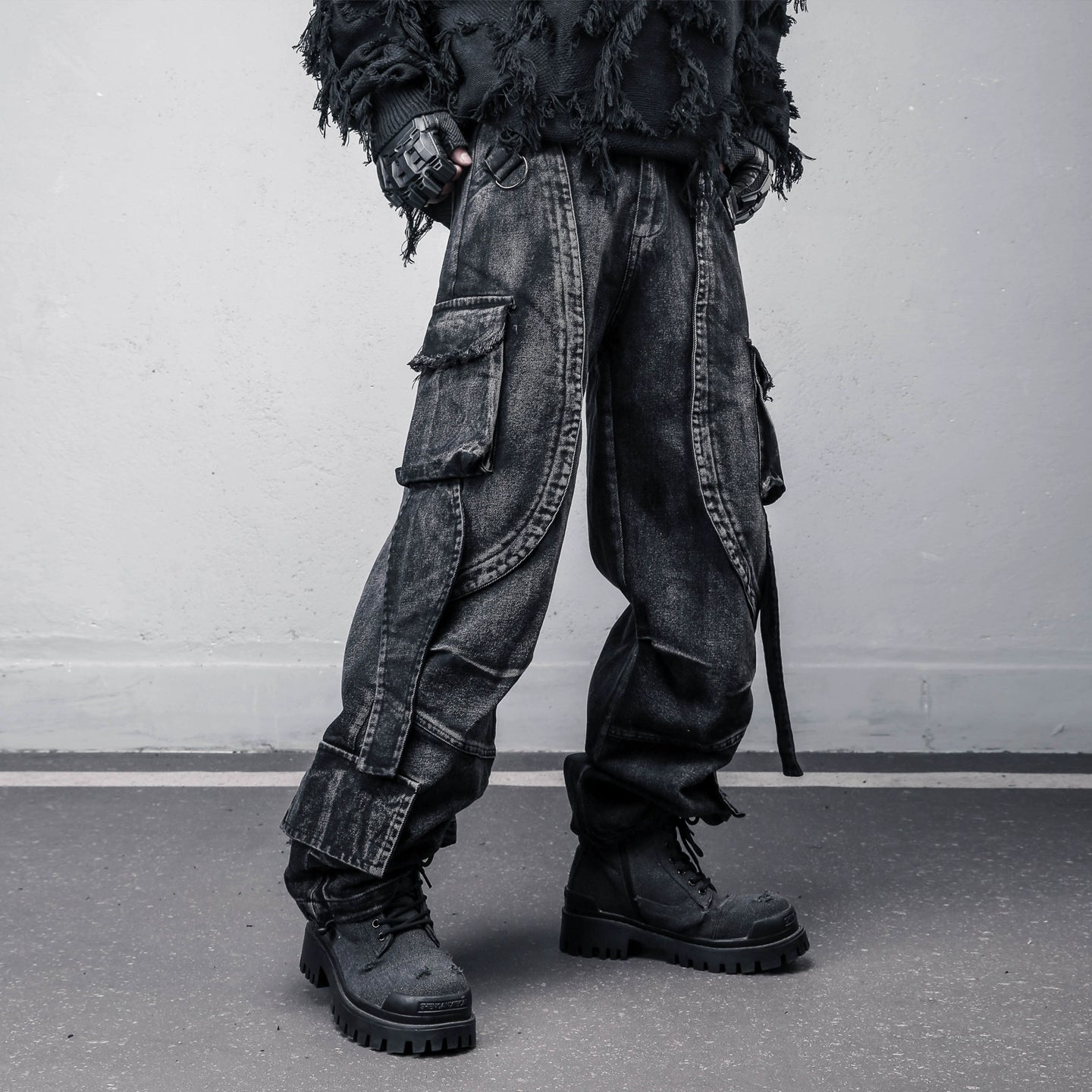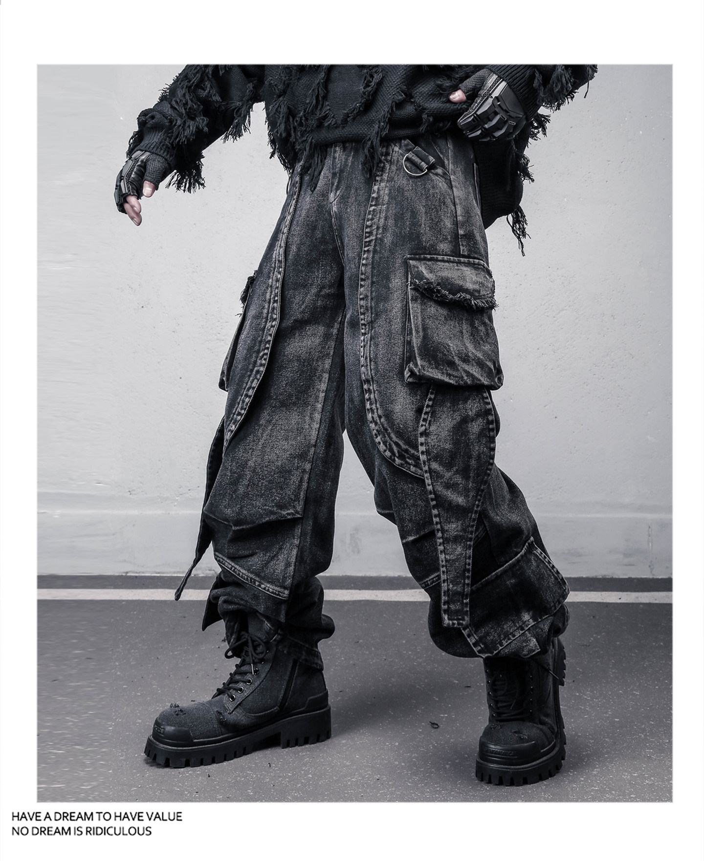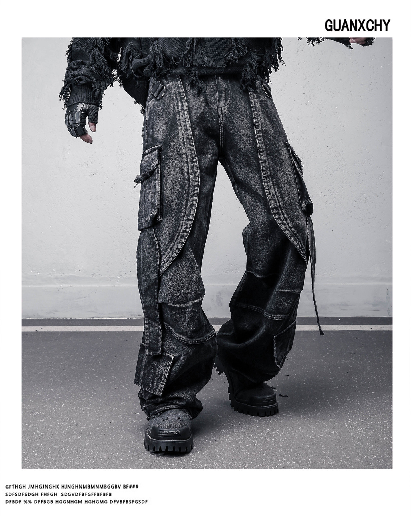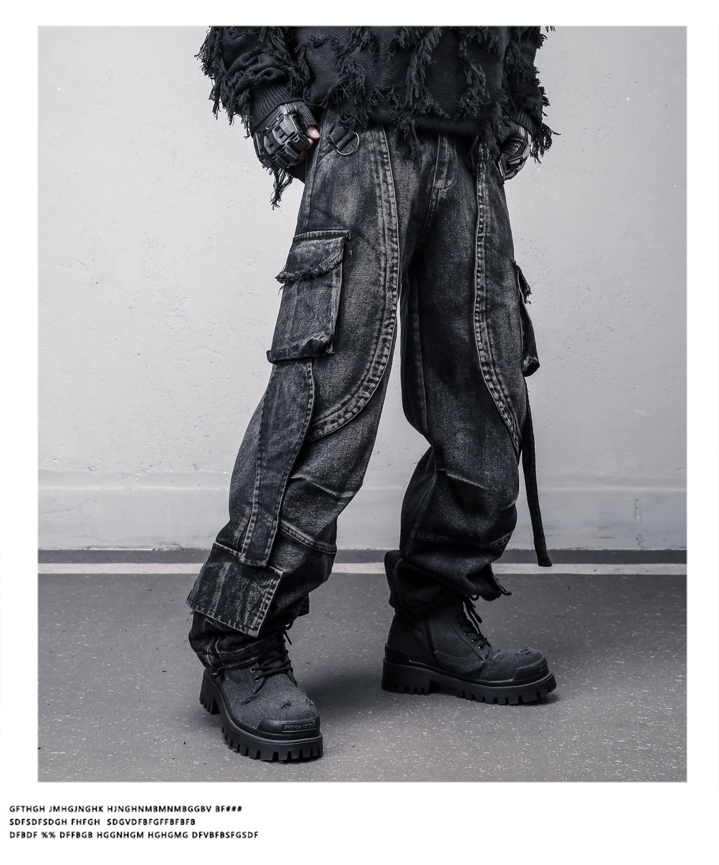 Multi Pocket Wash Damage Wide Leg Denim Jeans WN22388