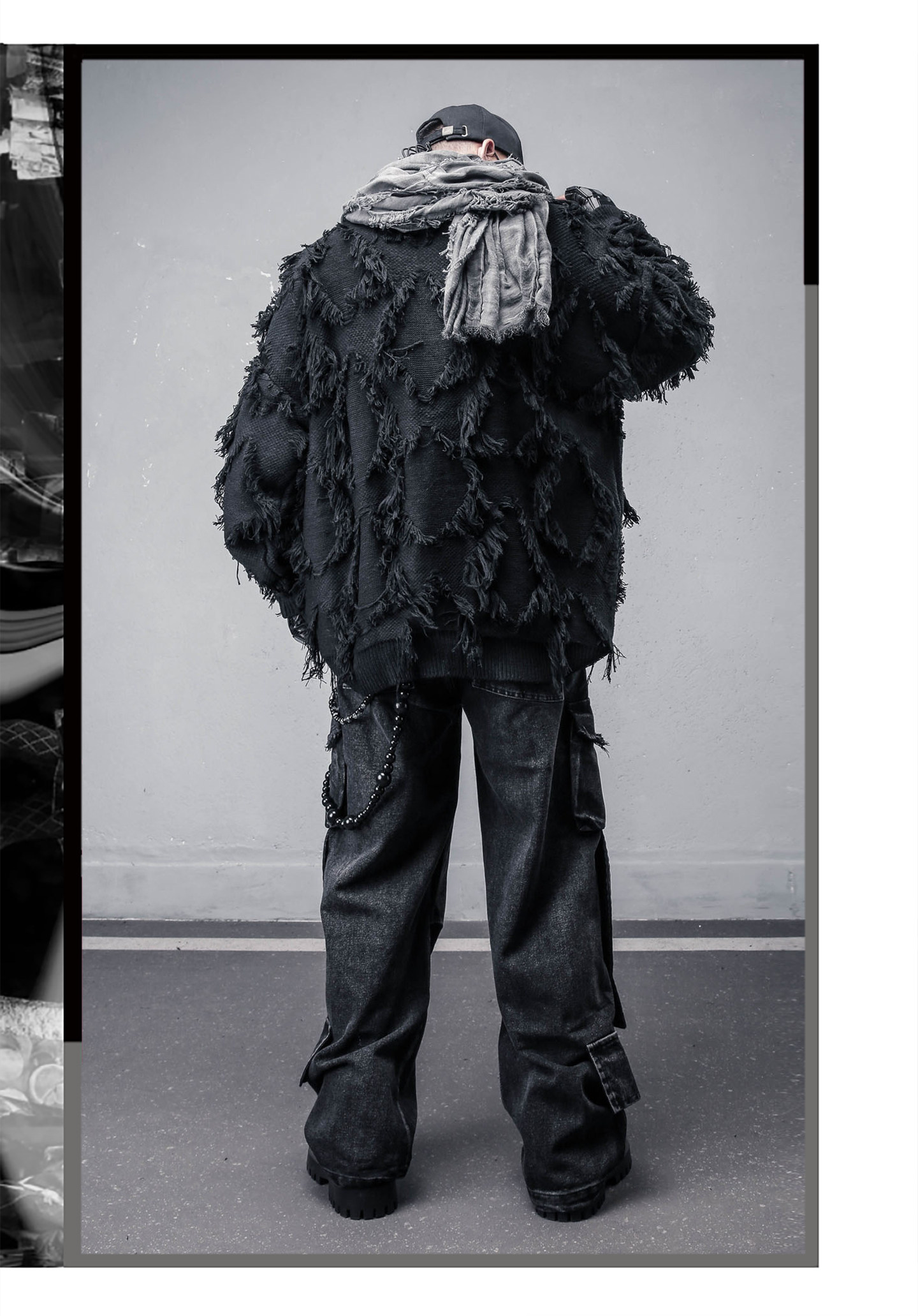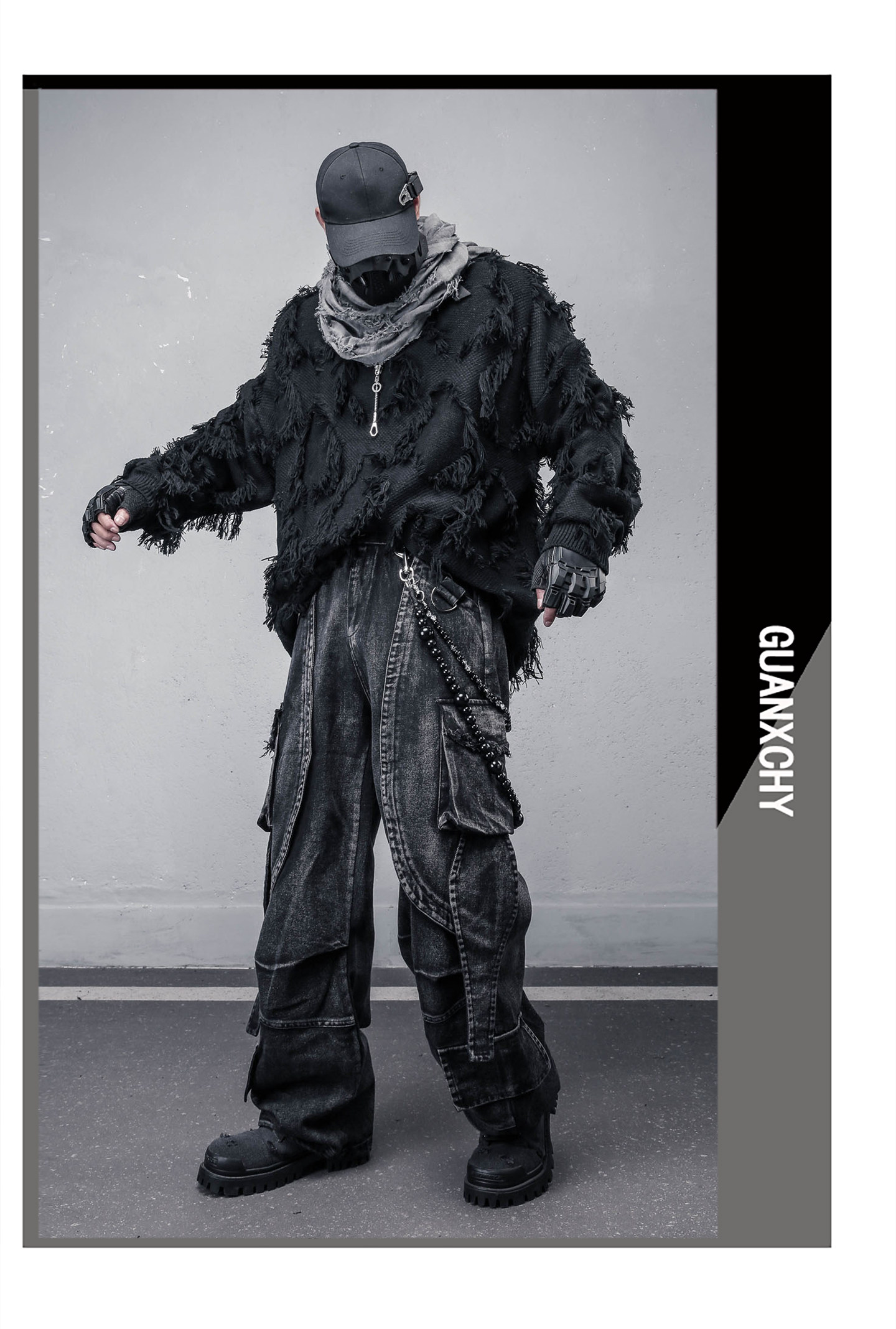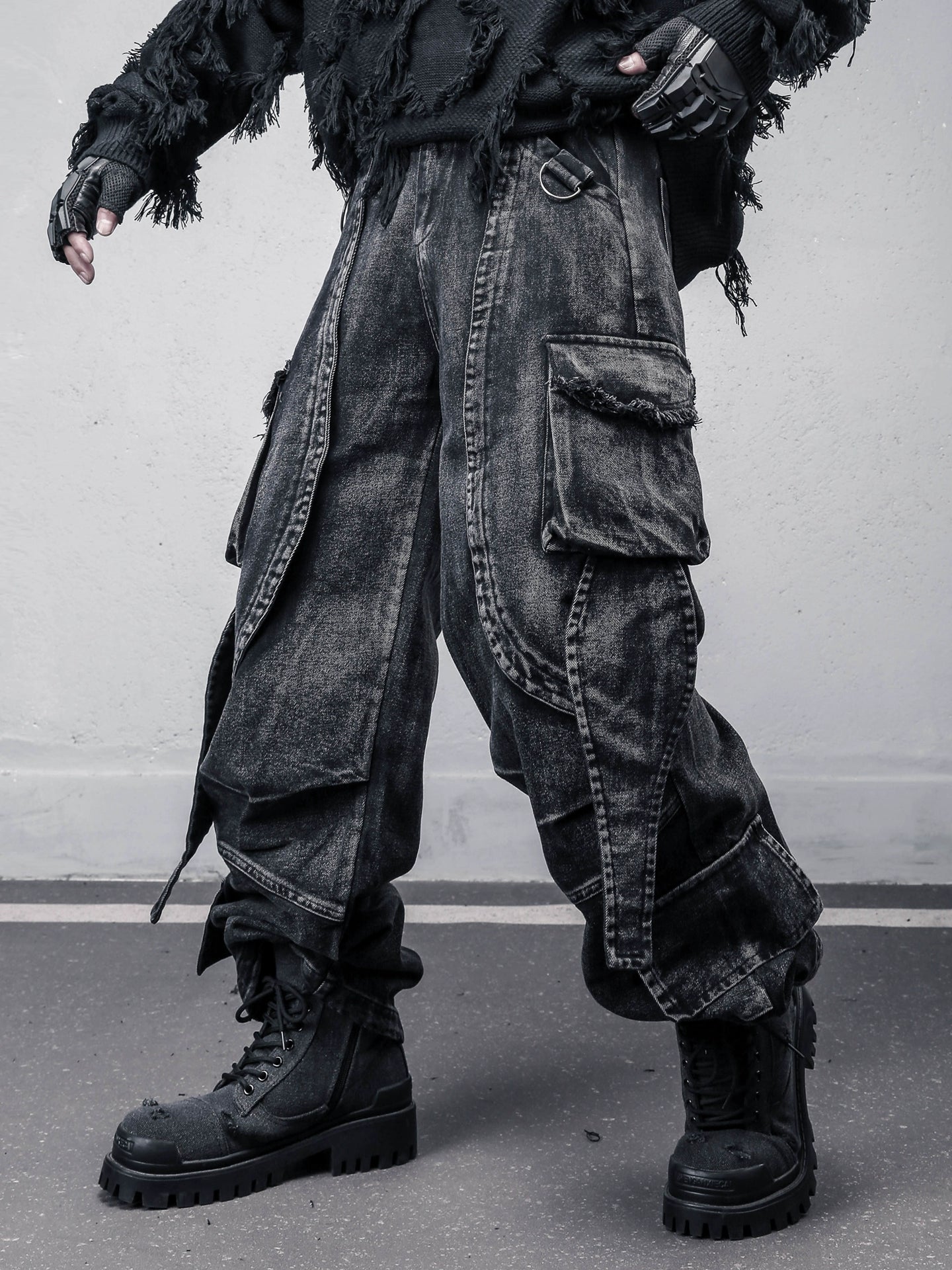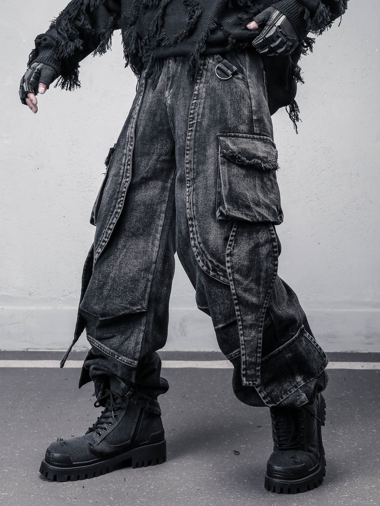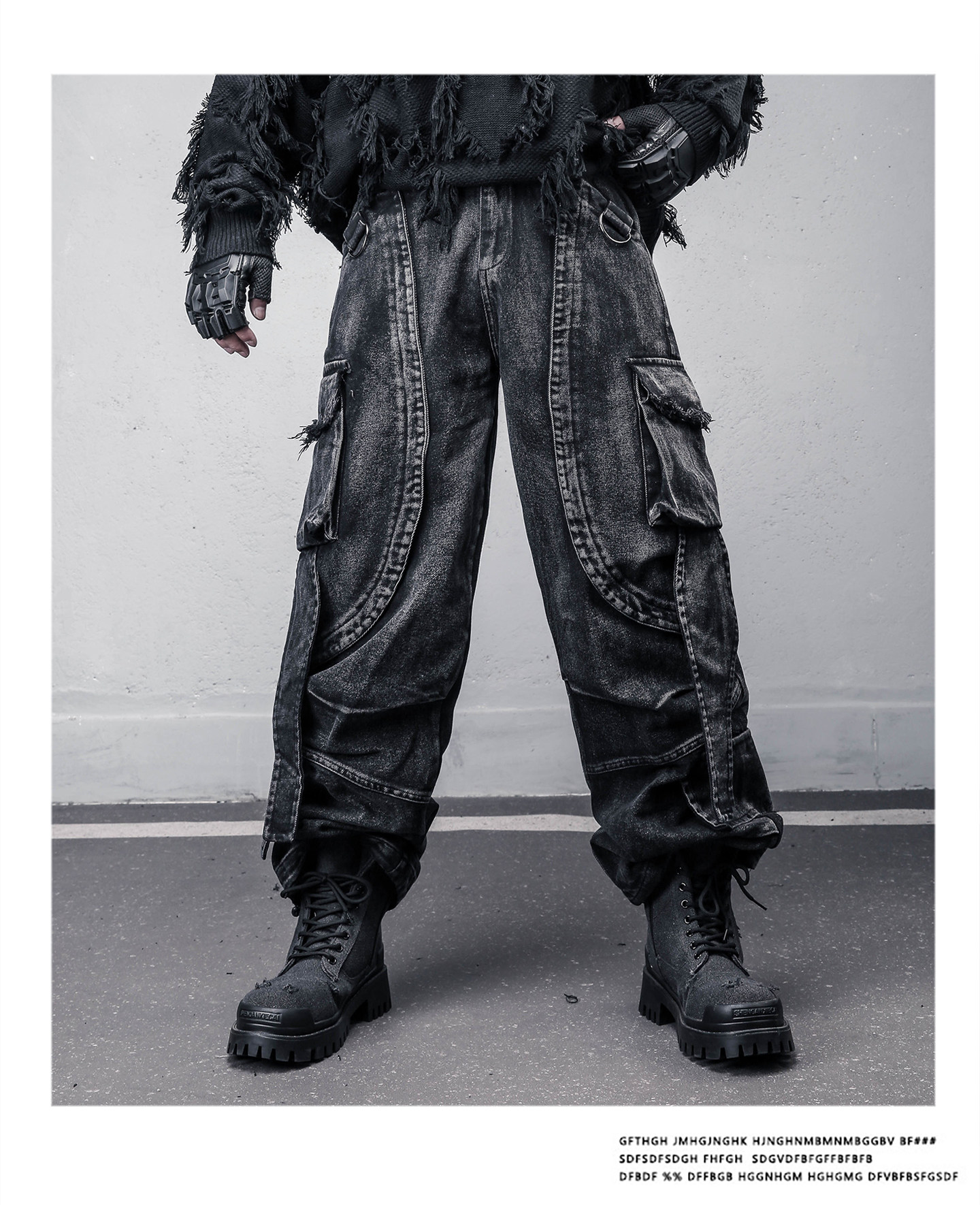 Multi Pocket Wash Damage Wide Leg Denim Jeans WN22388