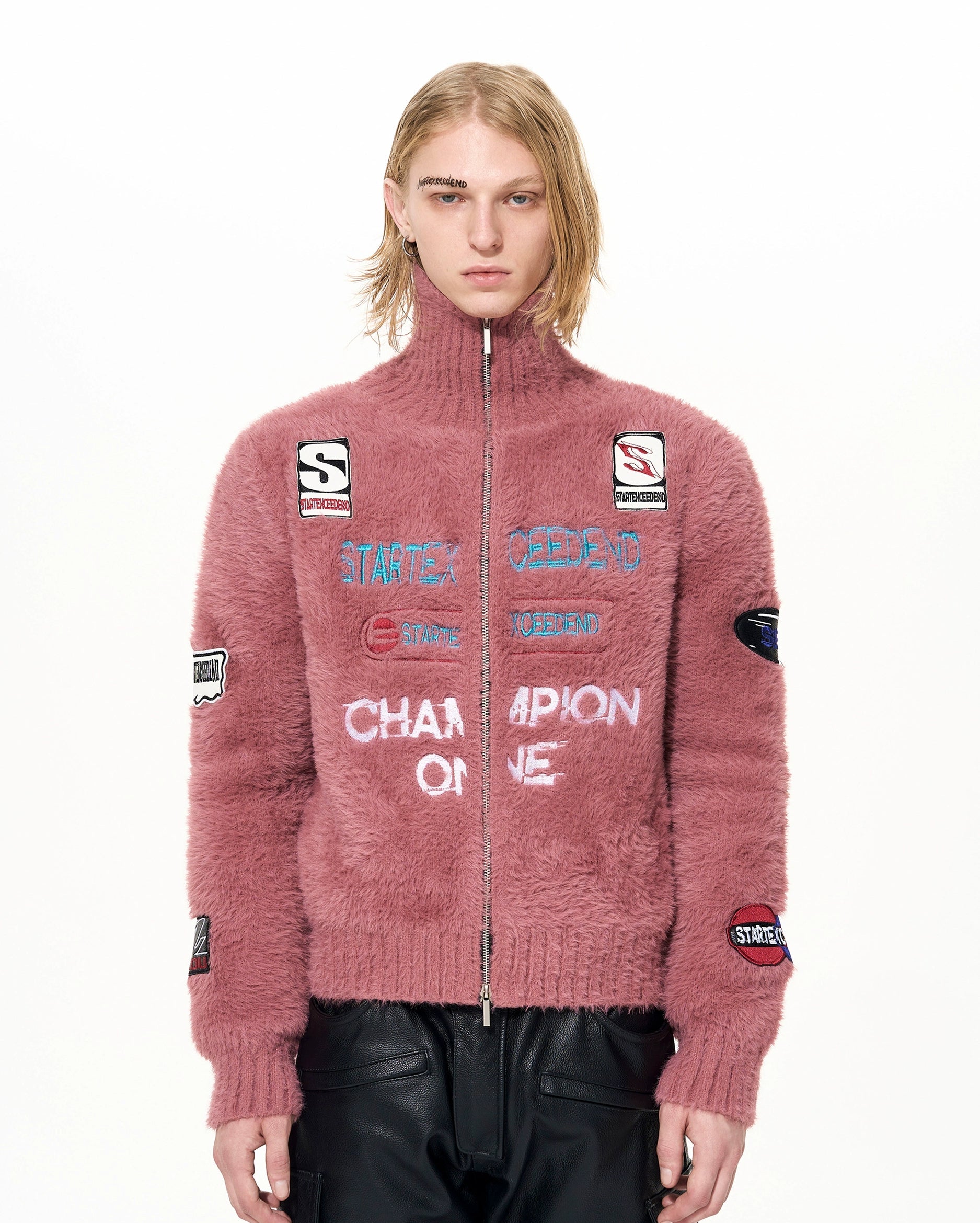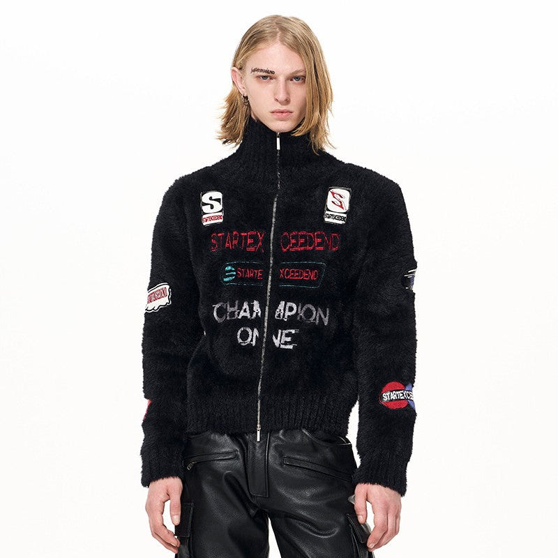 Letter Embroidery Print High-Neck Zipper Knit Cardigan WN22649