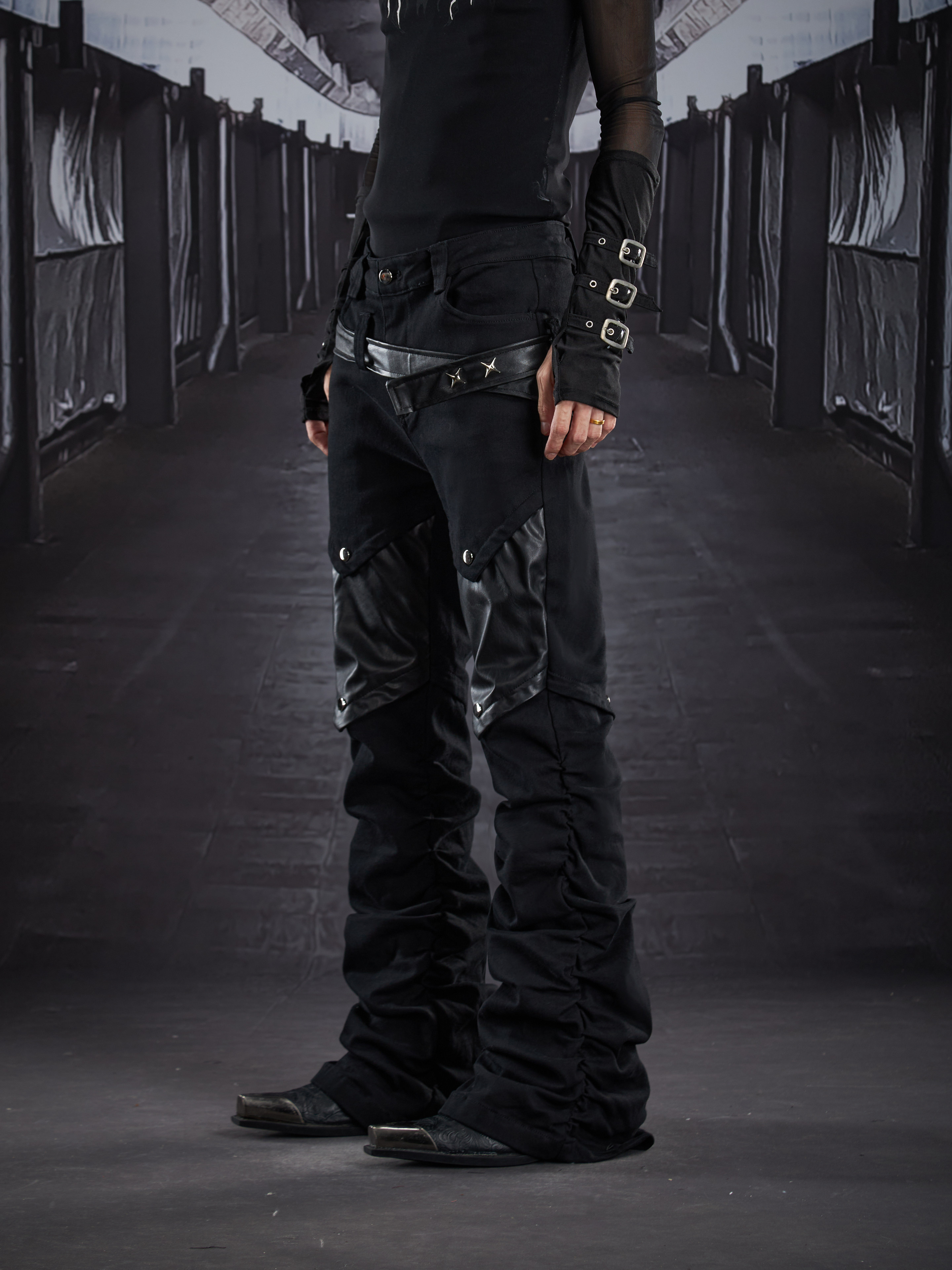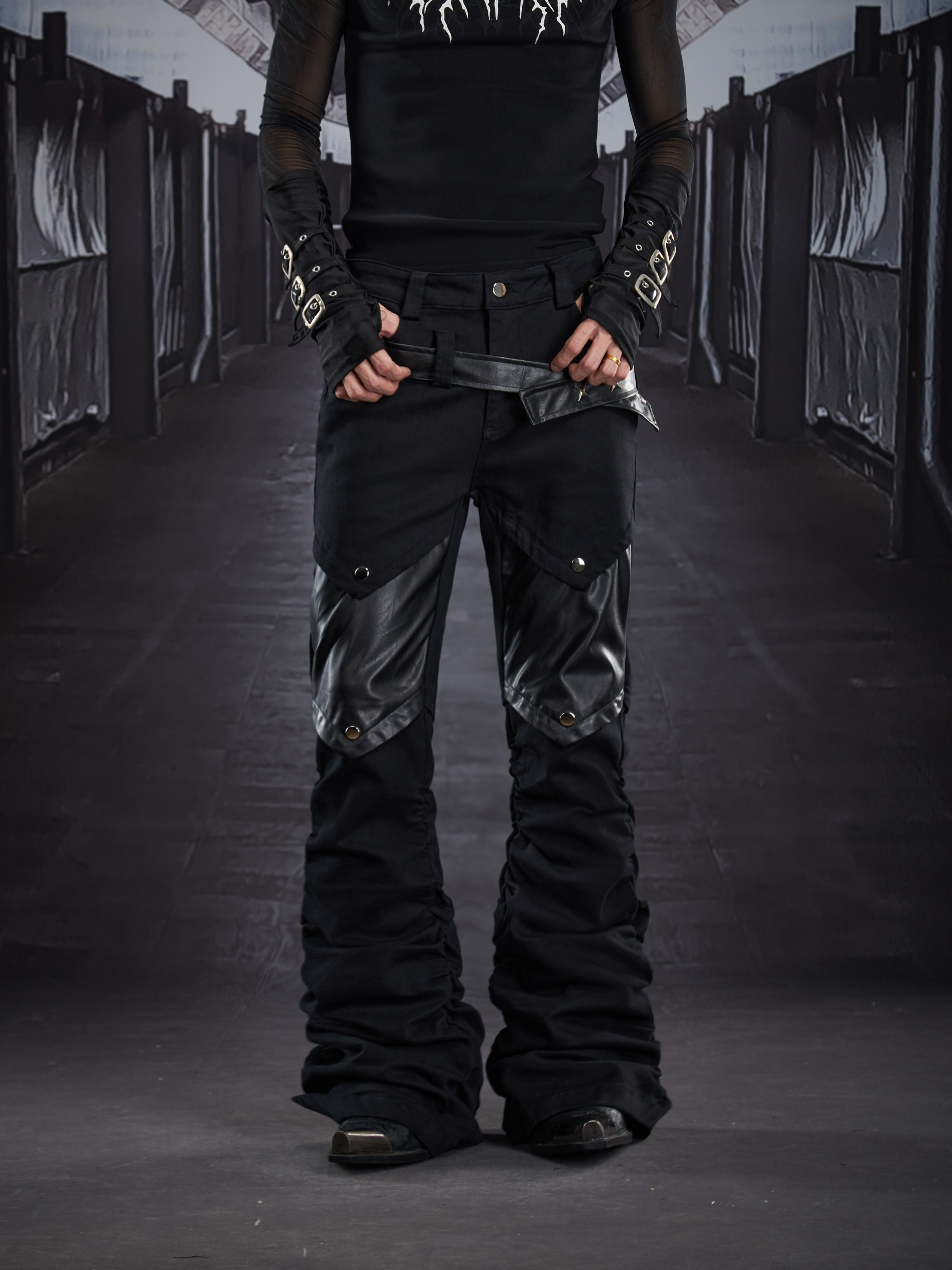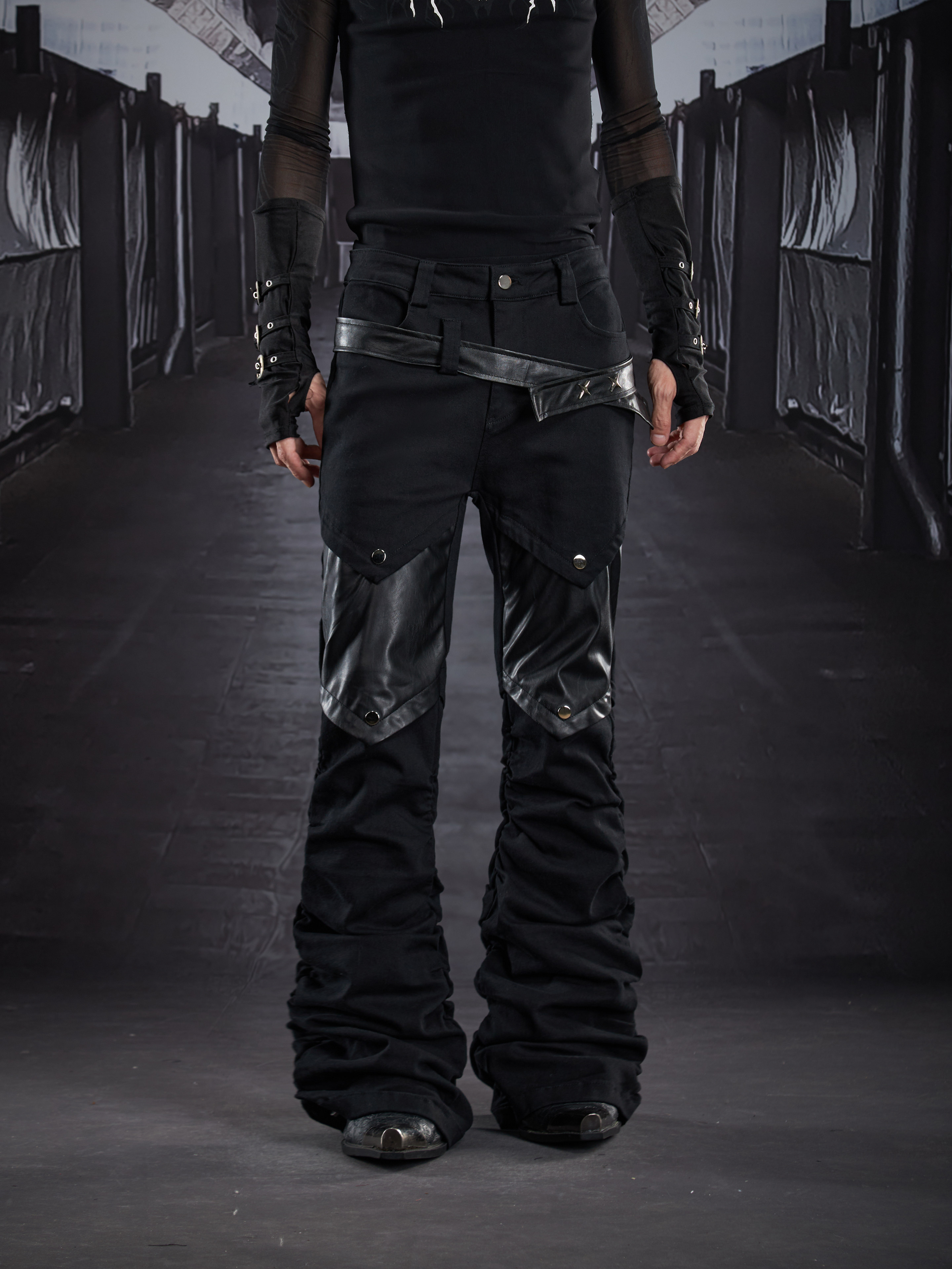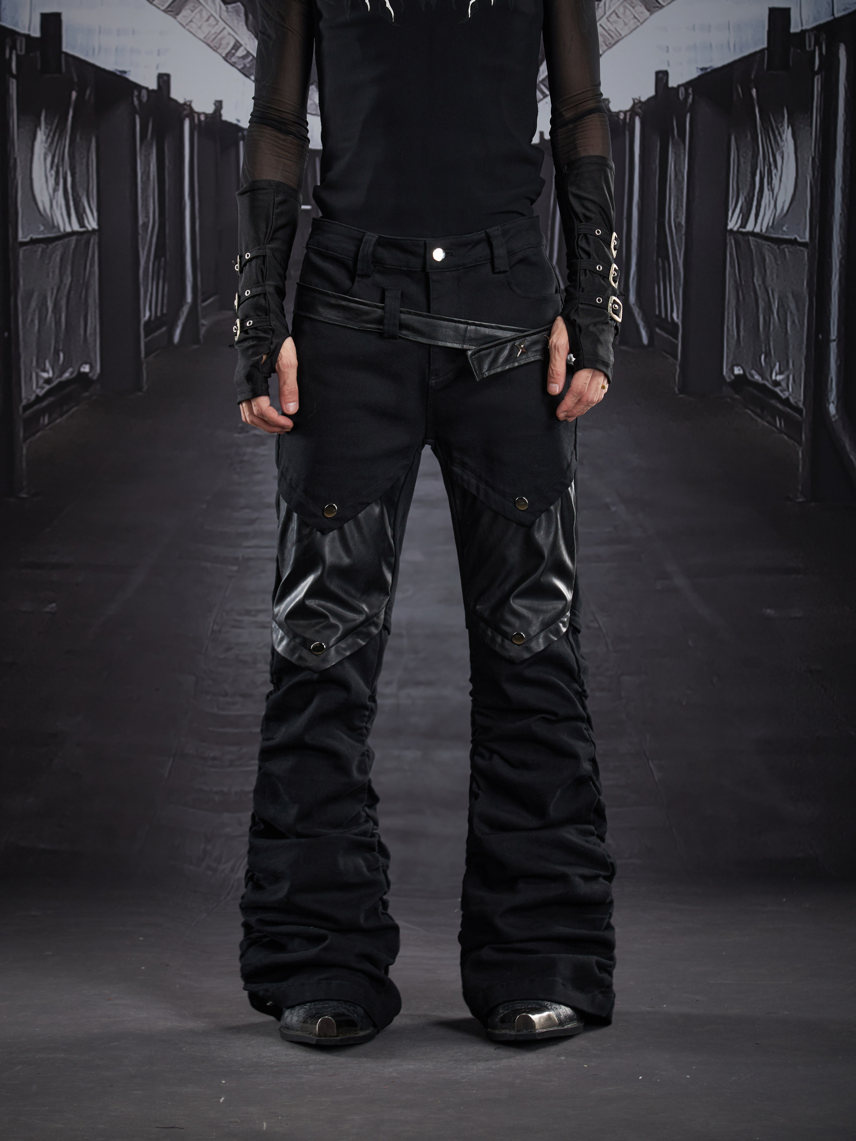 Metal Detail PU Leather Stretch Flare Denim Jeans WN22790