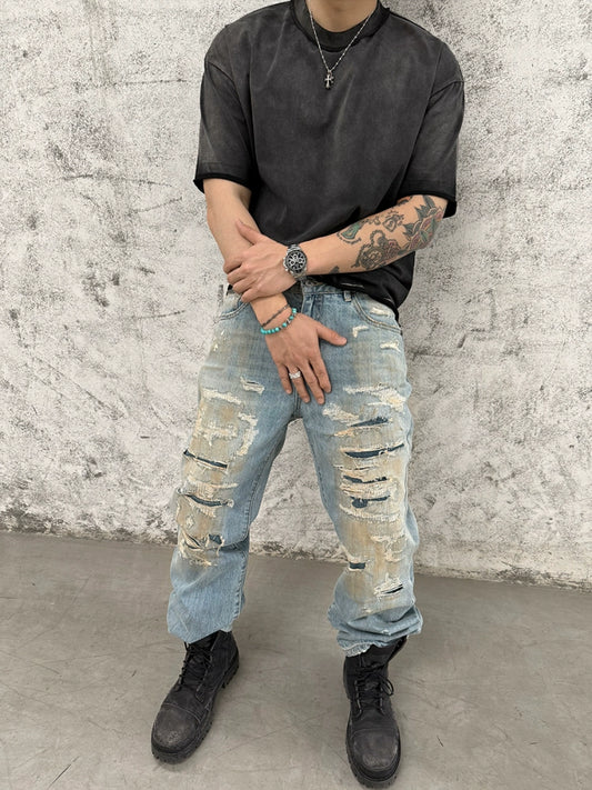 Mud Dye Slash Damage Wide Leg Denim Jeans WN17633