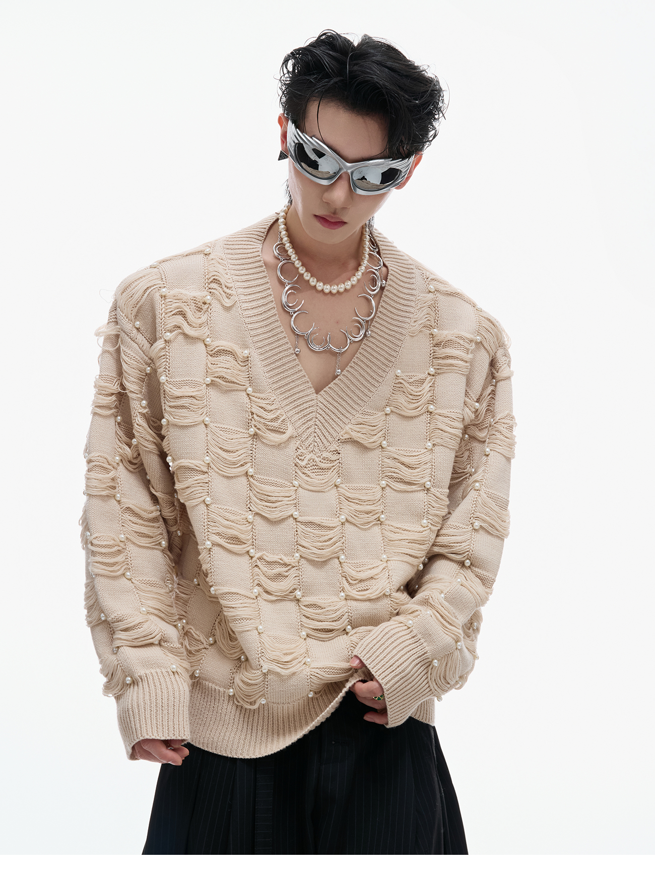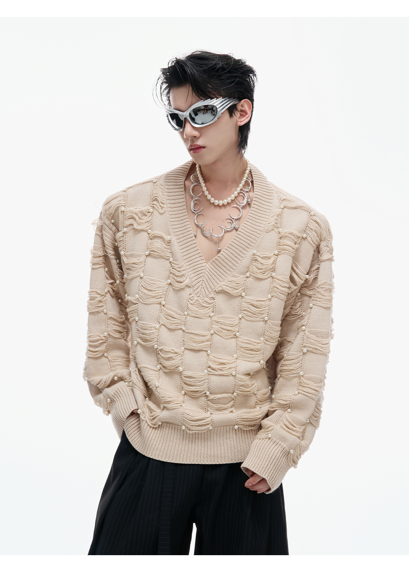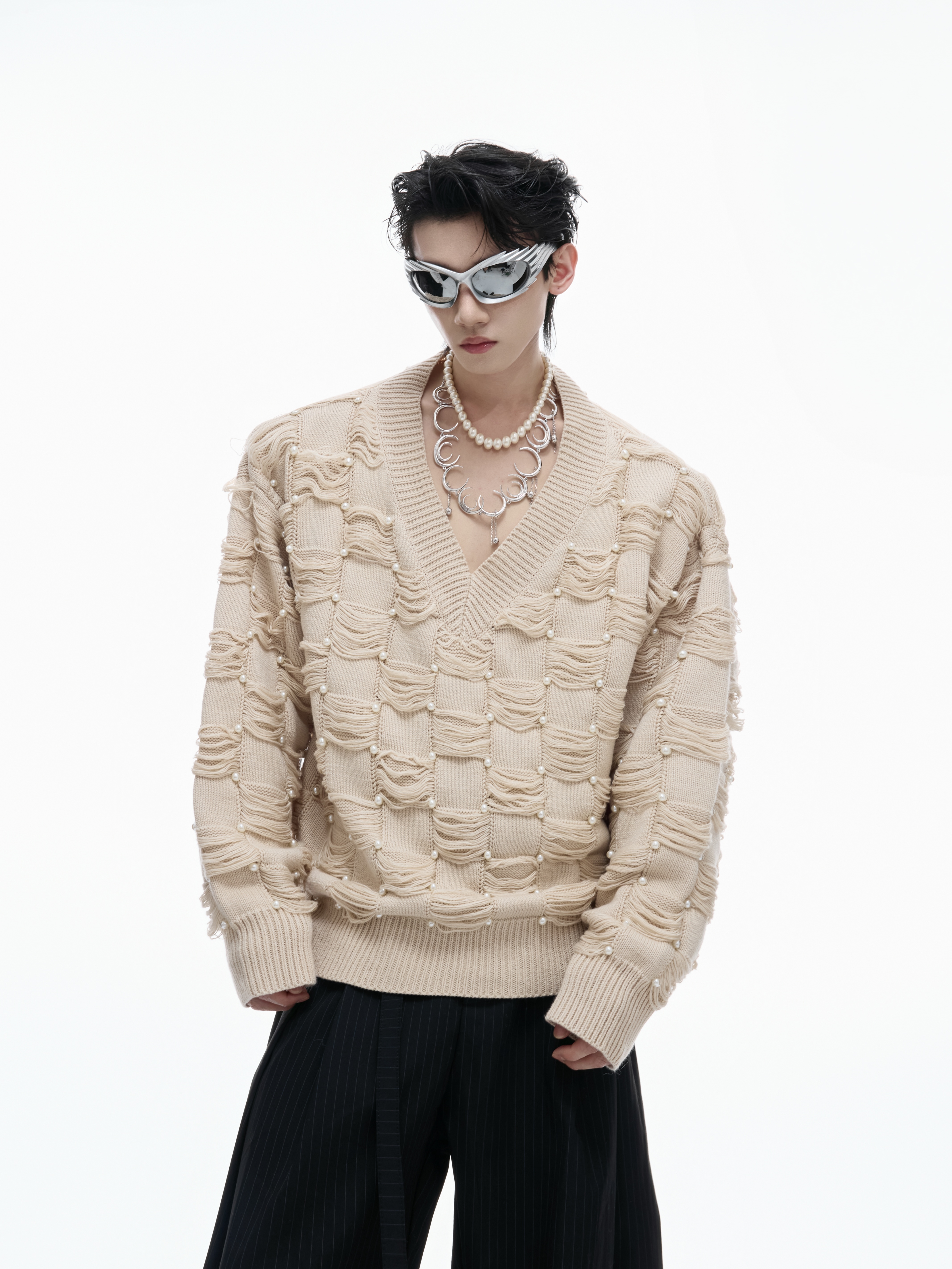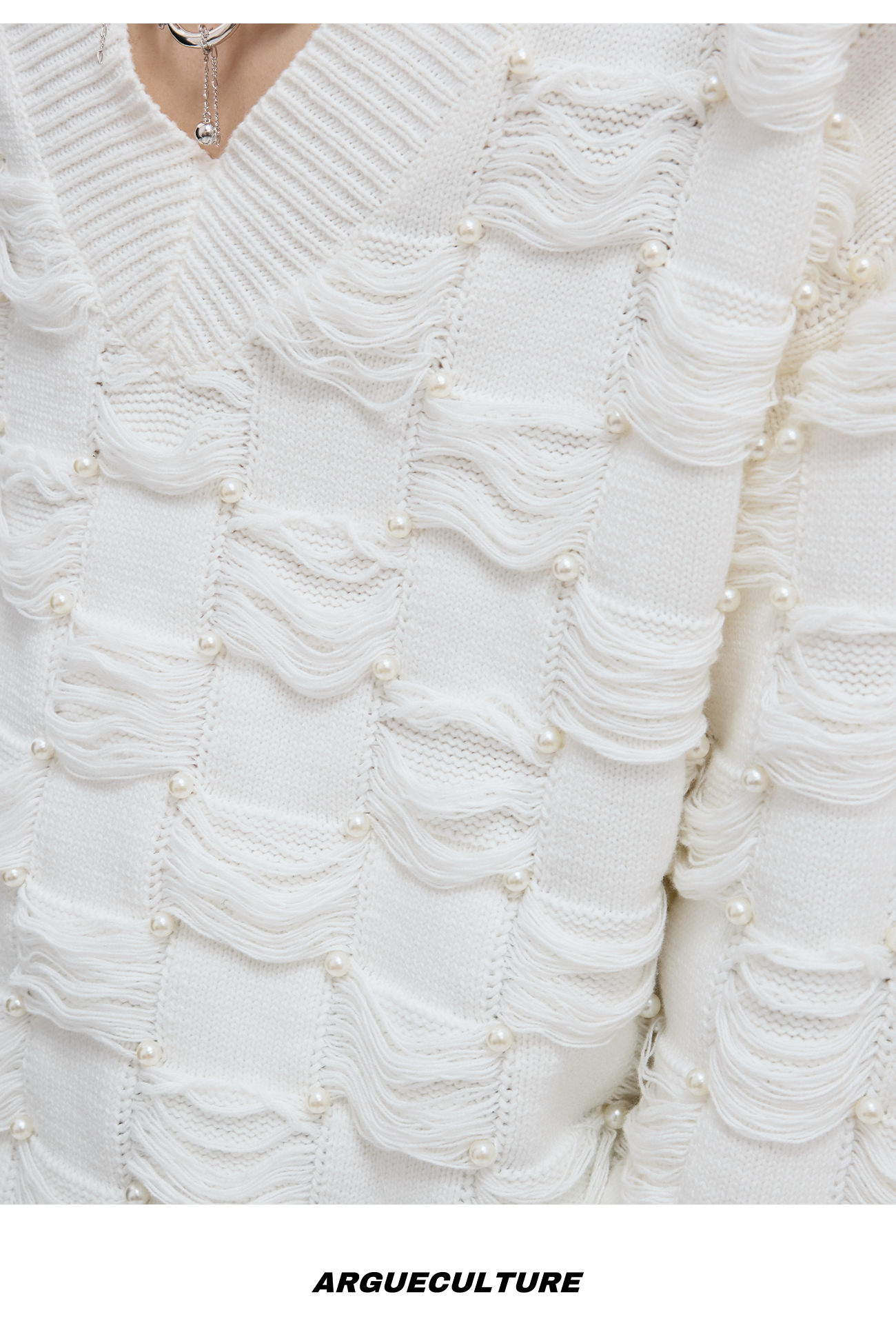 Pearl Beads V-Neck Fringe Knit Sweater WN21222