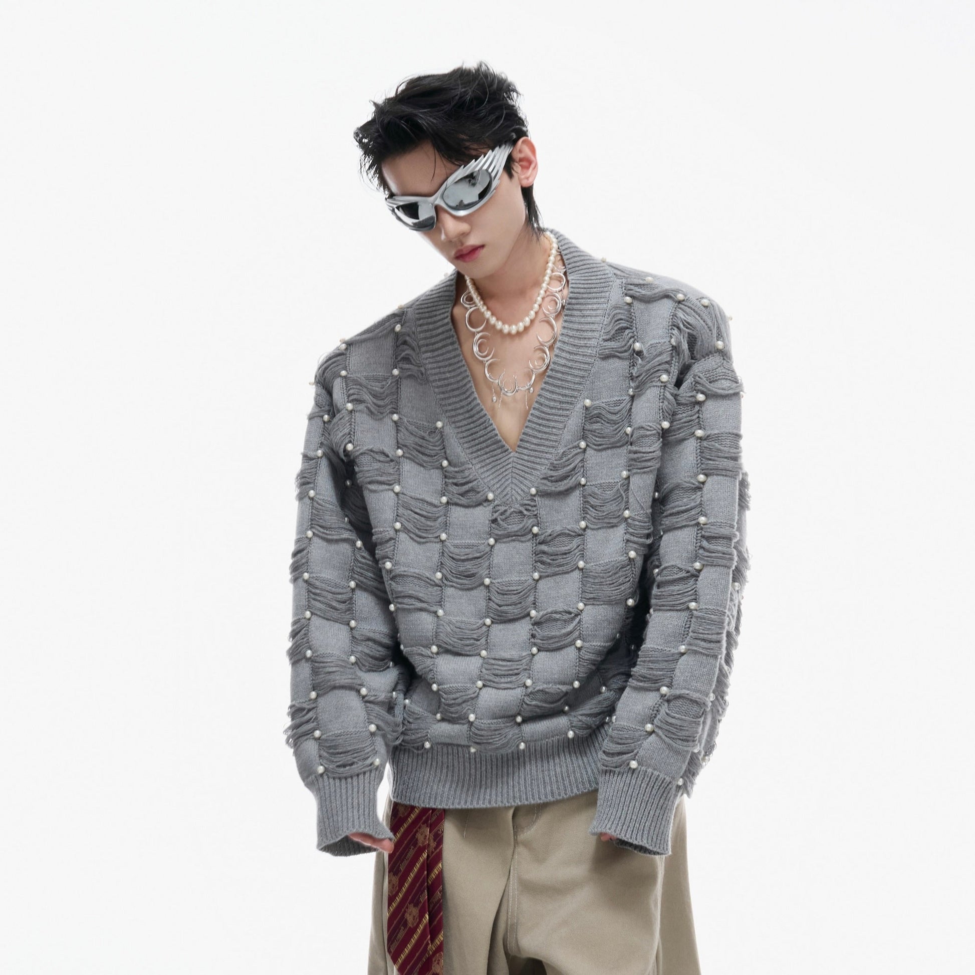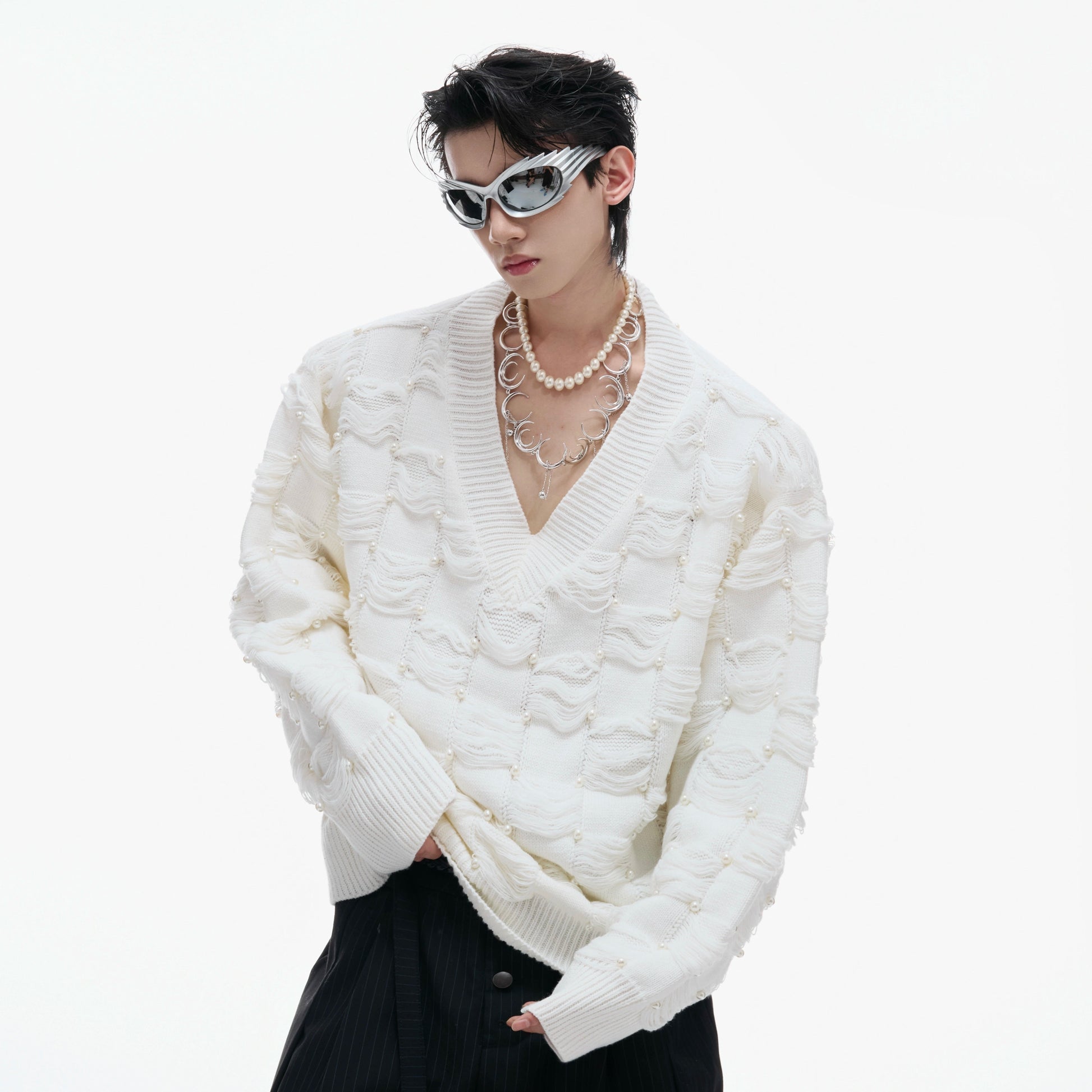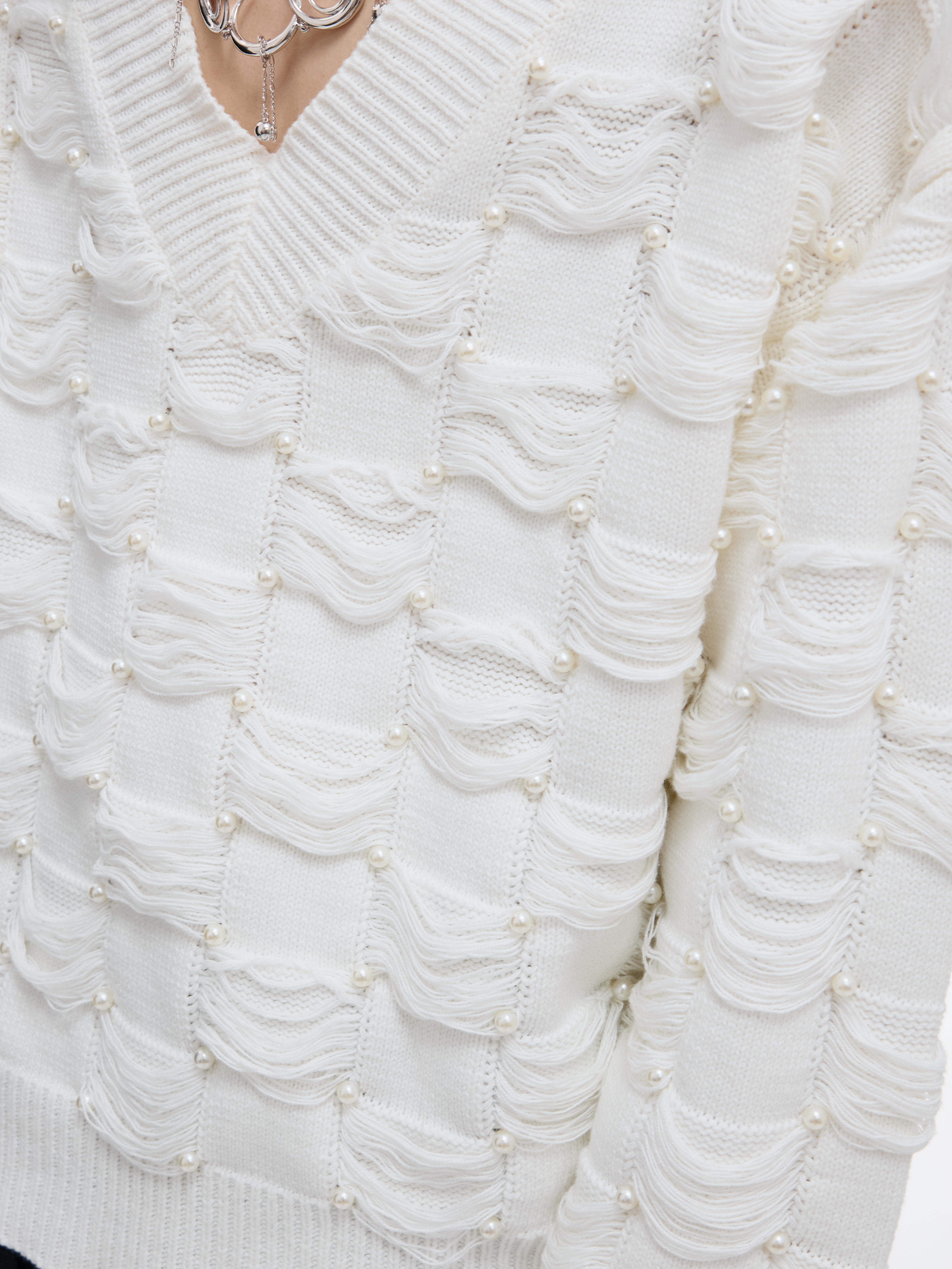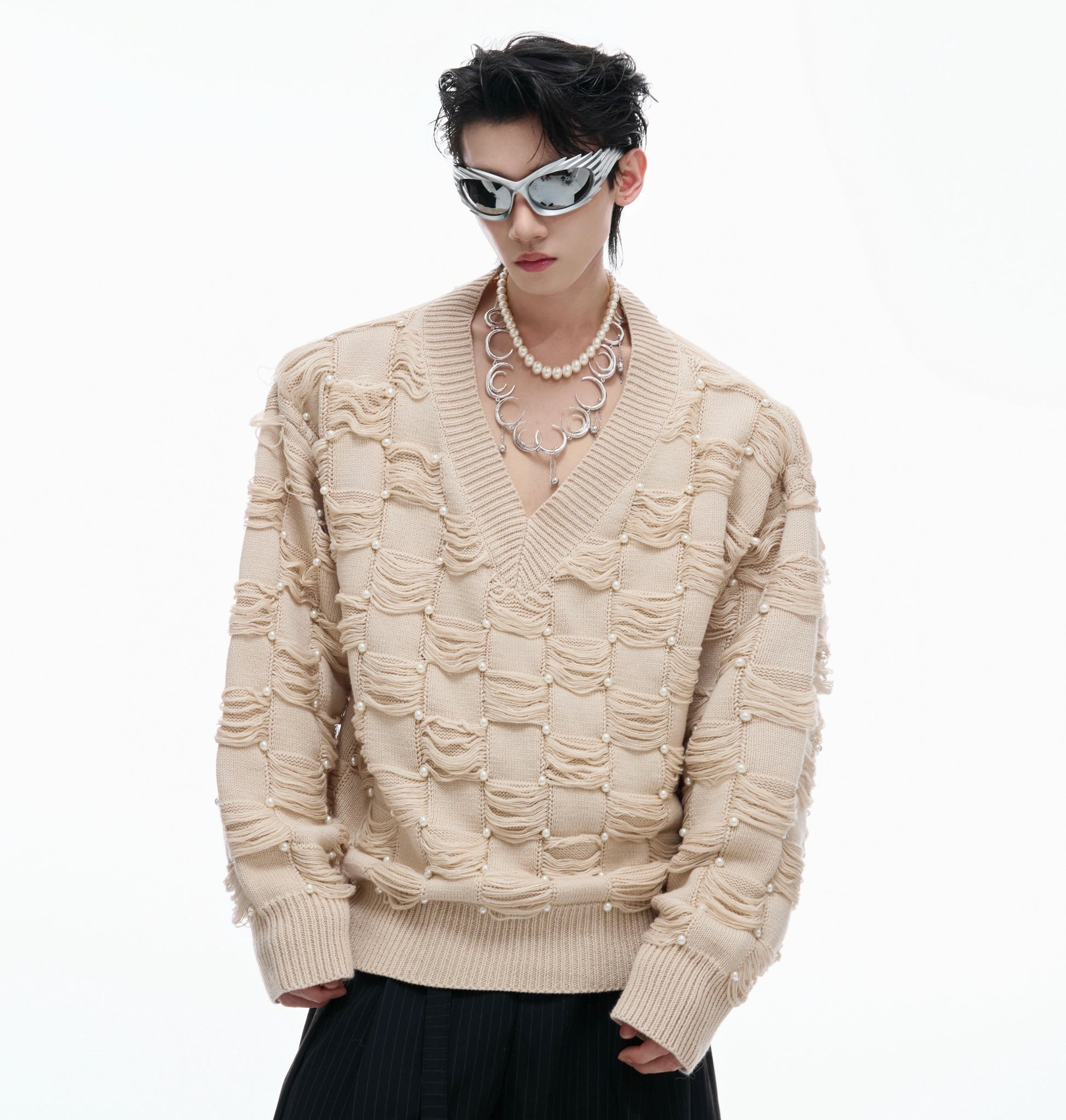 Pearl Beads V-Neck Fringe Knit Sweater WN21222