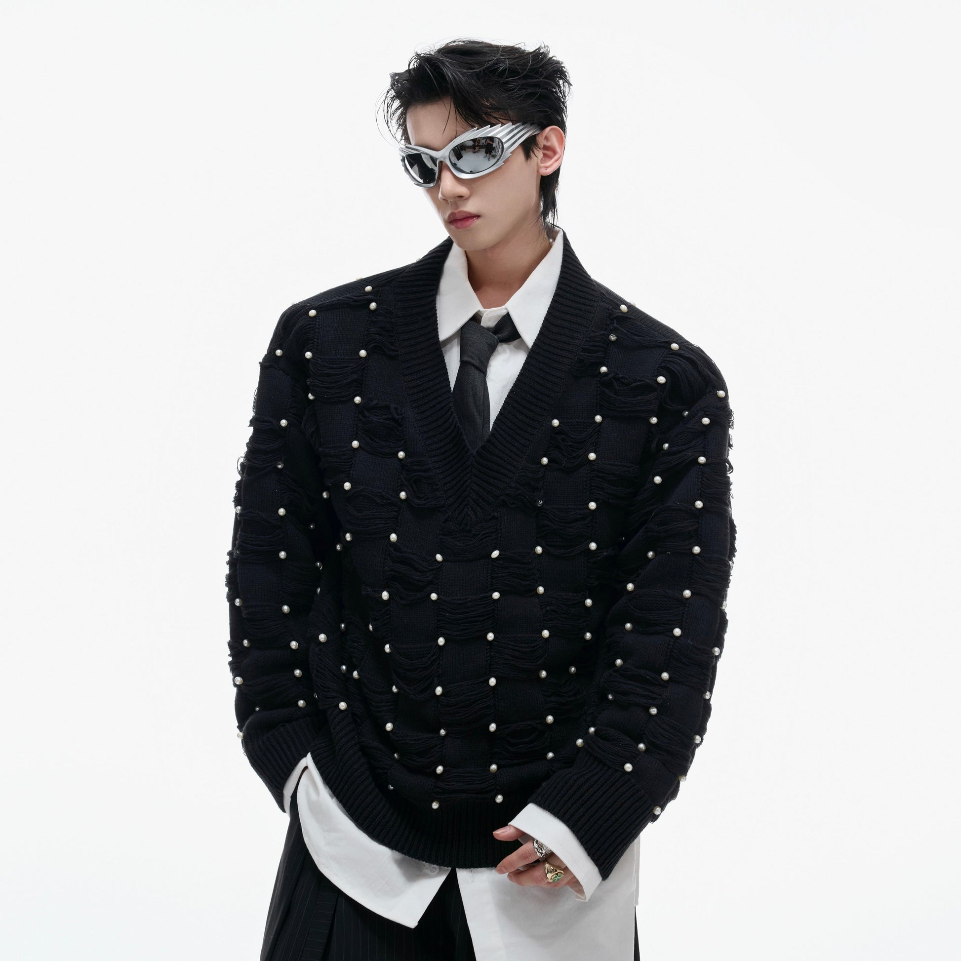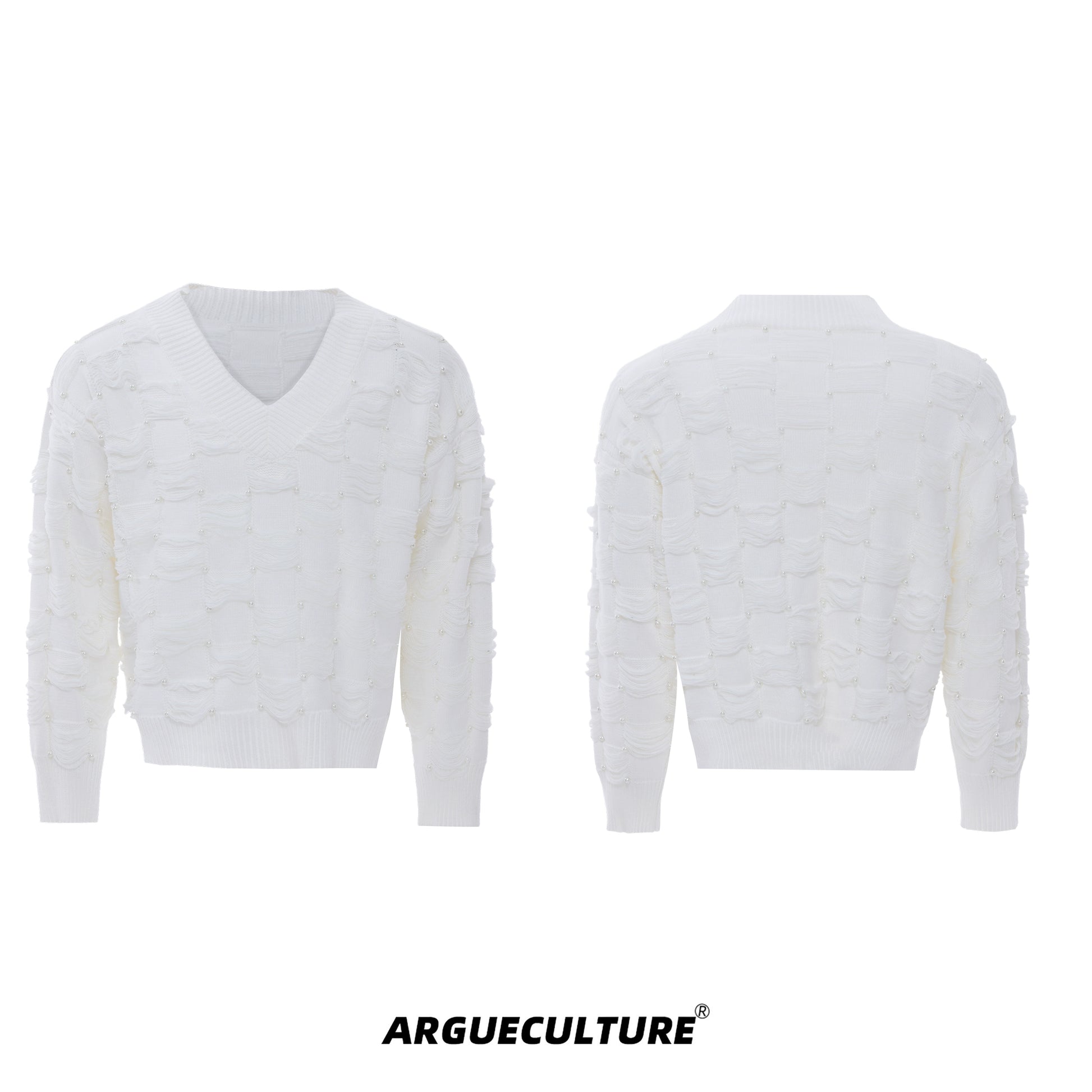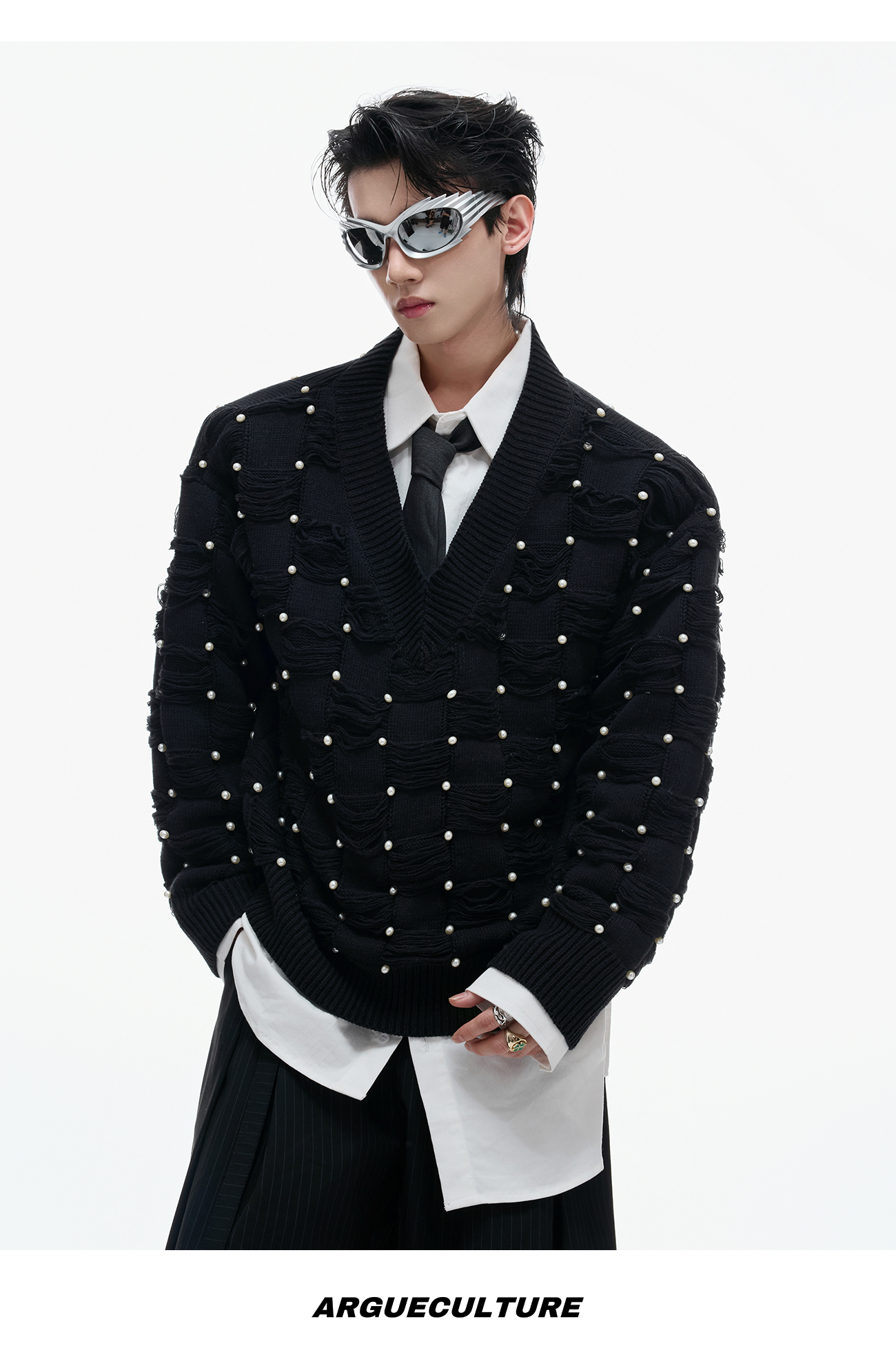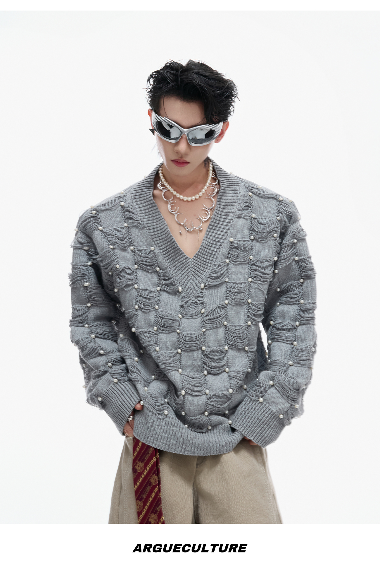 Pearl Beads V-Neck Fringe Knit Sweater WN21222