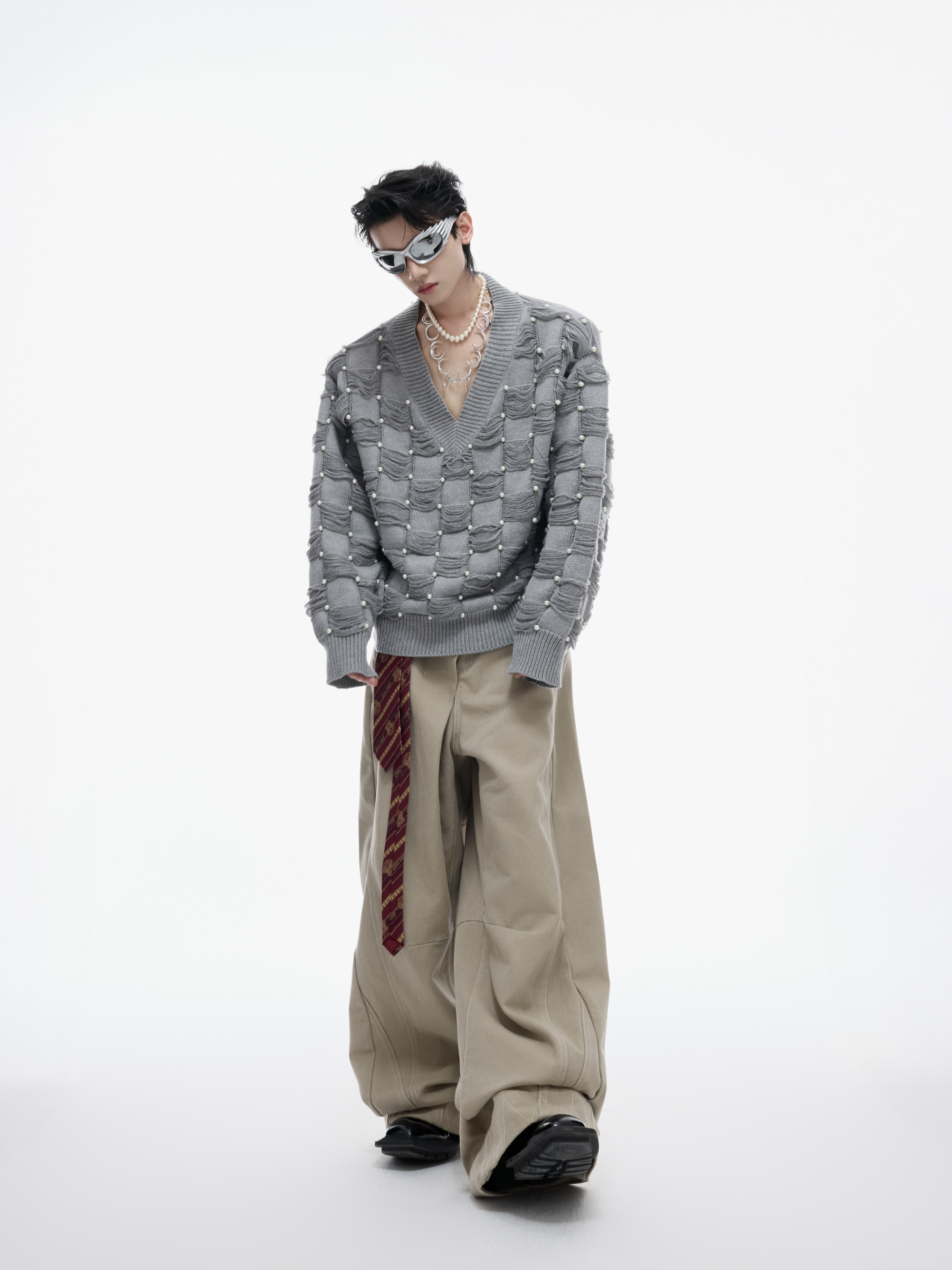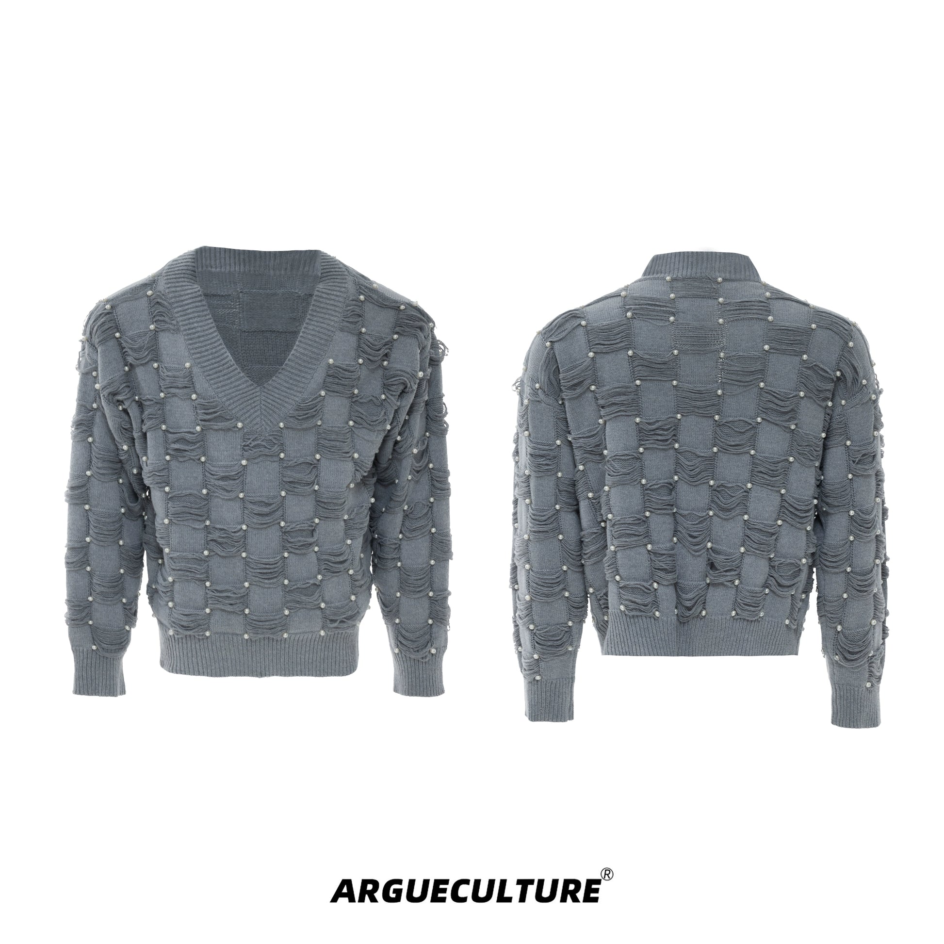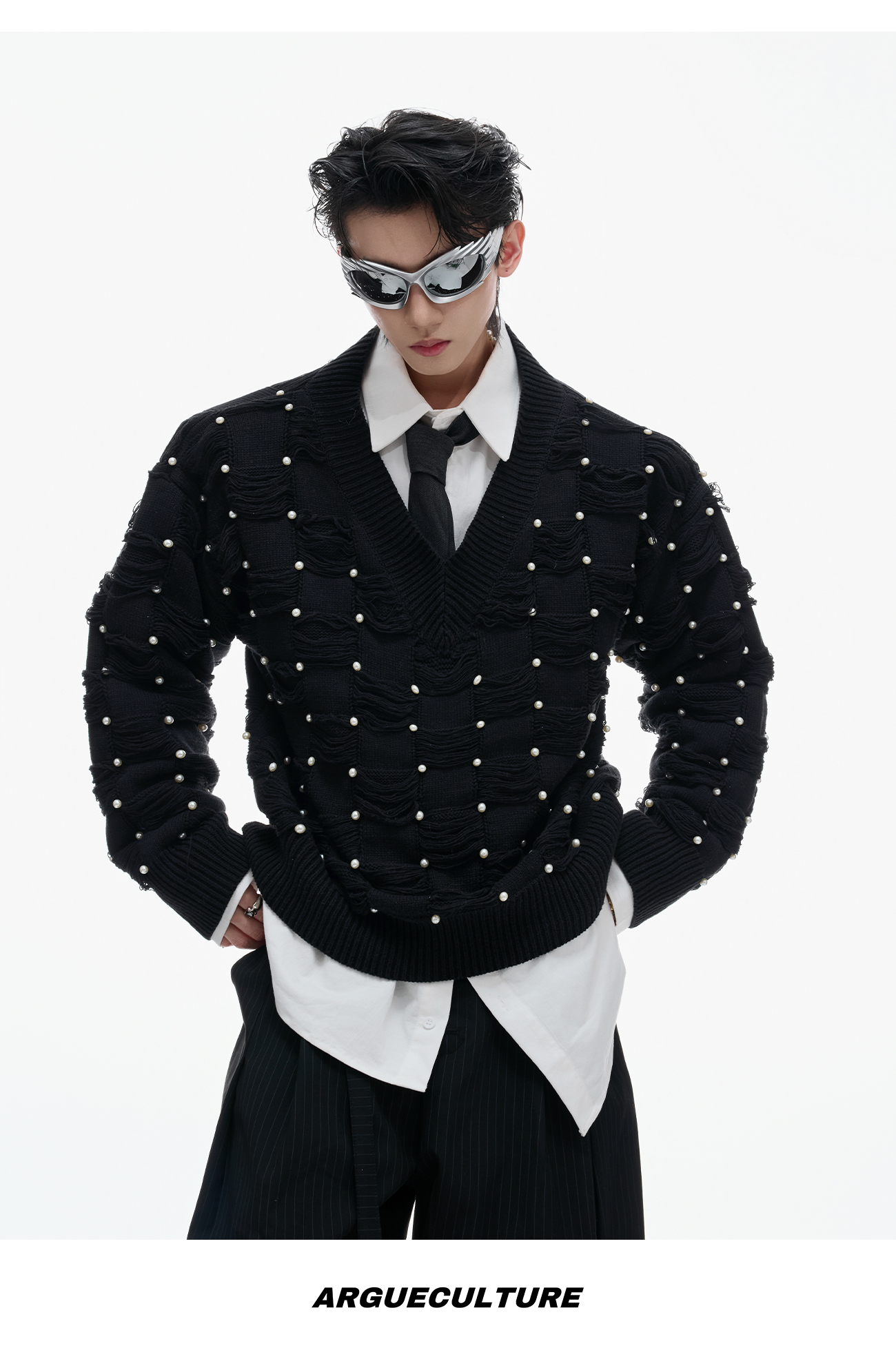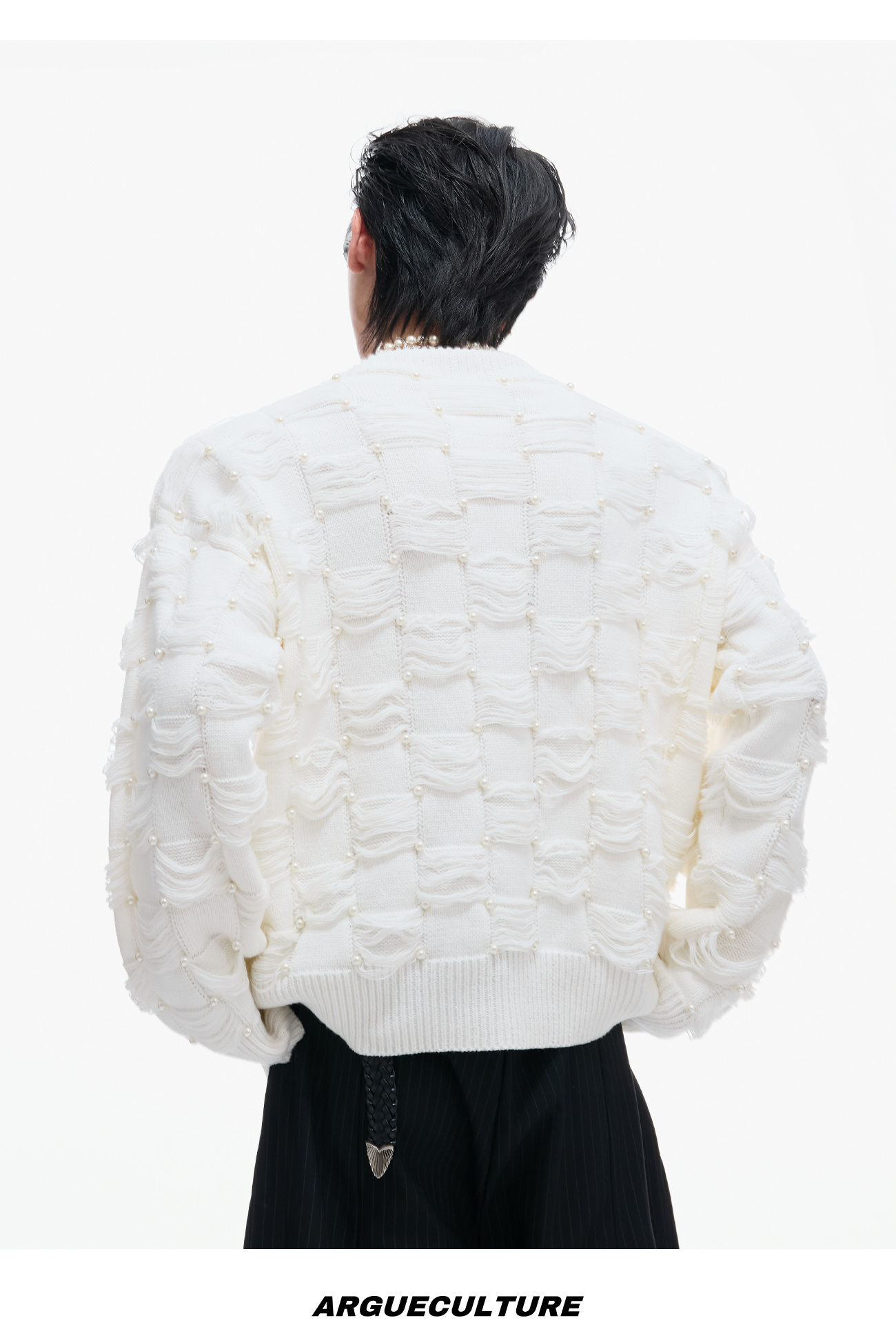 Pearl Beads V-Neck Fringe Knit Sweater WN21222