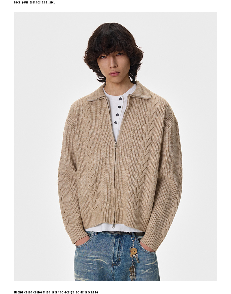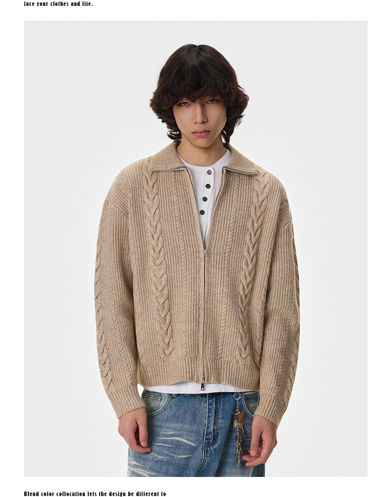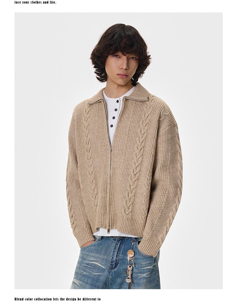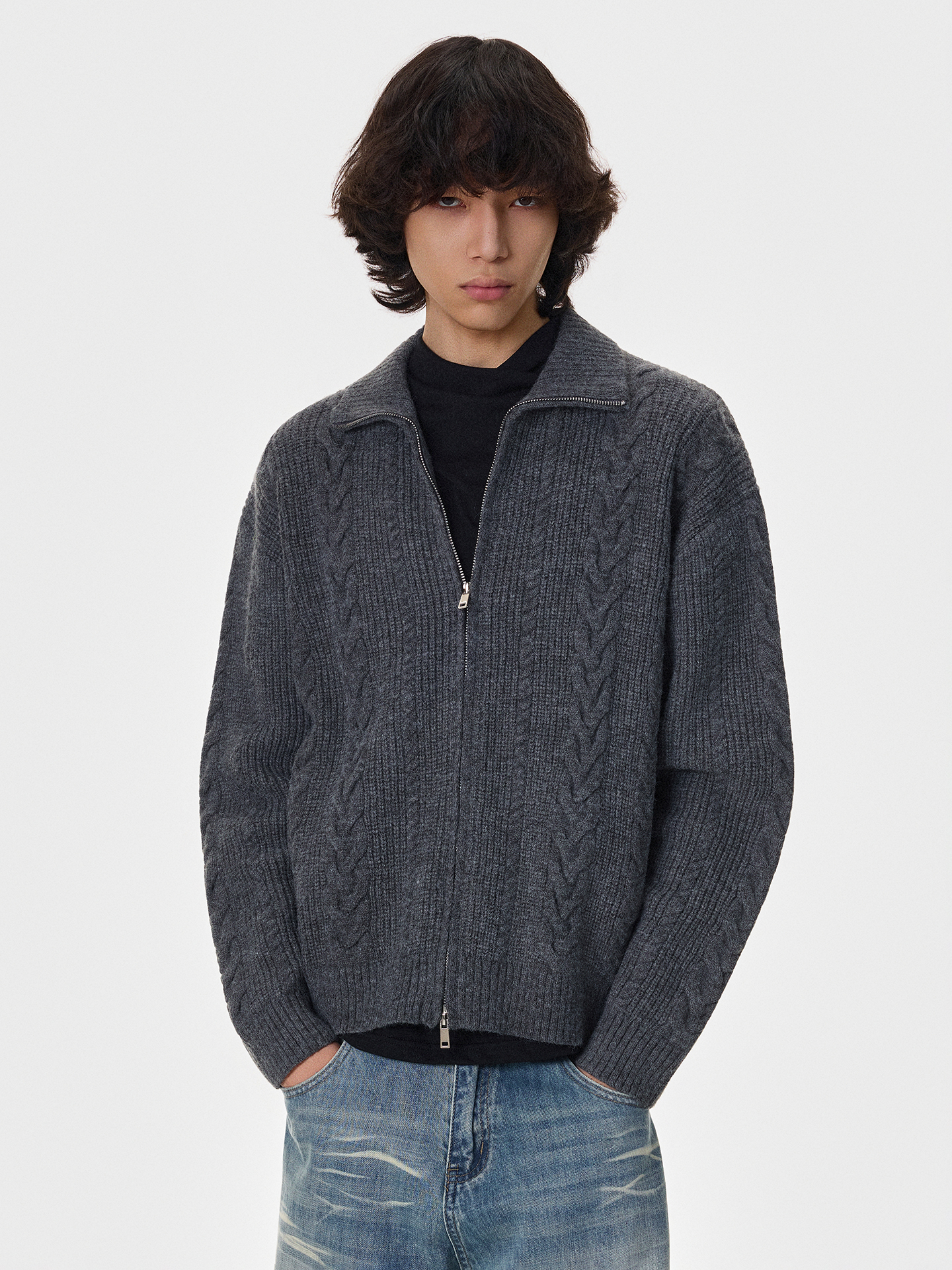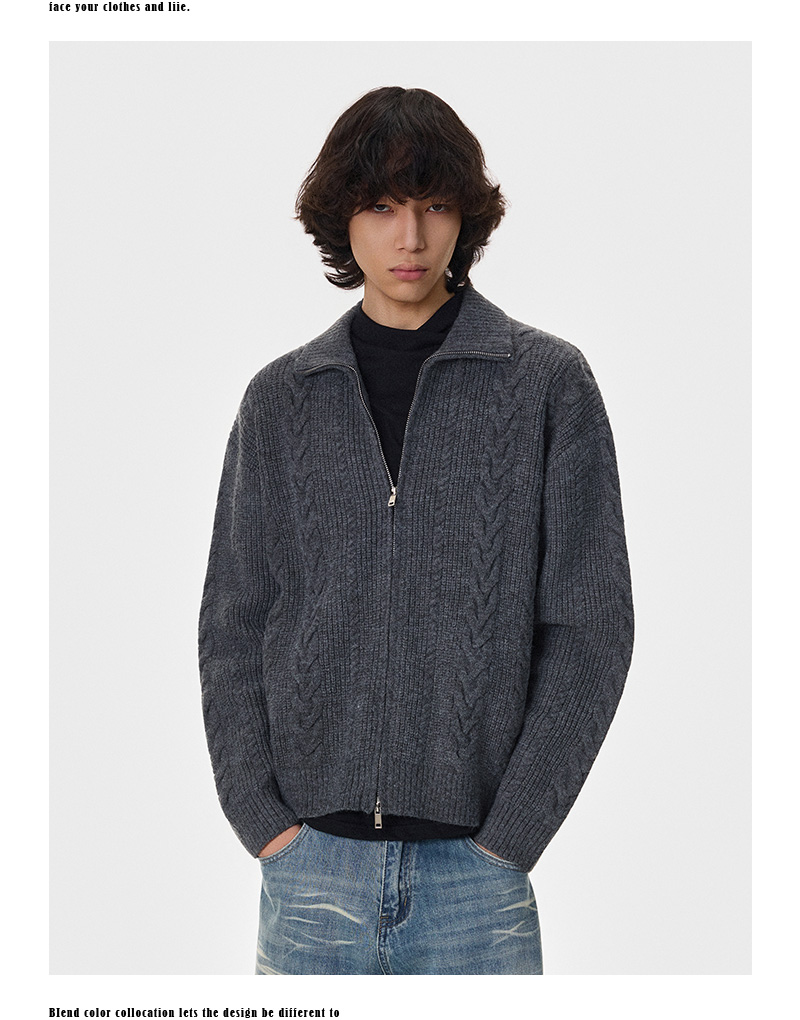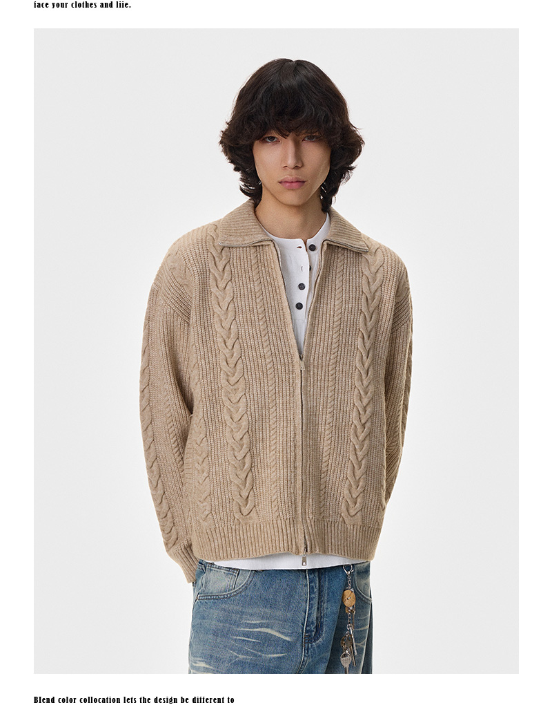 Herringbone Polo-Collar Thick Knit Cardigan WN21403