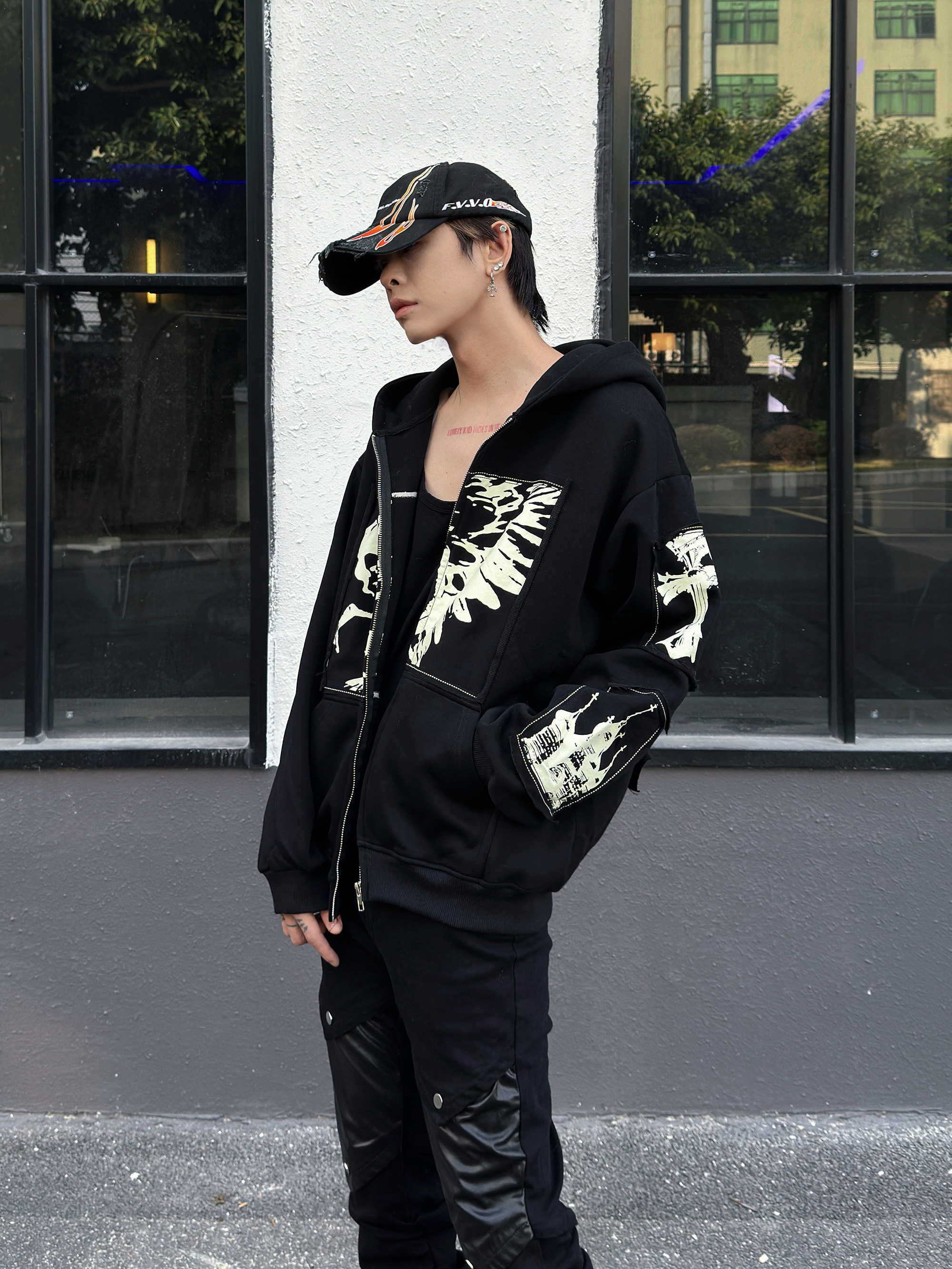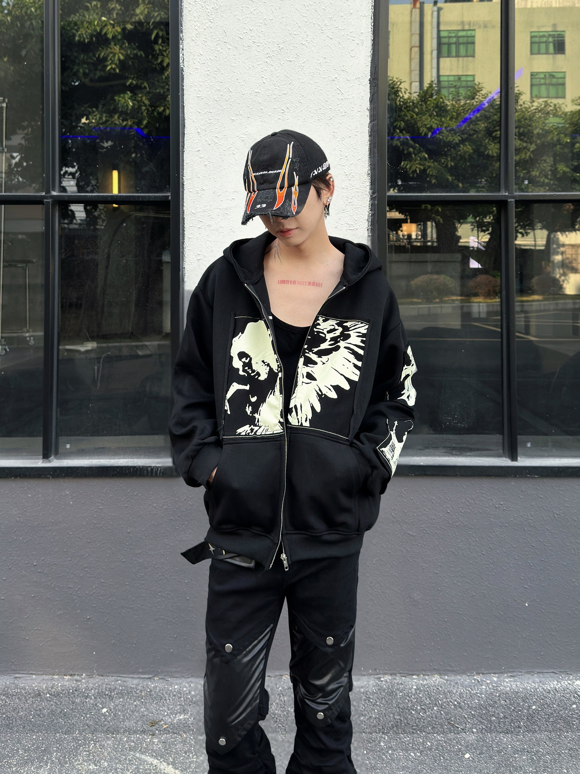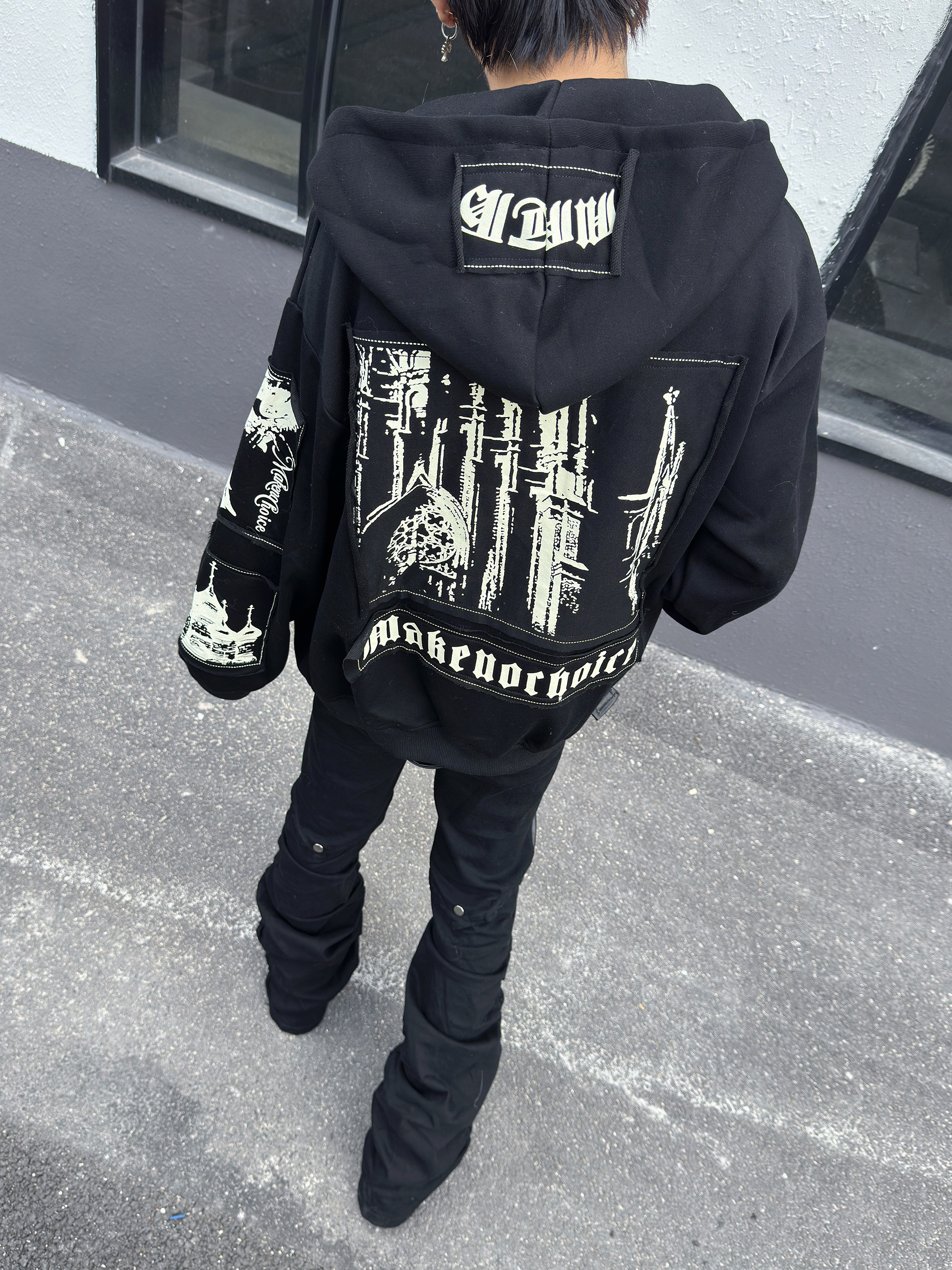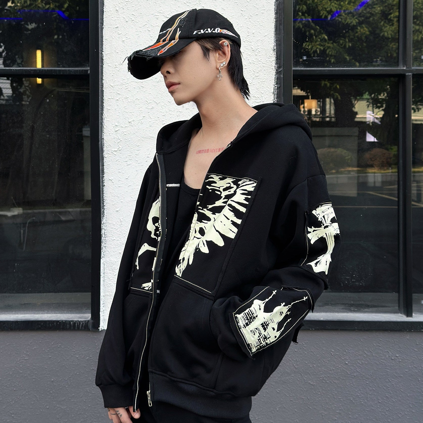 Illustration Patch Wash Damage Zipper Hoodie WN23009