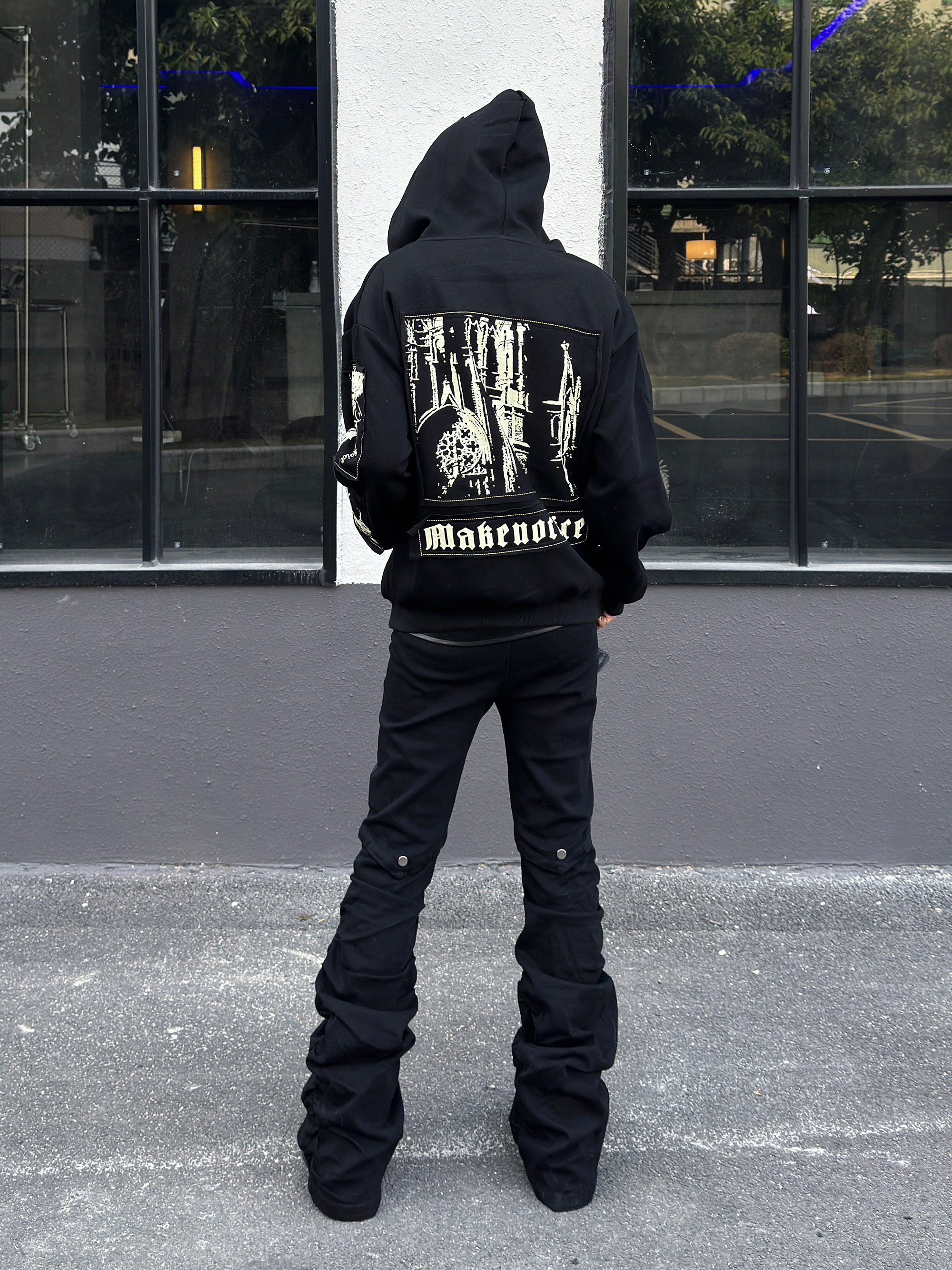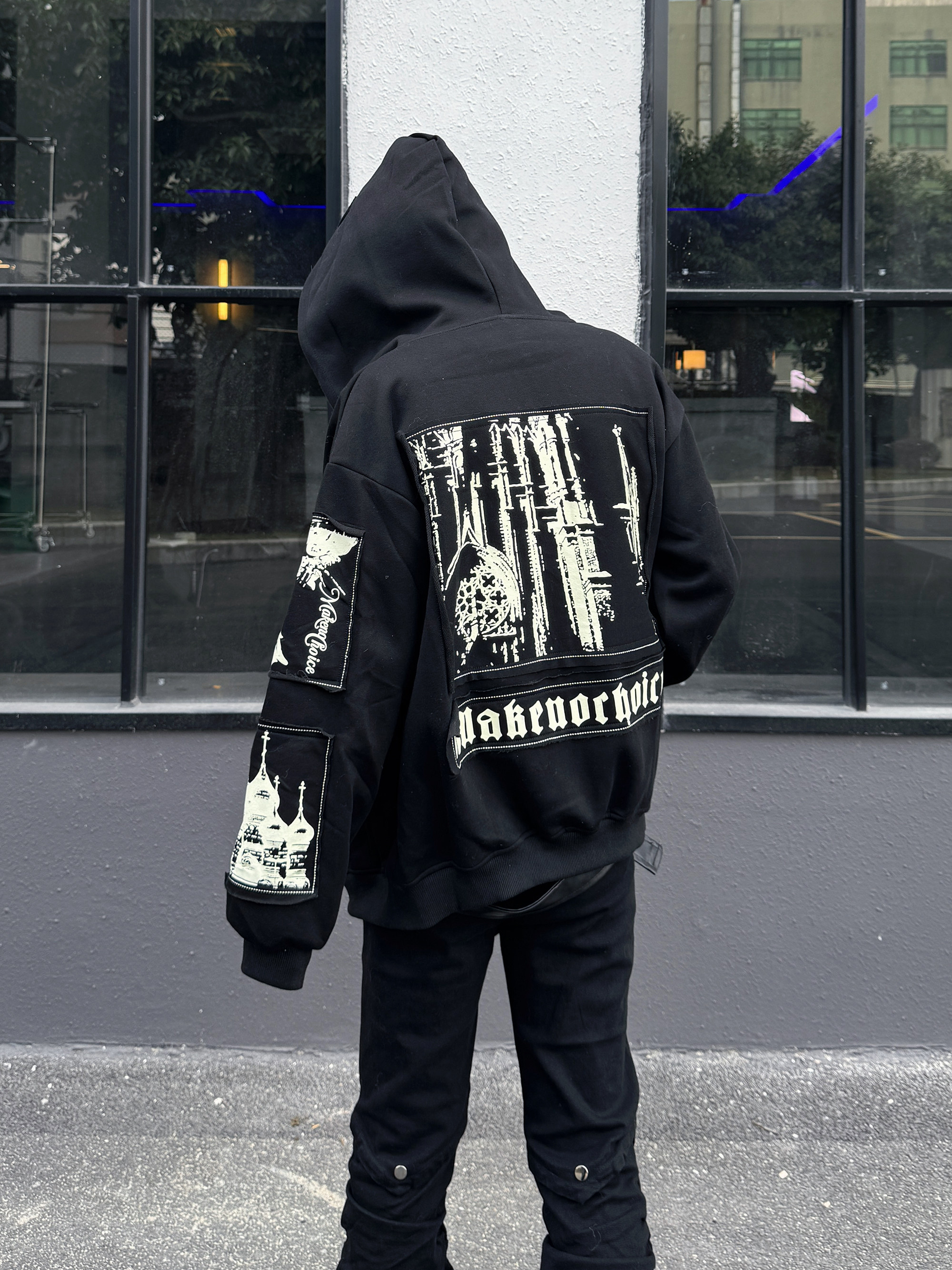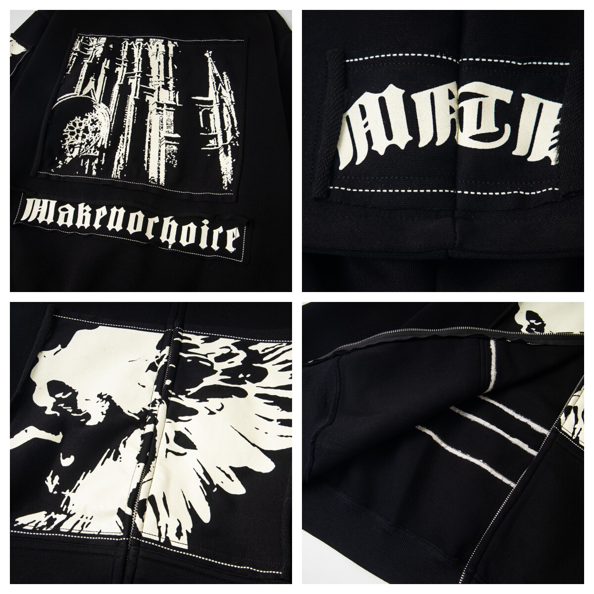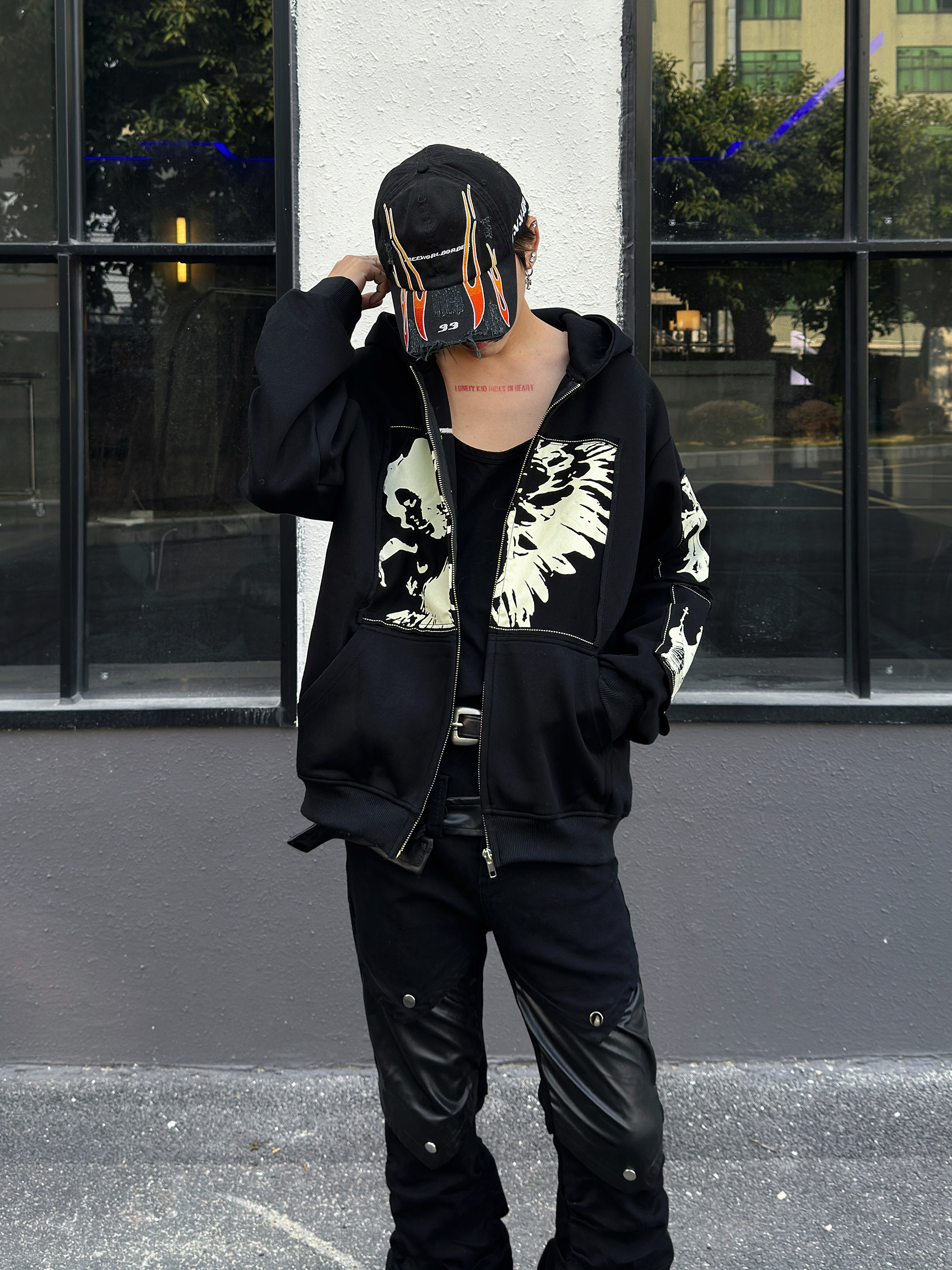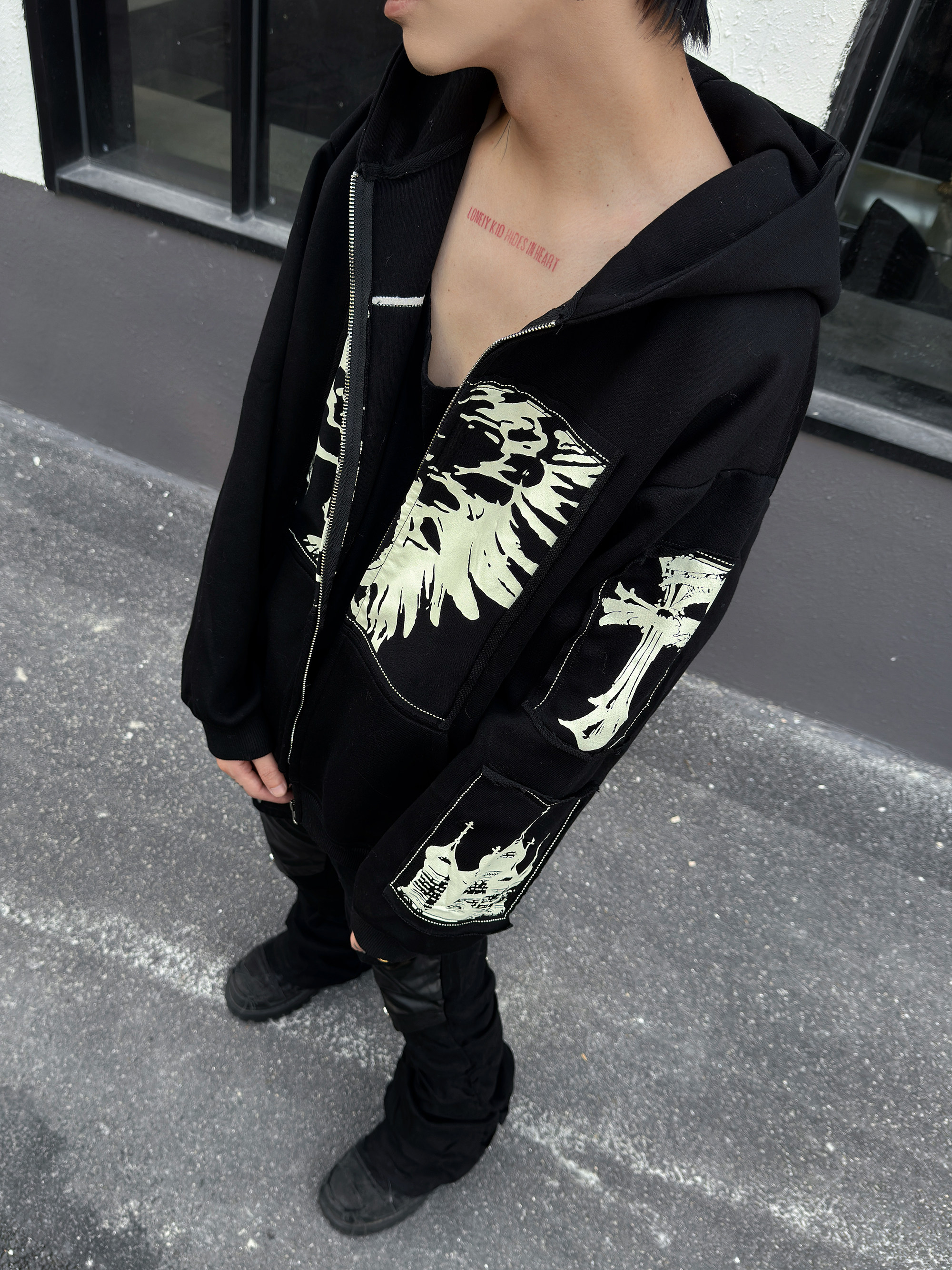 Illustration Patch Wash Damage Zipper Hoodie WN23009